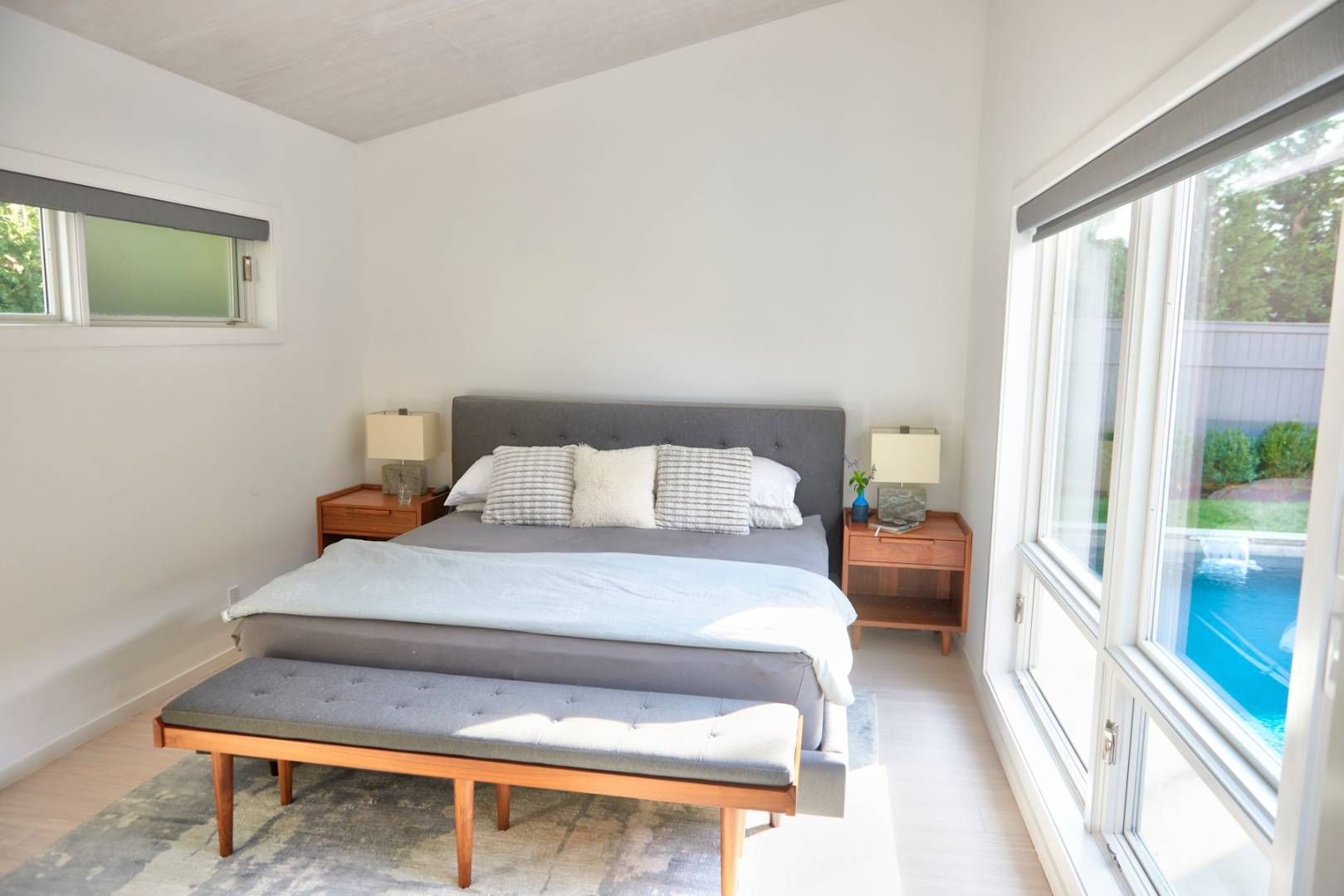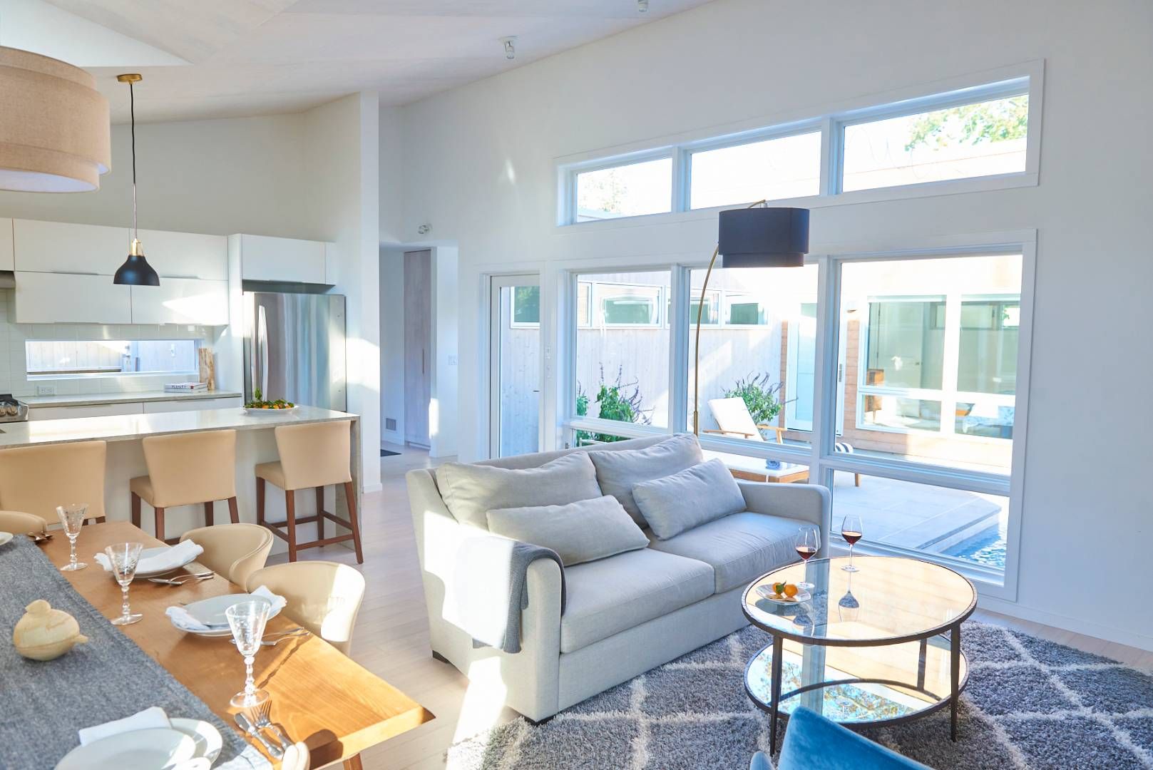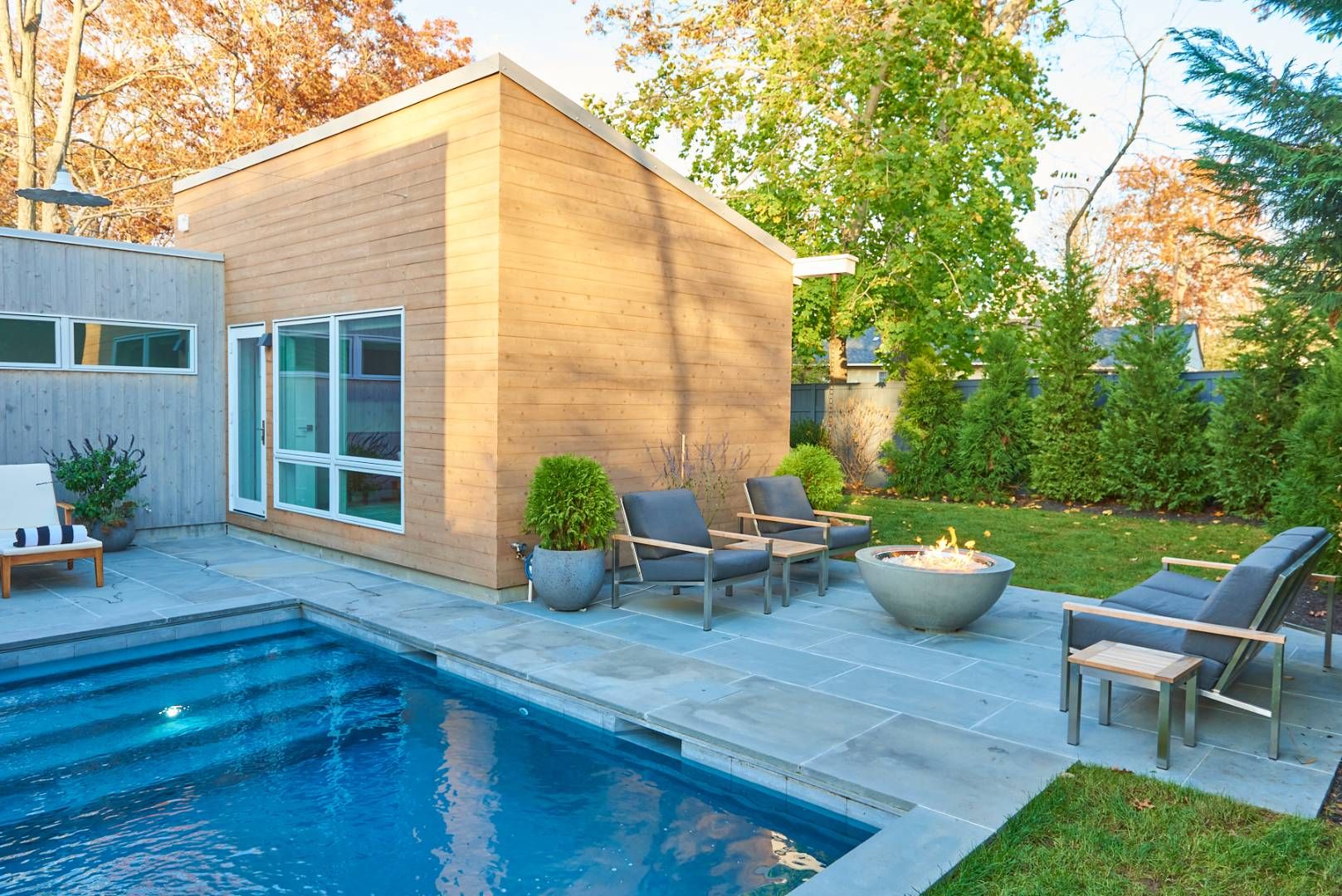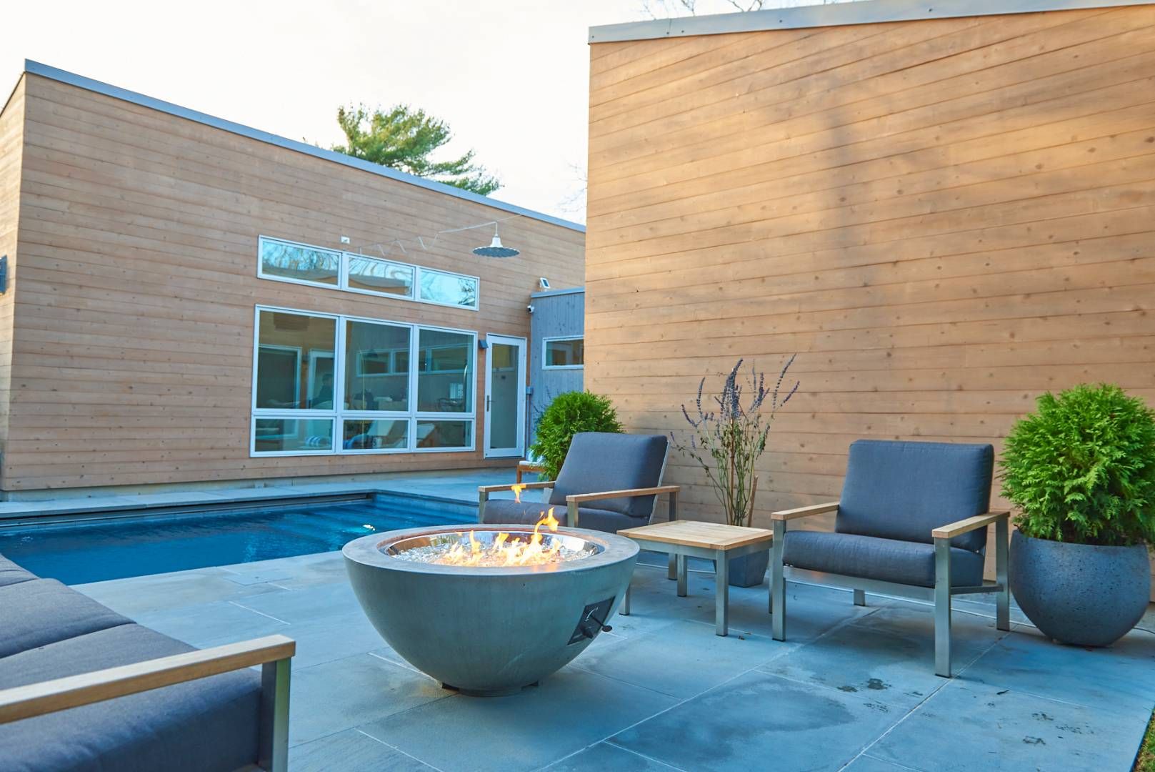 Eco modern home available for rent in Pine Neck, Sag Harbor. This light filled, 4 bedroom, 4 1/2 bathroom luxury home is designed around a sunny central courtyard area with heated saltwater, Gunite plunge pool . A wood pellet CampChef grill and contemporary seating area with fire pit, provide the perfect entertainment area set against a sophisticated backdrop of grasses, evergreens, shrubs and delicate seasonal flowers. A chic outside shower c