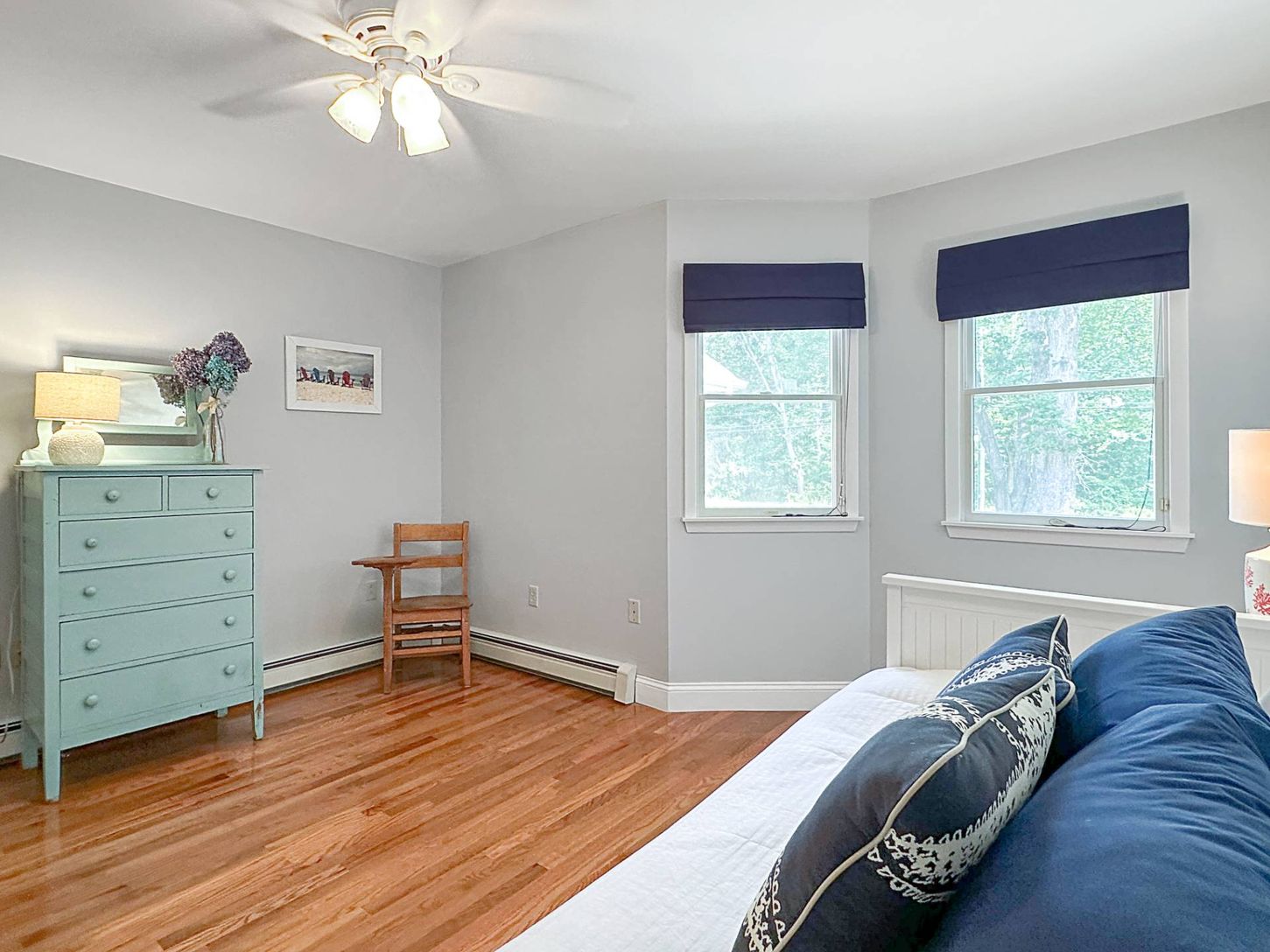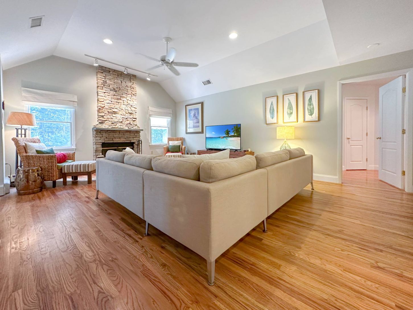 Located within close proximity of association beaches, this fresh and delightfully rambling Cape Cod style cottage is in a quiet setting on .75 level acres. Stepping foot into the entry foyer, you are invited to a comfortable living room with a Pennsylvania stone surround fireplace. This flows nicely into the kitchen-dining area, which has a breakfast bar and loads of natural light, as well as access to the rear entertainment deck. To one side