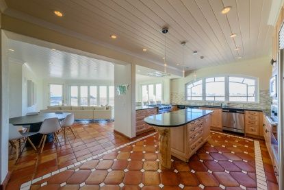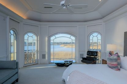 The 6,500 +/- sq. ft. home is set on a massive 2.73 +/- acres on Mecox Bay, offers an open floor plan, six en suite bedrooms, a gourmet kitchen, a formal dining room, a pair of fireplaces and an enclosed sunroom off the kitchen. All designed to highlight the natural beauty of Mecox Bay. The exterior includes a massive 3100 +/- sq. ft. wrap-around mahogany deck, "glorious landscaping," a professional barbecue area and the requisite gunite pool