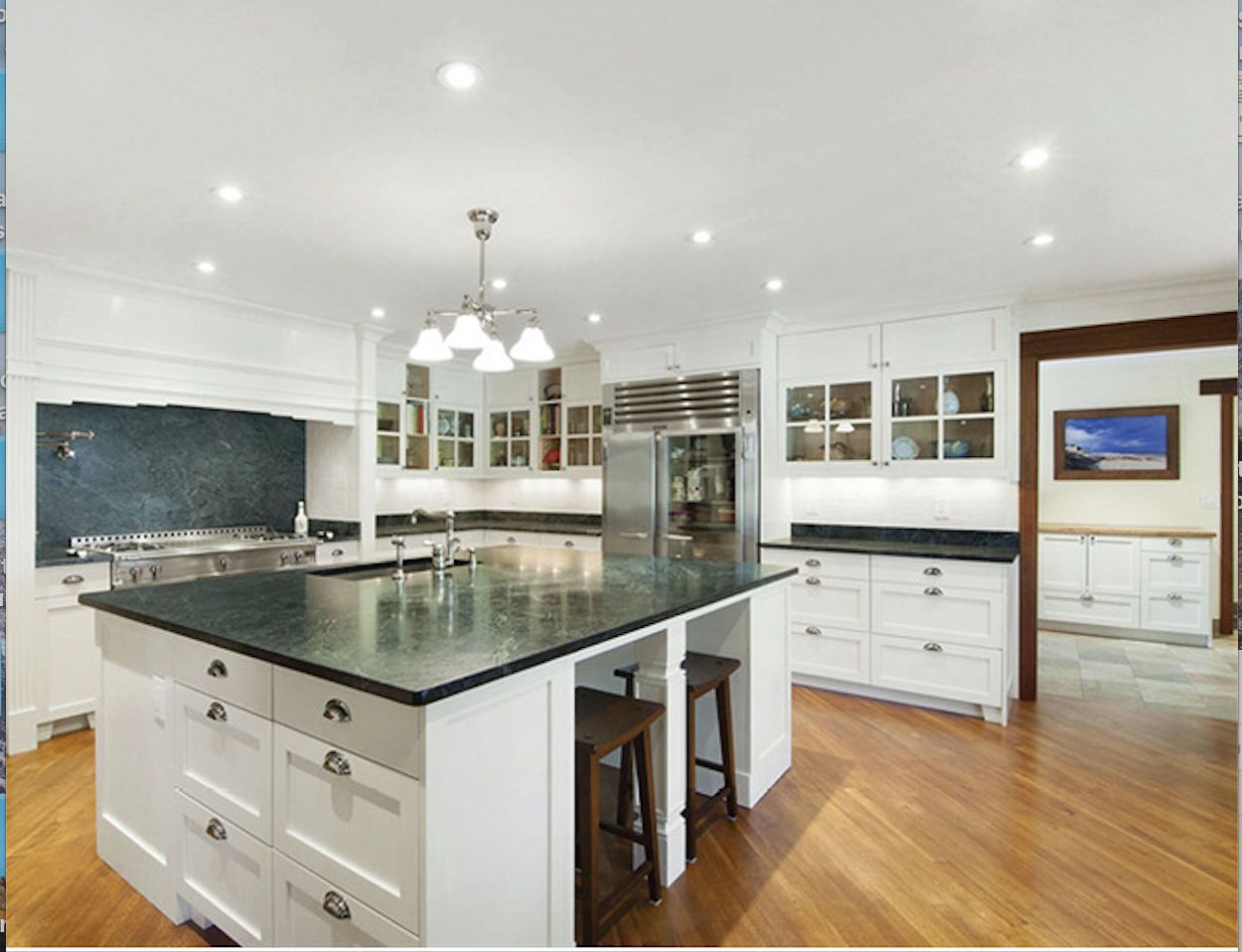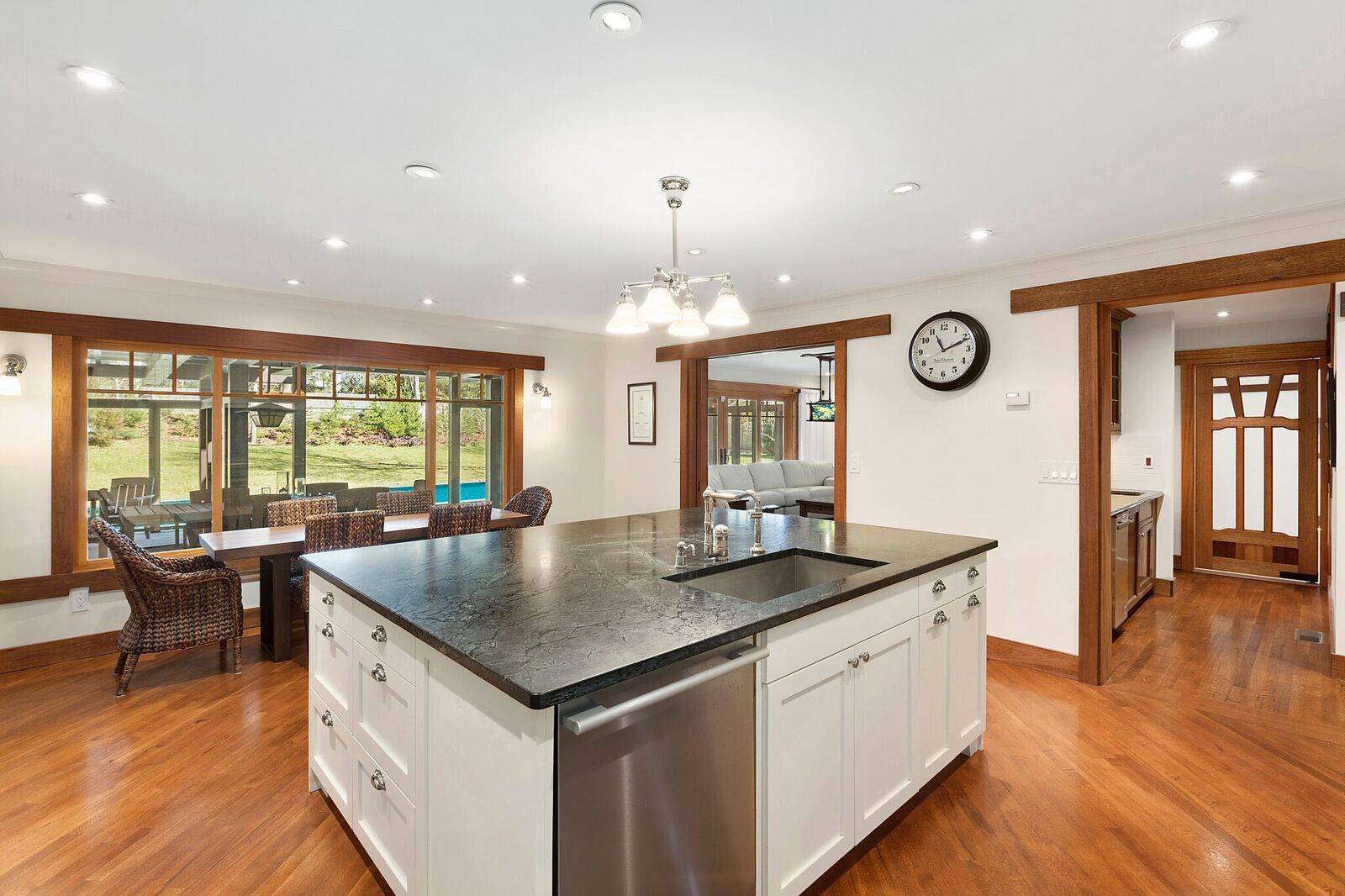 This home boasts a sun drenched sunken living room/dining room, cozy den/media room, chef's kitchen with huge center island and full butler's pantry with a second dishwasher, ice machine, and coffee station. Off of the kitchen is the breeze way laundry area and office workspace, which leads to a separate and very private guest suite. There are five generous bedrooms, 4 full bathrooms and 2 half bathrooms. All bedrooms access outdoor decks over