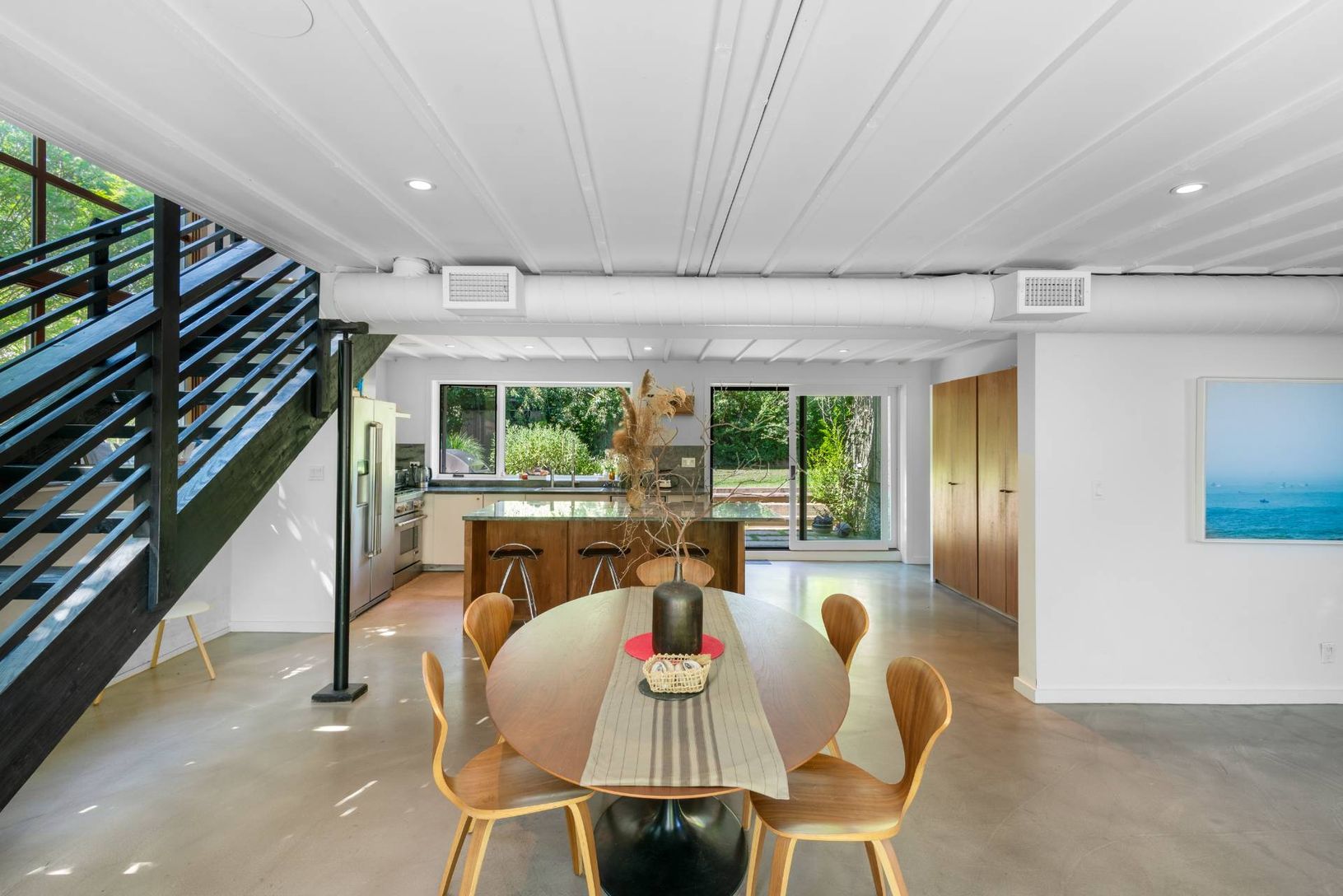 This beautifully renovated Ditch Plains retreat was taken down to the studs in 2018 and rebuilt with a bright, open design perfect for coastal living. The main level features a welcoming living room with a fireplace, a sunlit kitchen, a full bathroom, and a convenient laundry room. Upstairs, a cozy den opens to the spacious primary suite, complete with a walk-in closet, spa-like bathroom with dual sinks and a glass-enclosed shower, and a priva