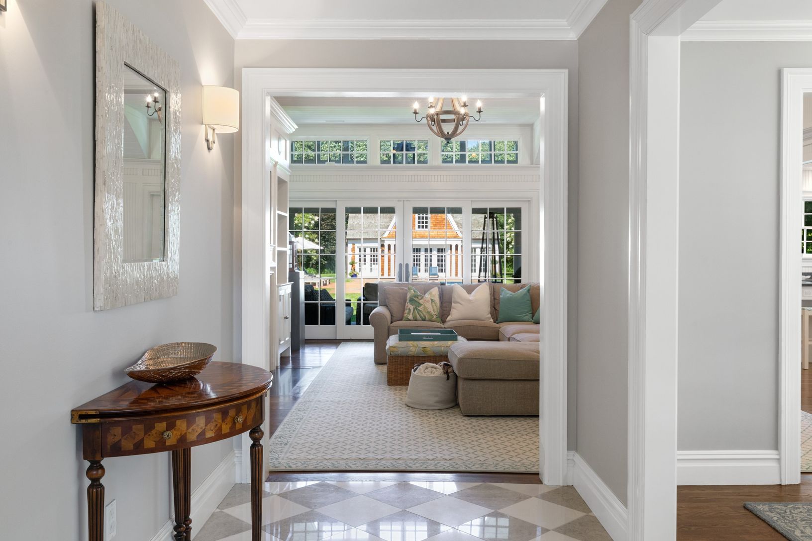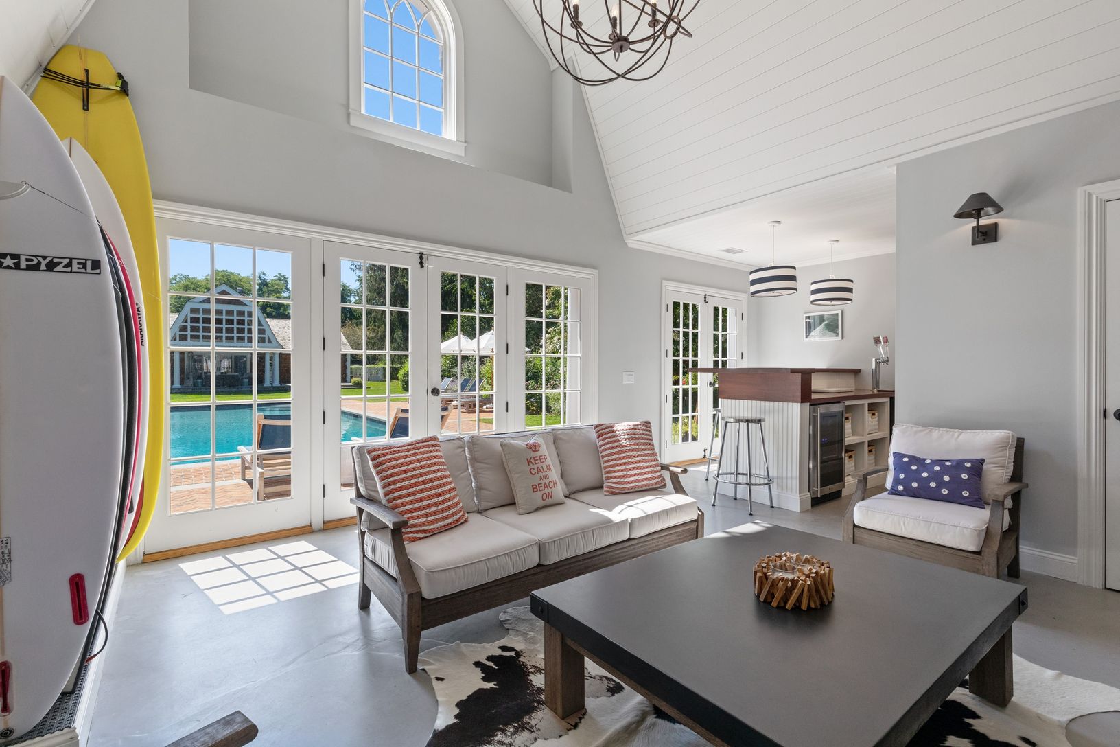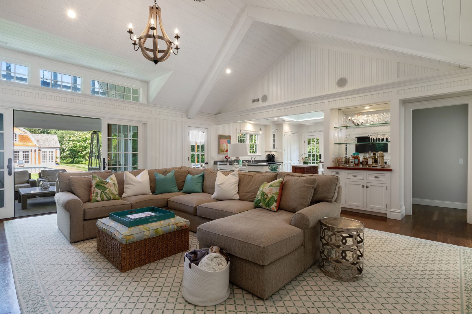 From the moment you drive up to this home you will see the attention to detail with the iron dutch door that is flanked by two reclaimed stain glass windows. Enter into a foyer where Hollywood details flow seamlessly into a crisp Hampton beach house and a view out to the beautiful yard and 800 sq. ft. pool house. The living room has a vaulted ceiling with custom built ins, fire place and an open flow to a gourmet kitchen with an abundance of n