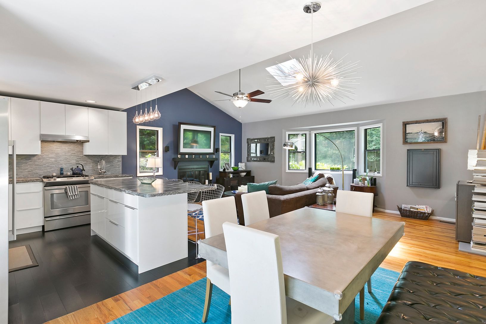 At the end of a quiet road, this renovated contemporary cottage is turn key with room for a pool. Geothermal heating/ac keeps the house comfortable year round. Walkout basement adds more space for storage and easy living space.