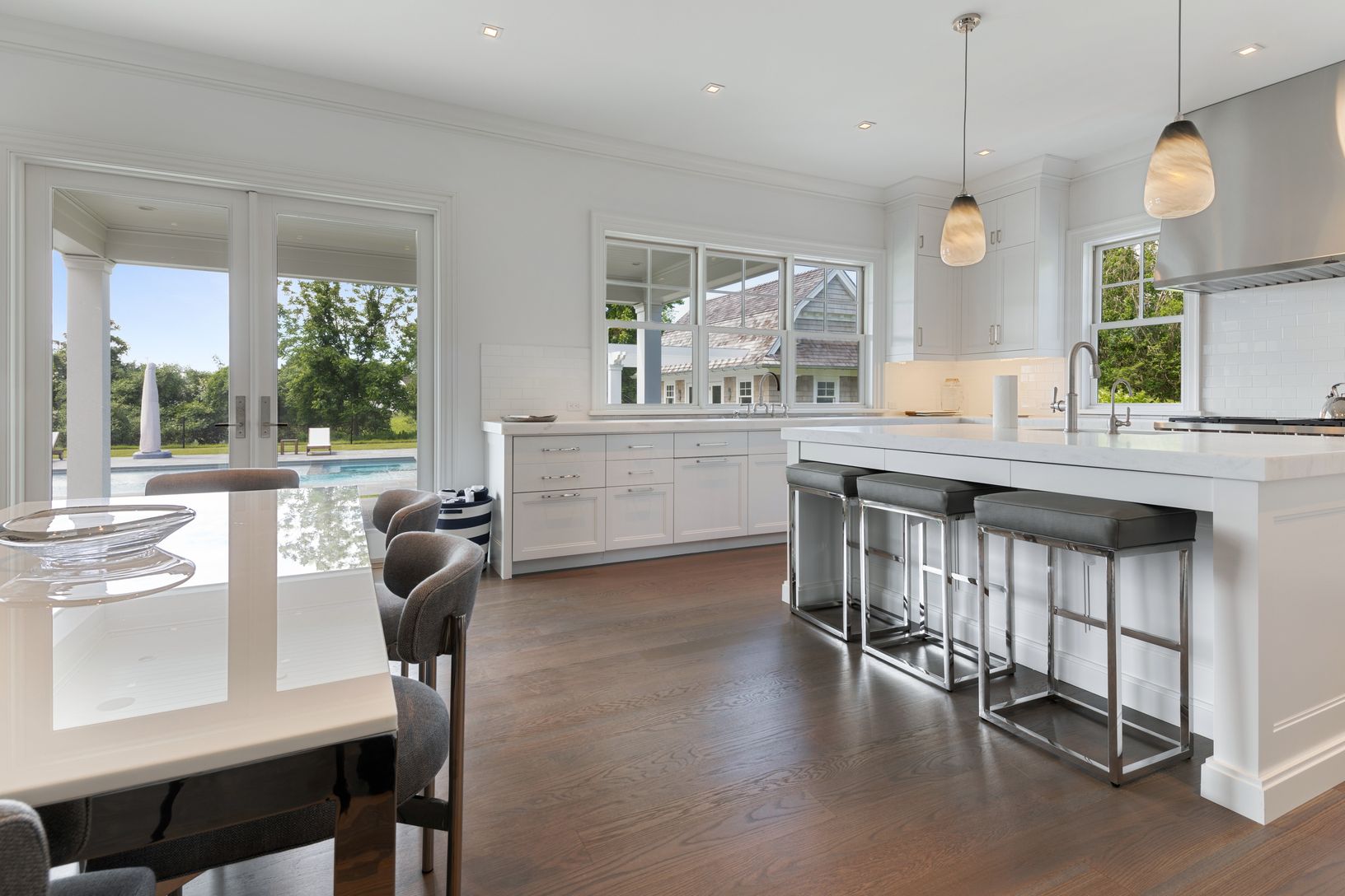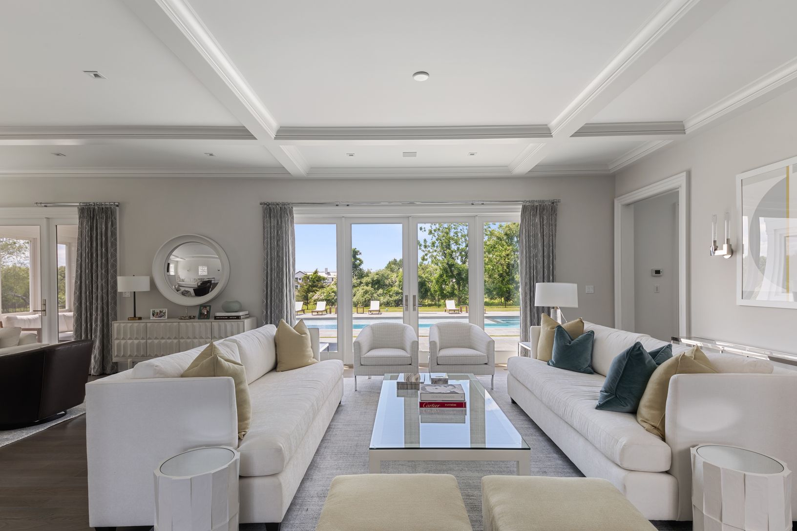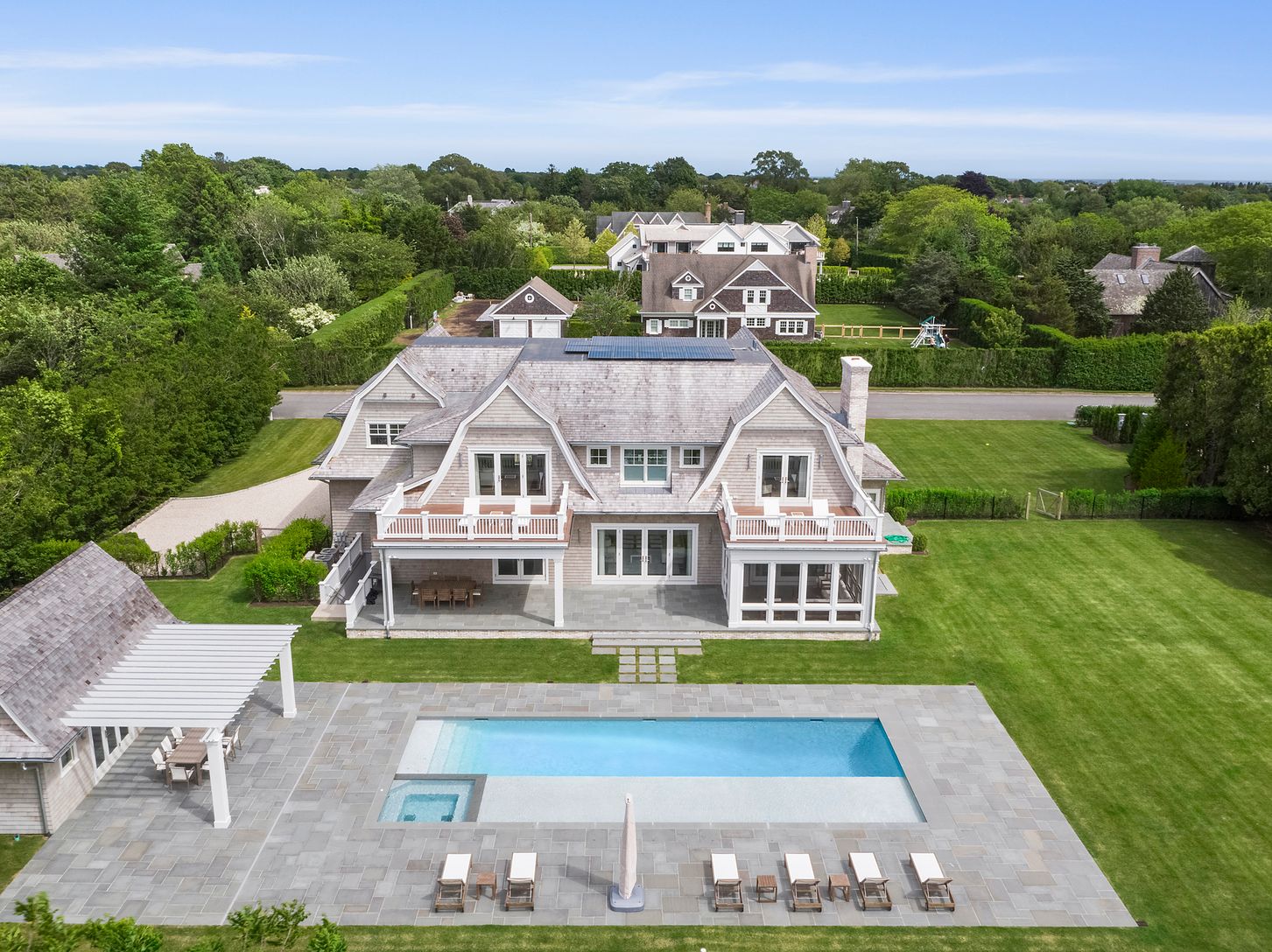 In a premier Water Mill south location, this newly built, stunning custom home blends the finest materials and finishes with superb indoor and outdoor amenities on a private shy acre overlooking reserve to offer the ultimate in Hamptons living for any season. Built to the highest standards by Farrell, the main residence offers 8 bedrooms, 8 full/1 half baths, on three finished levels. Offered fully furnished with design and furnishings by Mitc