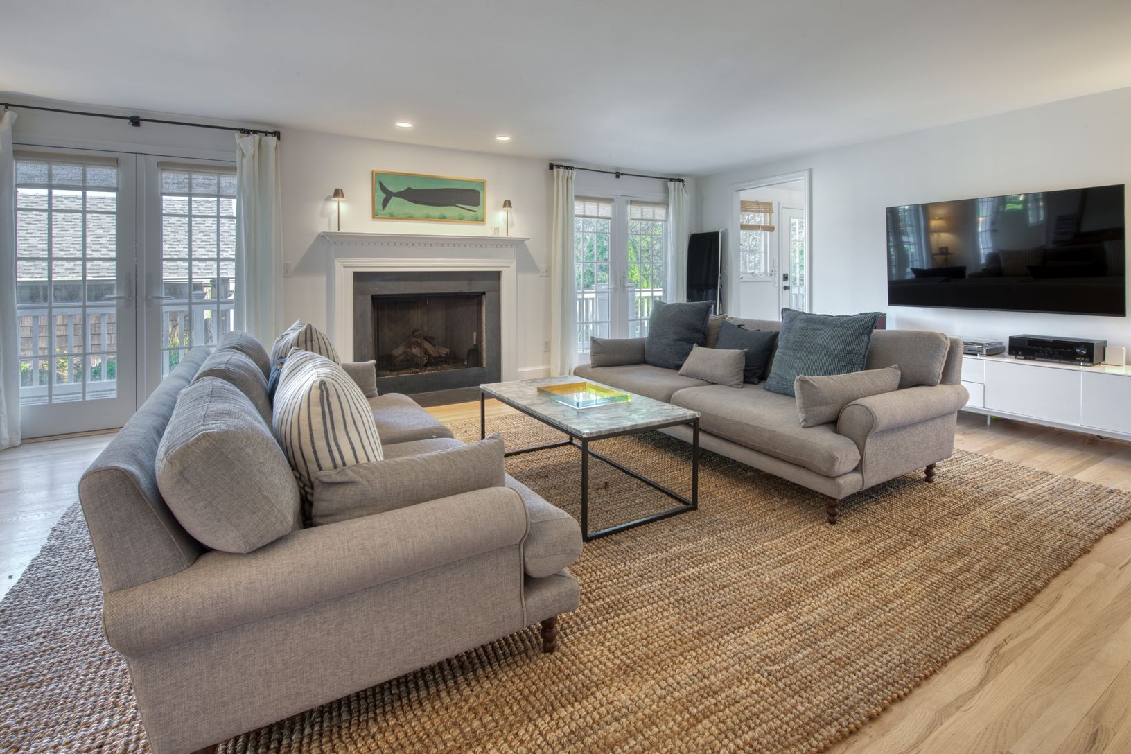 Welcome to 30 Lighthouse Lane, a delightful Sag Harbor haven that marries relaxation with functionality. This expansive home boasts 5 bedrooms, all thoughtfully designed for comfort, along with a versatile office space that doubles as a fifth bedroom with a plush pull-out sofa. The living room invites you to unwind, featuring a 60-inch smart TV and a cozy gas fireplace, seamlessly transitioning into an open-plan country kitchen. Culinary enthu