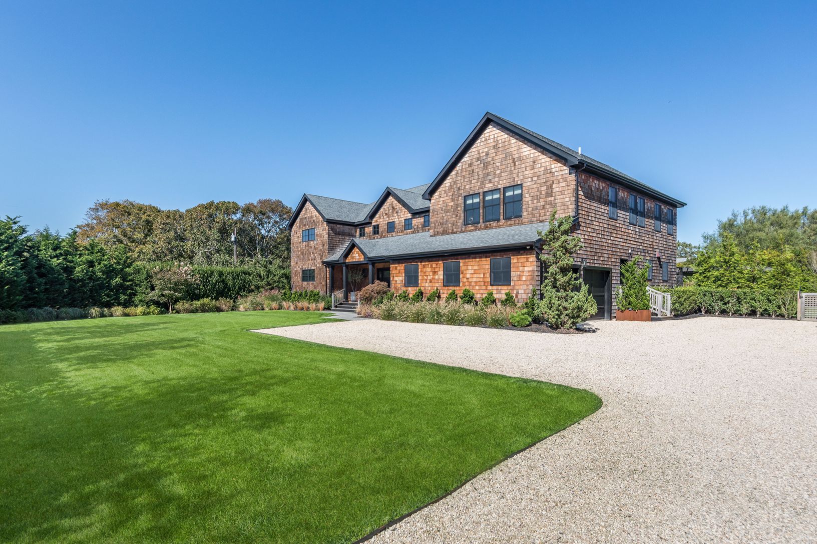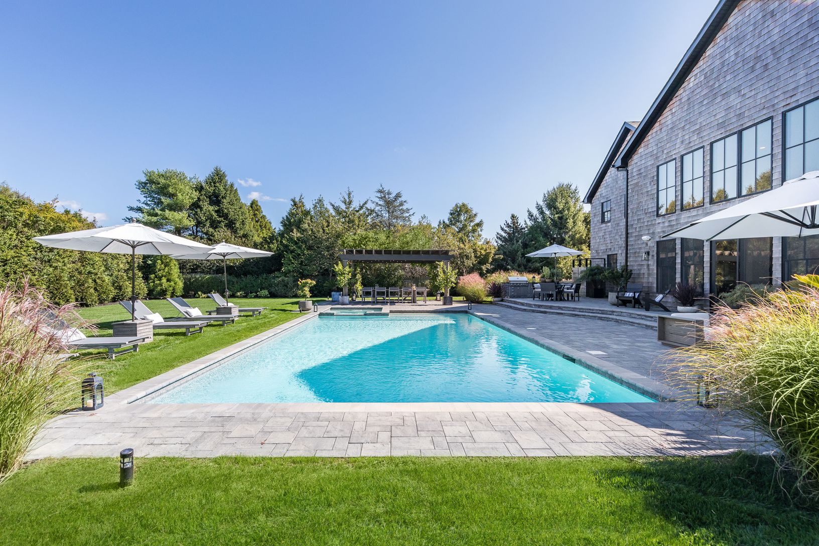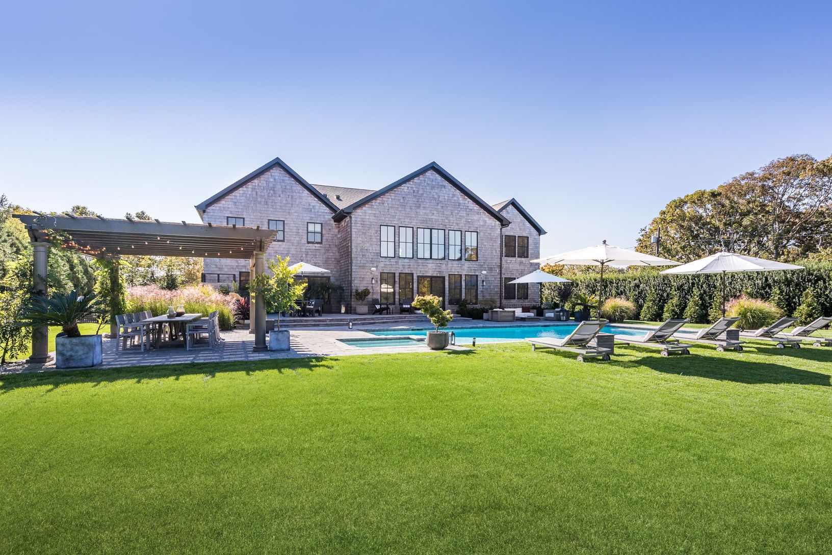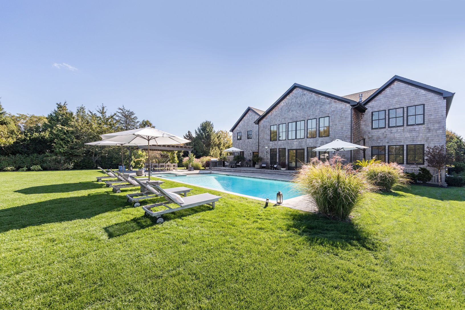 Enjoy summer days at this sophisticated, Southampton contemporary retreat. This luxurious, beautifully decorated home offers easy open concept living. As you enter the 1st floor into a stunning light filled, 2 story great room showcasing a wall of windows, open dining area, gourmet kitchen, cozy media room, all overlooking the lush grounds. Featuring 5 spacious ensuite bedrooms, including your choice of master suites on both the 1st and 2nd fl