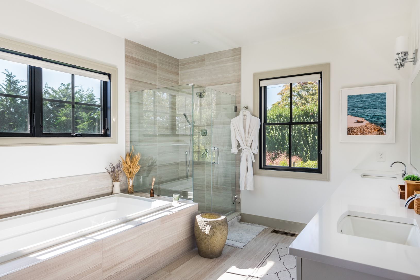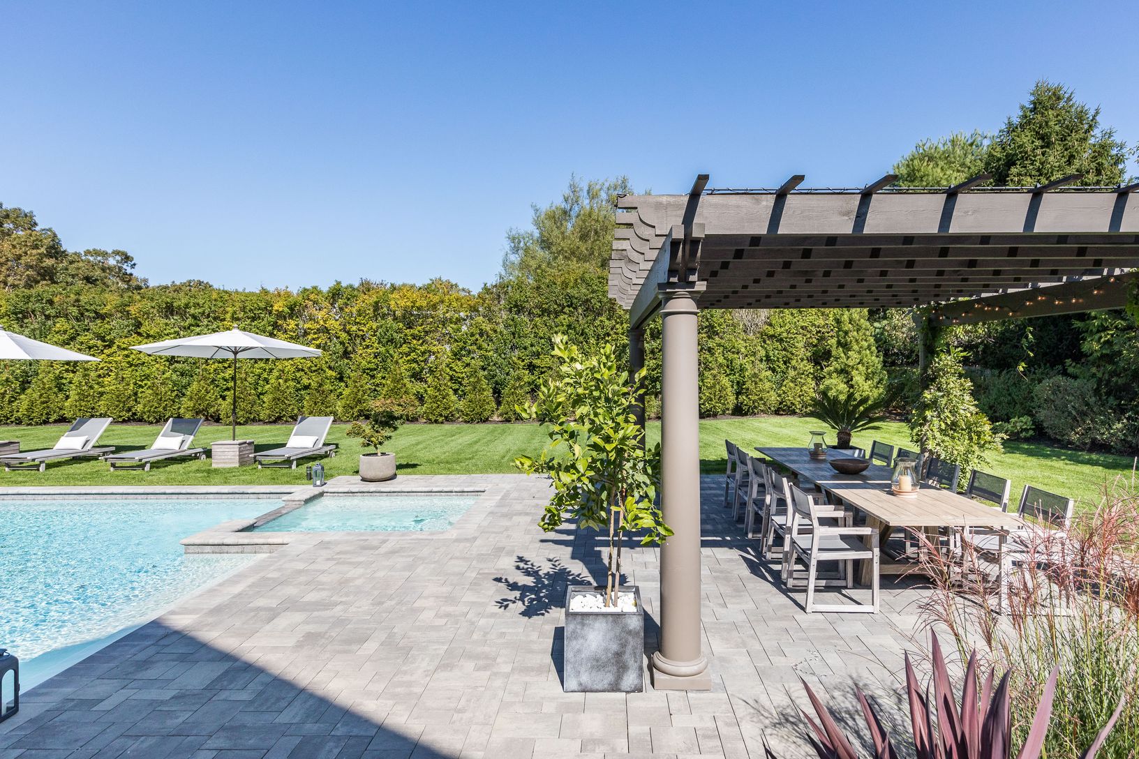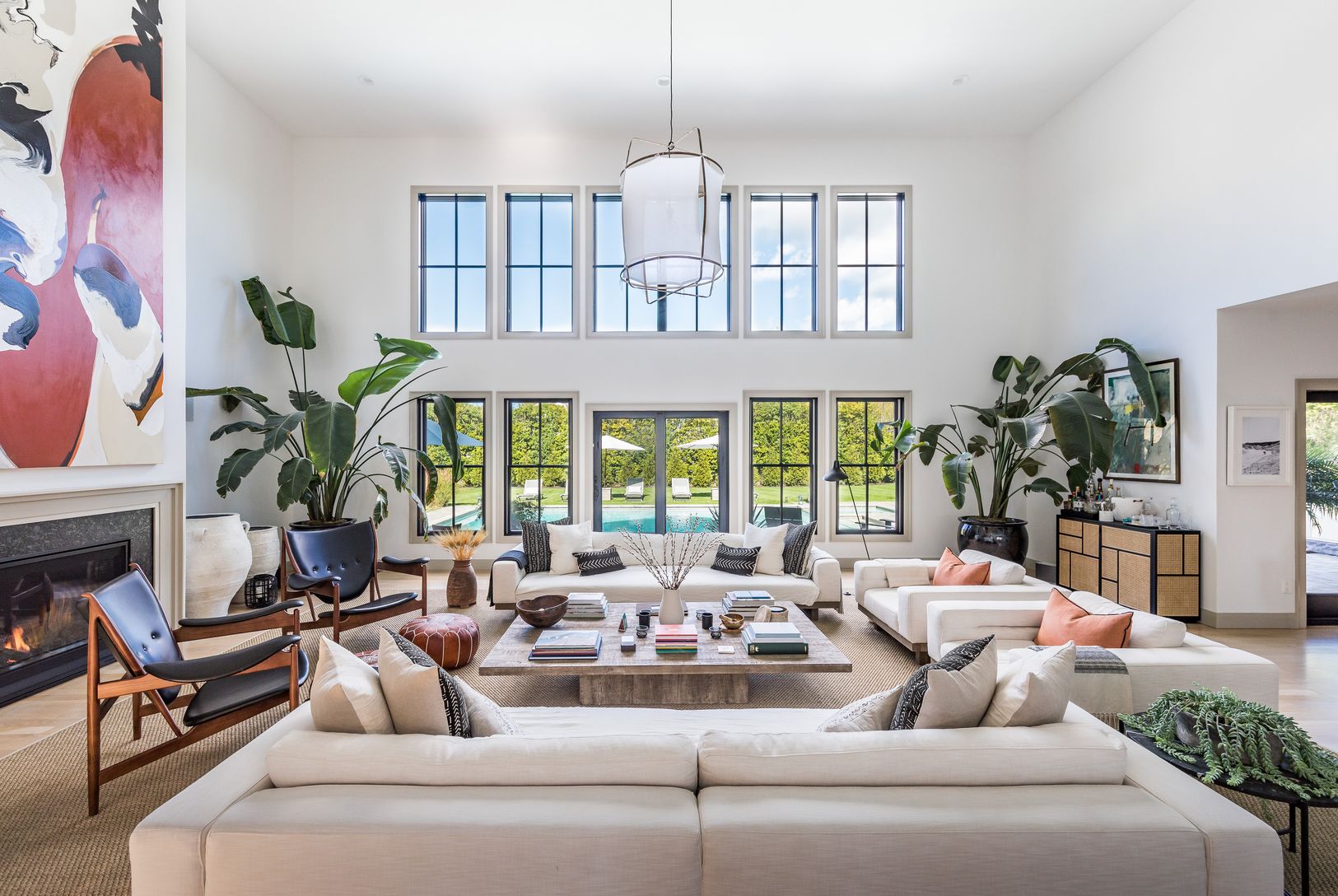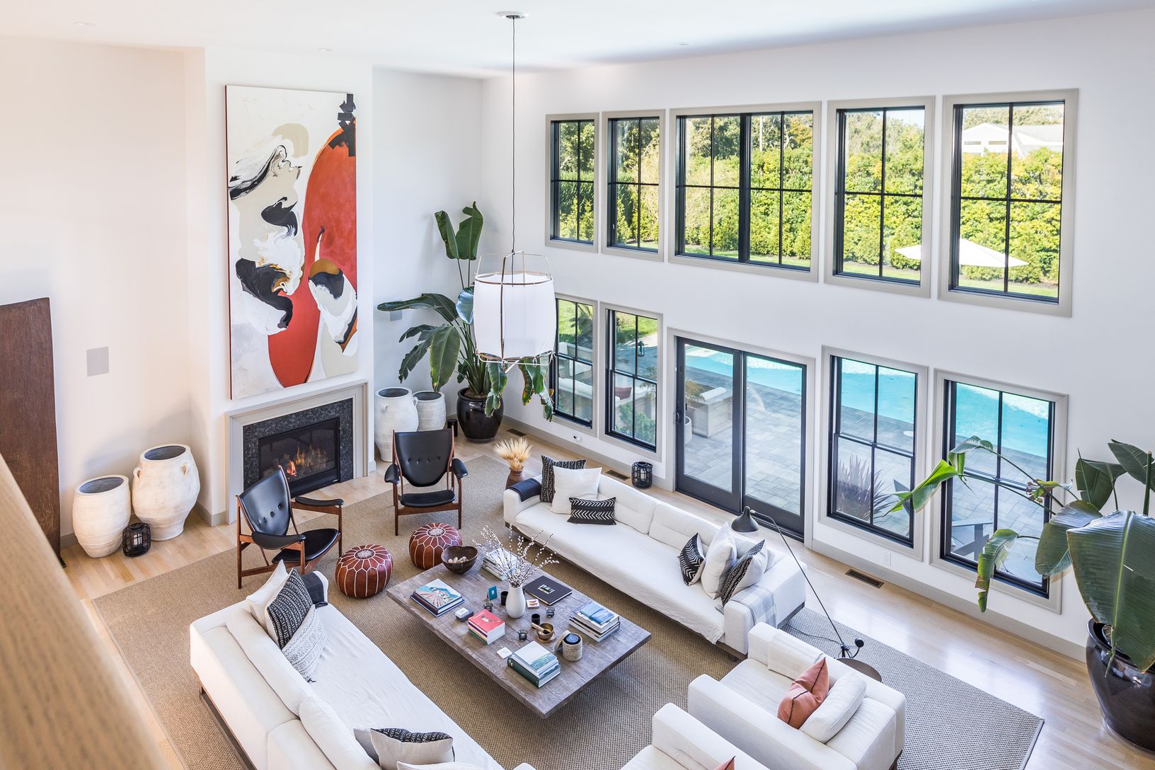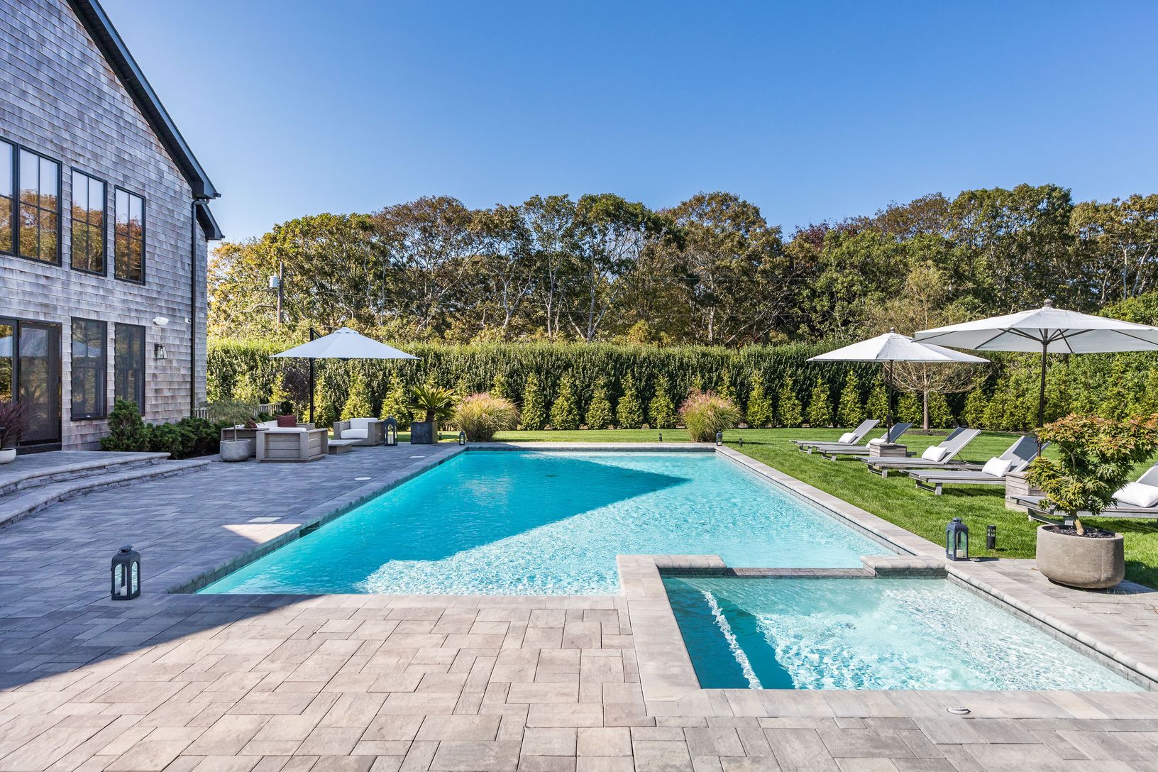 Enjoy summer days at this sophisticated, Southampton contemporary retreat. This luxurious, beautifully decorated home offers easy open concept living. As you enter the 1st floor into a stunning light filled, 2 story great room showcasing a wall of windows, open dining area, gourmet kitchen, cozy media room, all overlooking the lush grounds. Featuring 5 spacious ensuite bedrooms, including your choice of master suites on both the 1st and 2nd fl