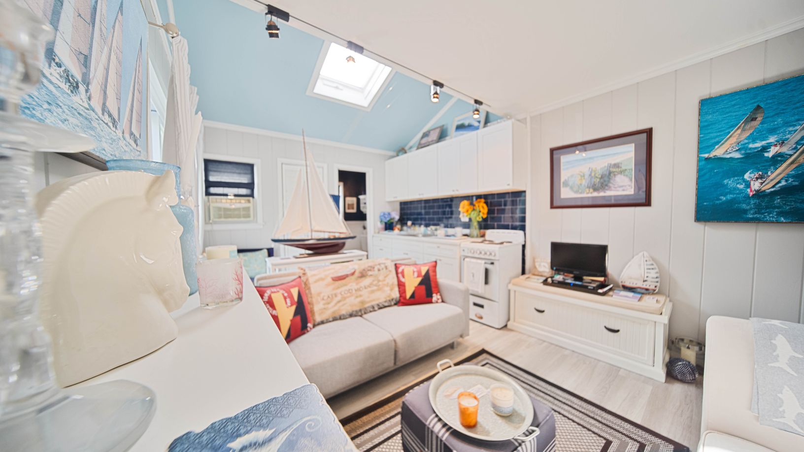 Discover effortless Hamptons living in this sunlit studio retreat perfectly positioned south of the highway in Hampton Bays, just moments from Tiana Bay. Designed with a timeless coastal aesthetic, this bright and airy residence blends comfort and style in every detail. The open-concept layout is filled with natural light, featuring vaulted ceilings with a skylight, wide-plank flooring, and soft seaside hues that create a relaxed, breezy atmos