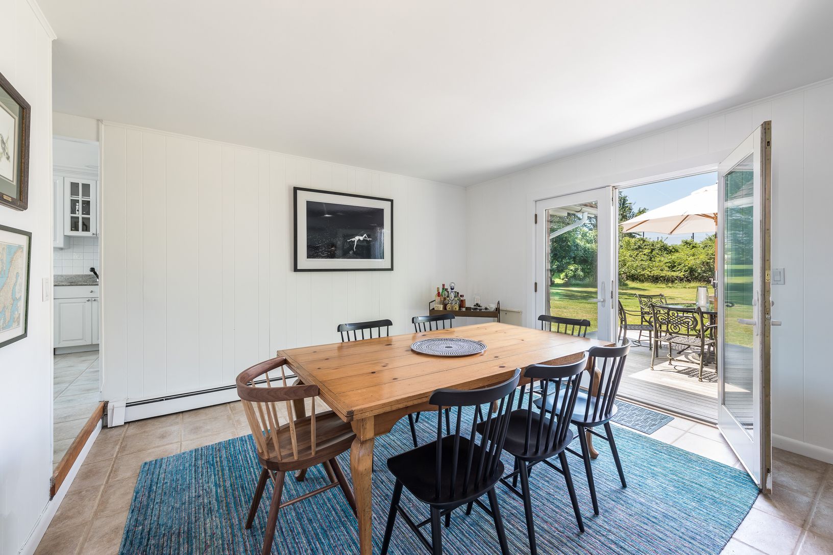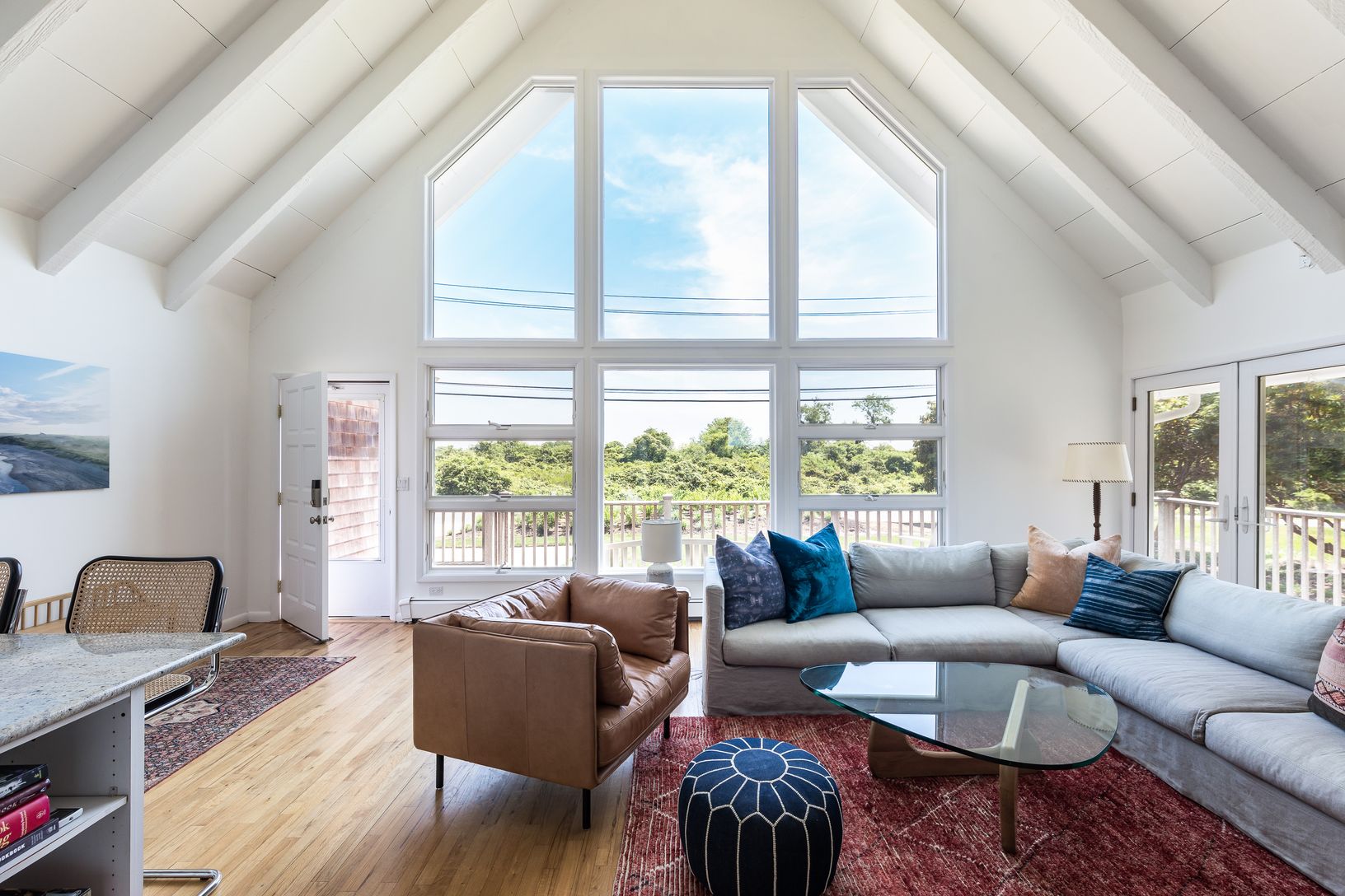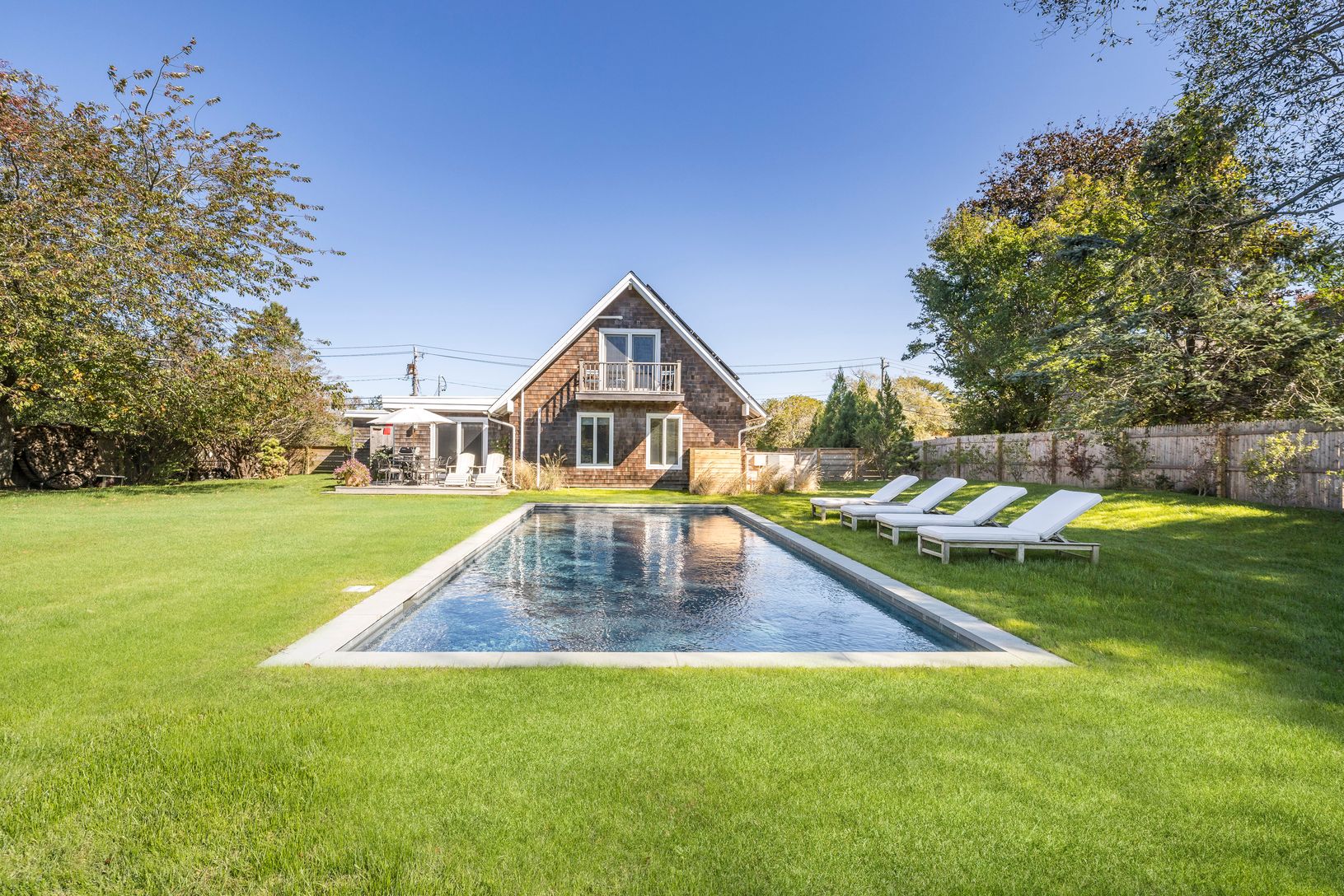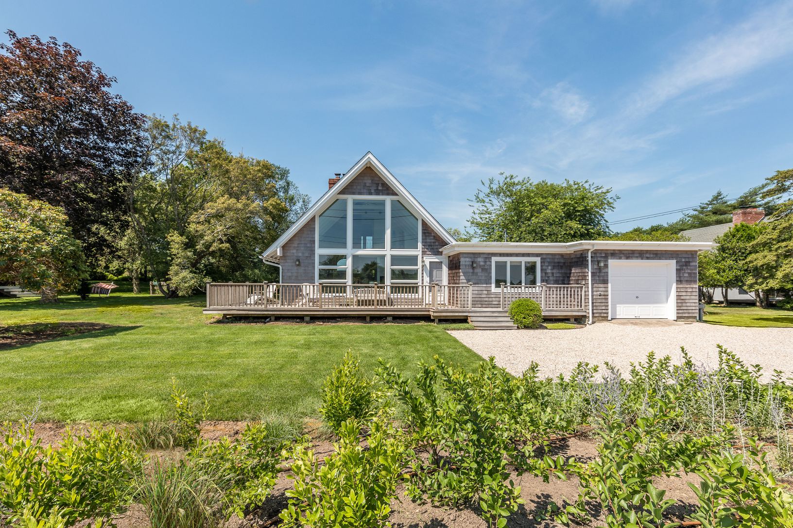 Three-bedroom, two and a half bathroom A-frame bungalow on Montauk Downs Golf Course. Window filled and fully updated, this private residence sits on over half an acre. This graciously sized home is broken down between two stories. Upon entry to the lower level you're met with a large living room. Kitchen with granite countertops, stainless steel appliances and pantry. A separate dining room opens up to a patio with outdoor dining that overloo