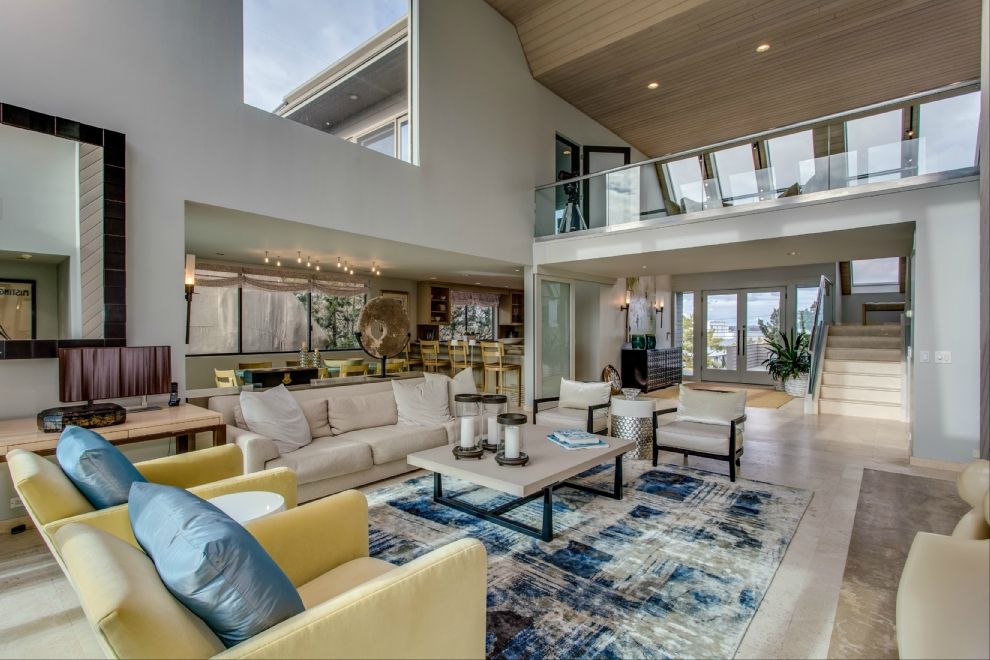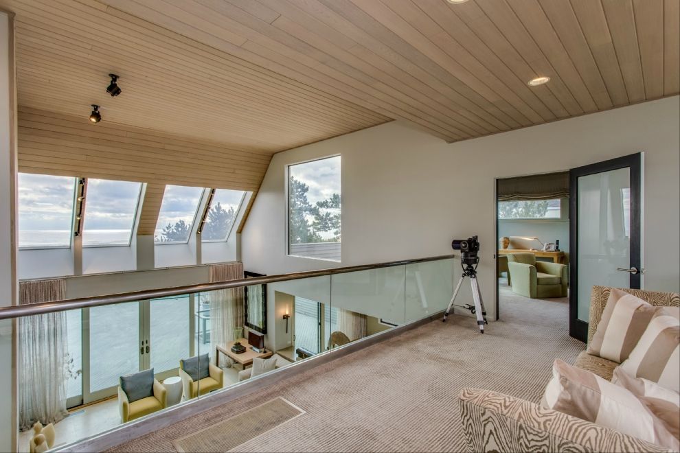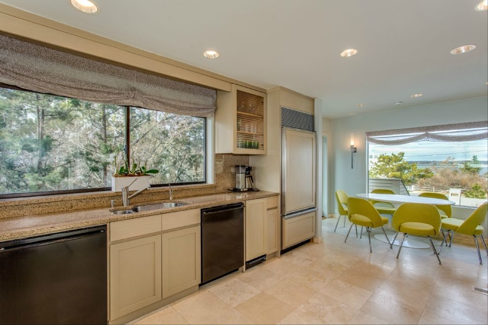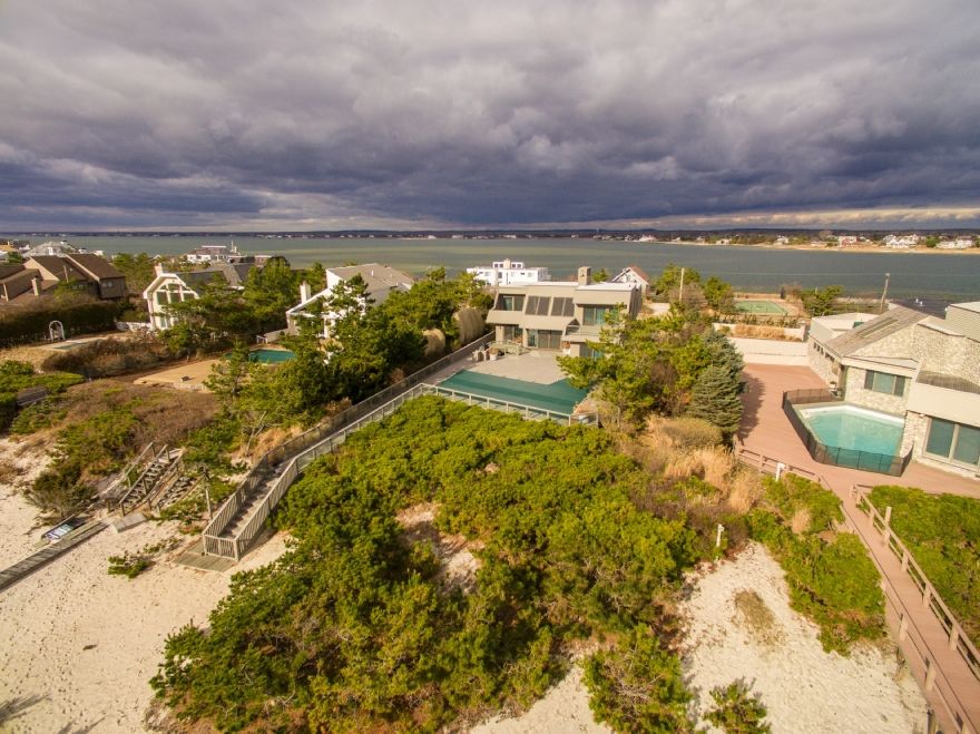 303 Dune Road, a renovated and beautiful contemporary with three levels of exquisite living. Basement level has a gym and sauna, and wet bar. Main level has a state of the art kitchen dining area and living room with ocean and bay views and four bedrooms and three baths. The top floor has a master bedroom with ocean view and classic marble bath. An adjacent room has a den with views of bay and ocean. Top two levels have decks with ocean and ba