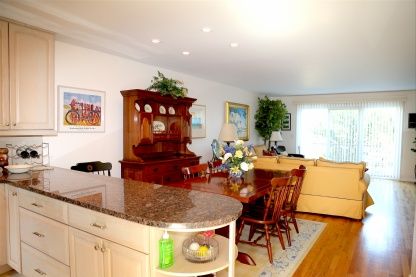 Westhampton Beach Village two bedroom, three full bath renovated condo. The first level open floor plan has an updated kitchen, dining area and spacious living room with a walk out deck. The second floor has a nice master with an updated bath, guest bedroom and second full bath. The finished lower level has a full updated bath, laundry room and a media area with nice built-ins with a desk and a walk out to the patio for grilling. The comple