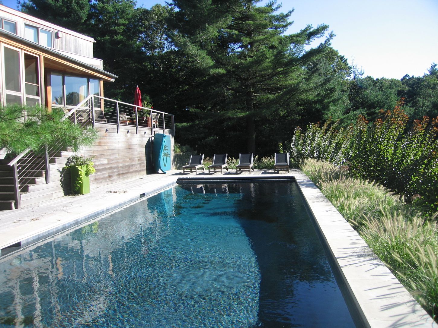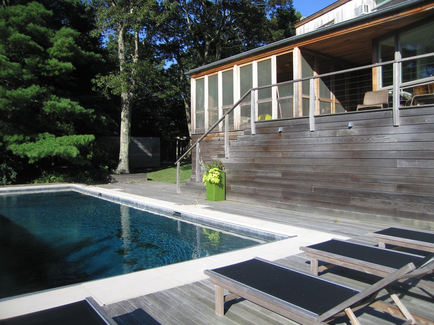 Perched up high, this 2-story modern contemporary in the Northwest Woods has a superb tree top view. Sleek clean lines with big glass windows showcase the beautiful heated pool and stunning wooded 2.71 acres. The large chefs kitchen and great room with a wood burning fireplace allow for friendly gatherings in all seasons of the year. Located outside the Village of East Hampton this 4 bedroom, 4 bath modern home is convenient to all of the Vill