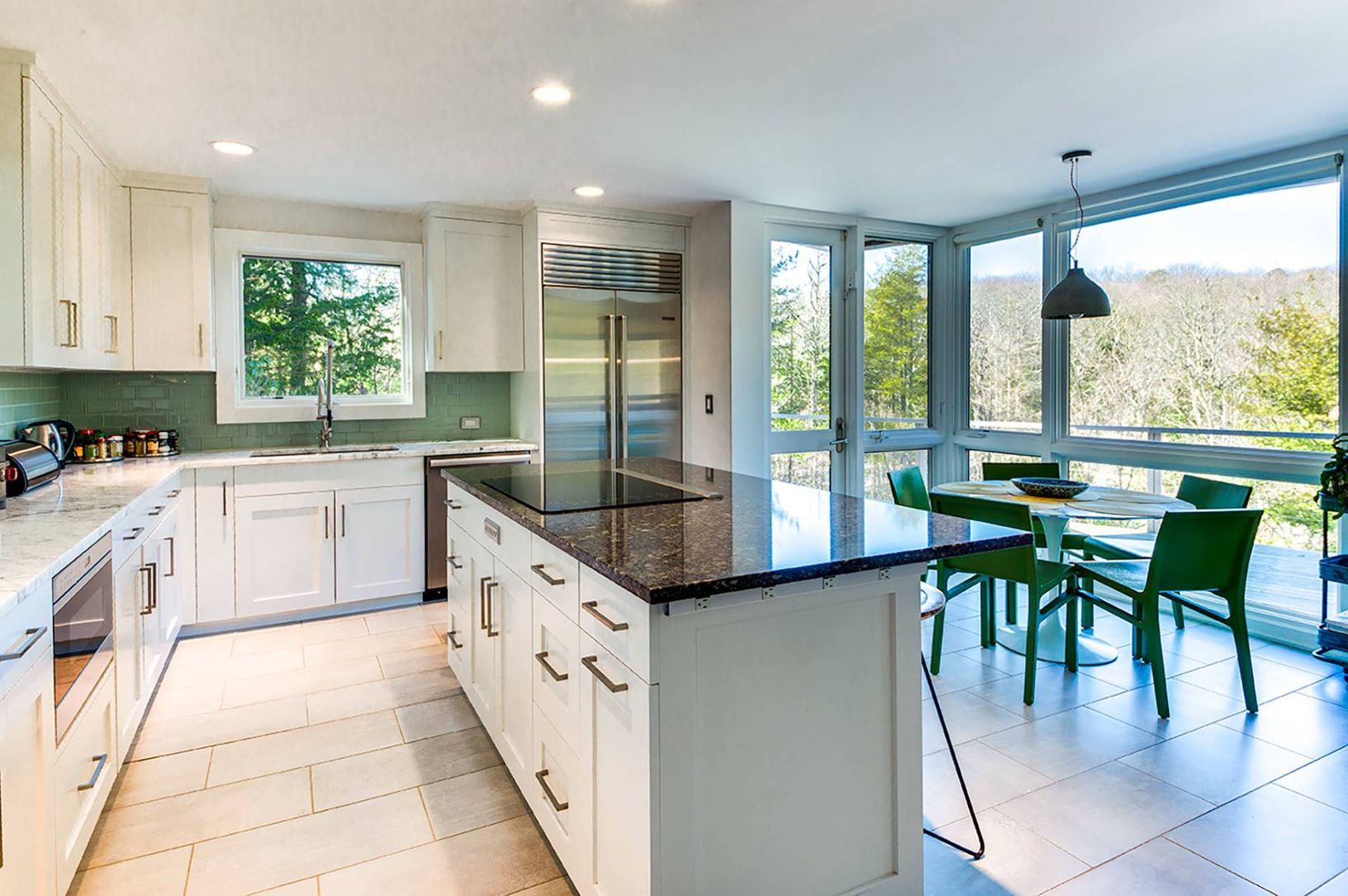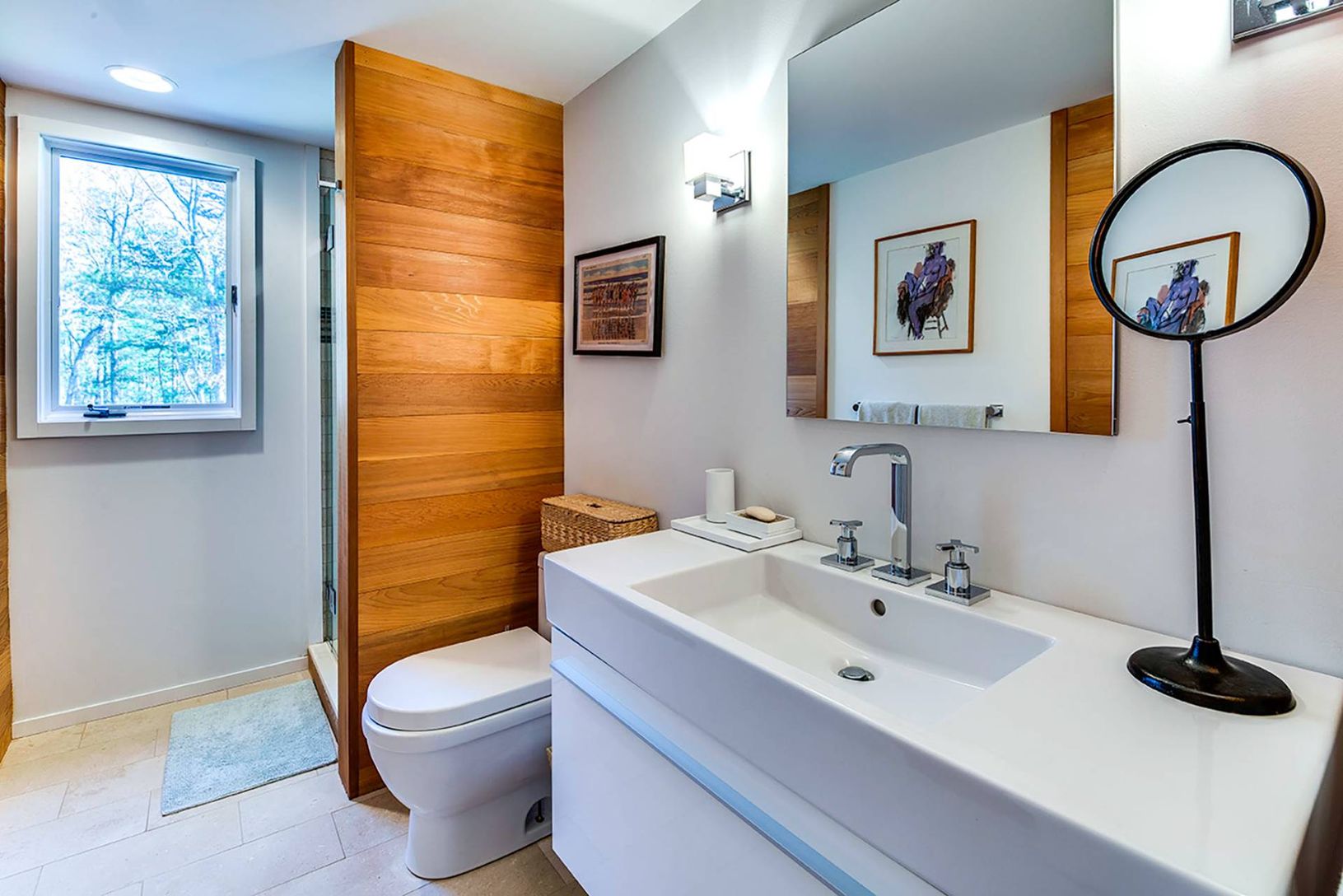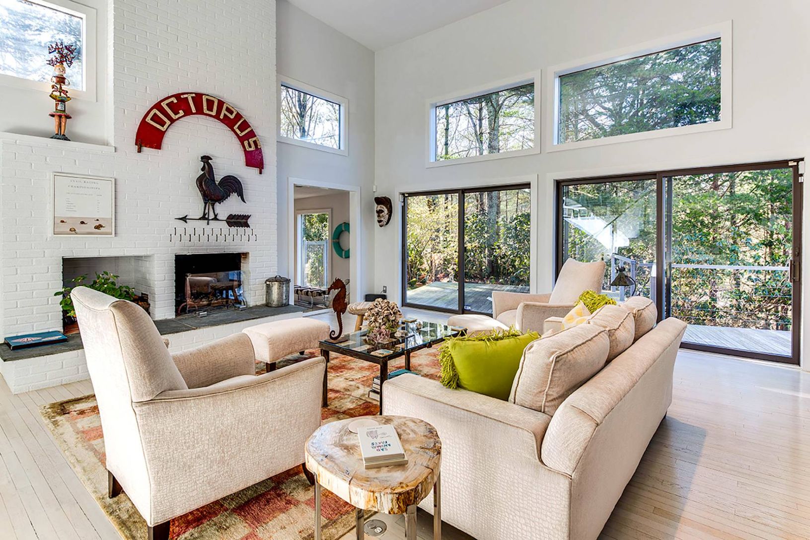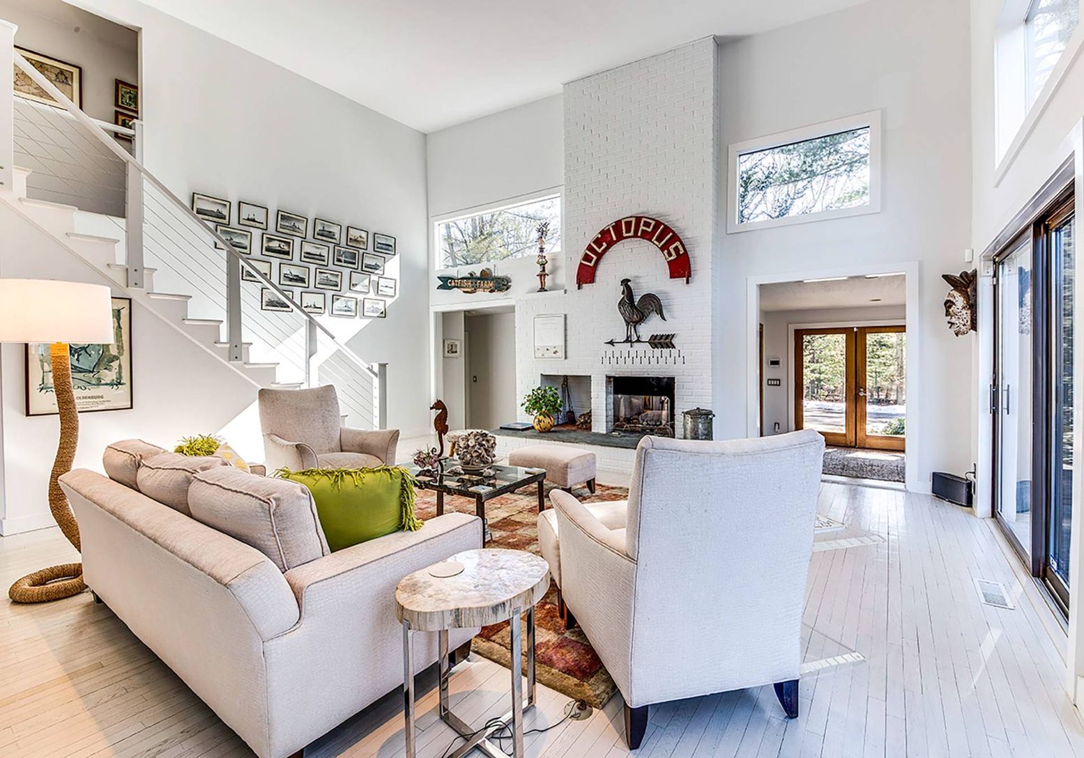 Up a long private drive sits this 2-story modern contemporary oasis minutes to East Hampton Village. The home features 4 bedrooms, three bathrooms, and dramatic glass windows surrounded by canopy views offering serene privacy. Renovated with sleek, clean lines, it offers a heated gunite pool and spa, with ample lounging, on a stunning 2.71-acre wooded lot. The interior flows into the expansive outdoor deck, which features a dining table and se