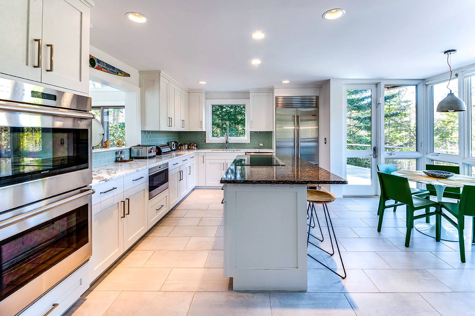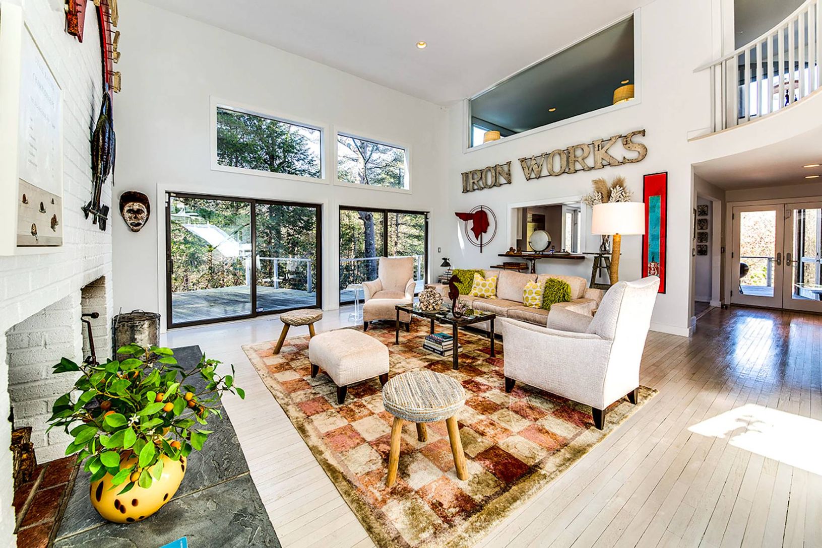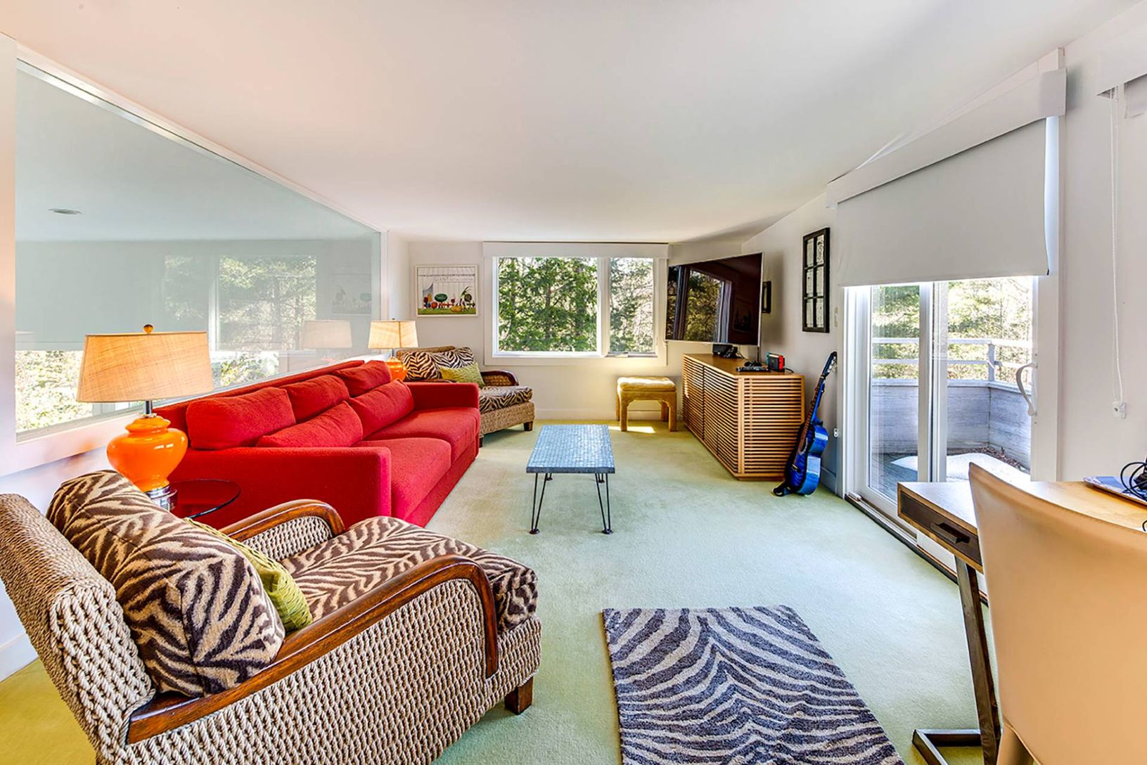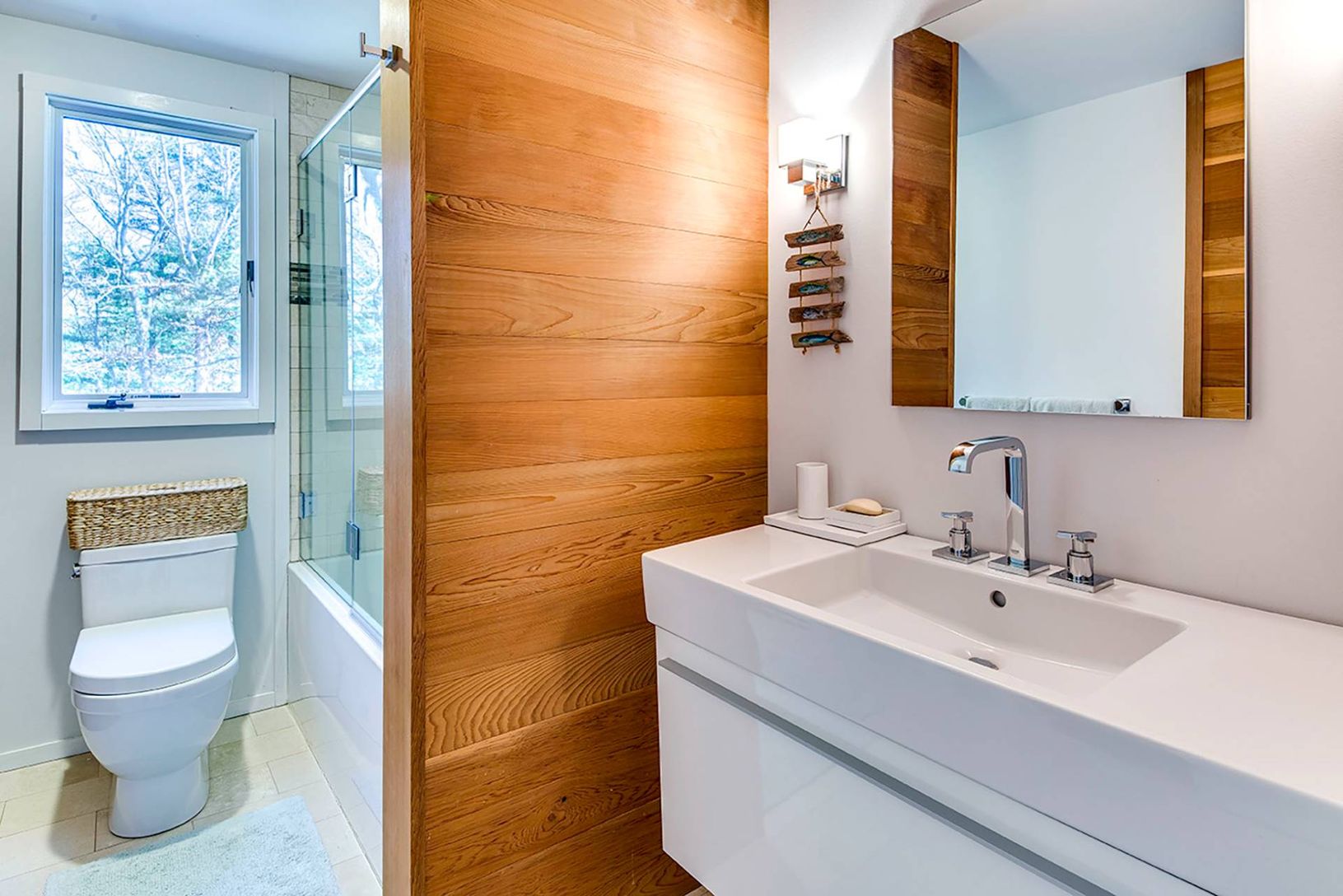 Up a long private drive sits this 2-story modern contemporary oasis minutes to East Hampton Village. The home features 4 bedrooms, three bathrooms, and dramatic glass windows surrounded by canopy views offering serene privacy. Renovated with sleek, clean lines, it offers a heated gunite pool and spa, with ample lounging, on a stunning 2.71-acre wooded lot. The interior flows into the expansive outdoor deck, which features a dining table and se