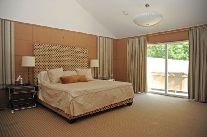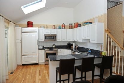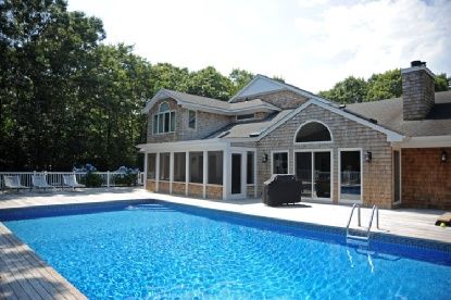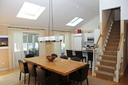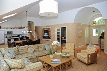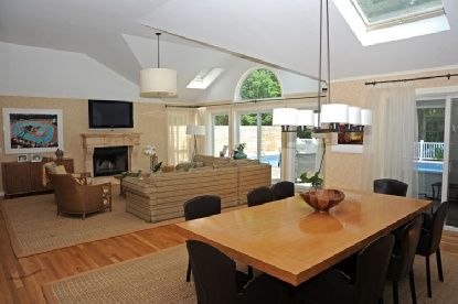 This totally turn-key, shingle styled five bedroom, five and one-half bath contemporary home is sited on a lushly landscaped private acre. The home was fully renovated and meticulously updated in 2009. Each of the bedrooms is en-suite; with master bedrooms on the first floor and second floors. Each bathroom is decorated with top of the line glass or ceramic tile and high-end fixtures. The living spaces are sun drenched with skylights and vault