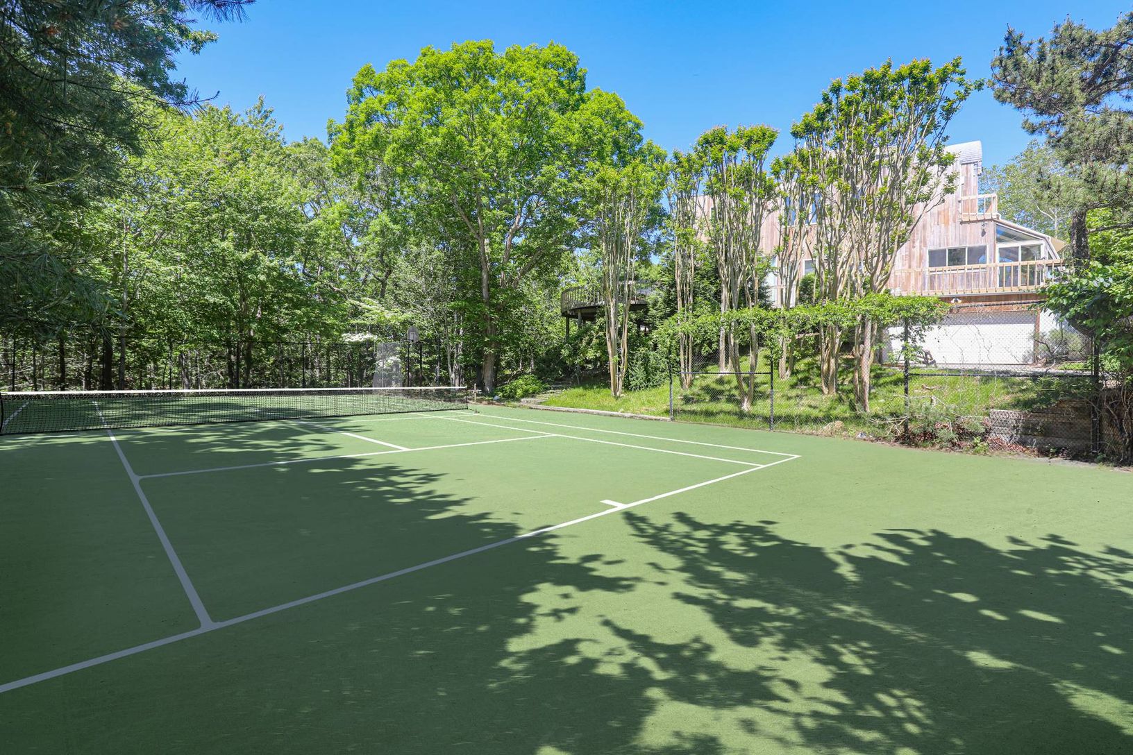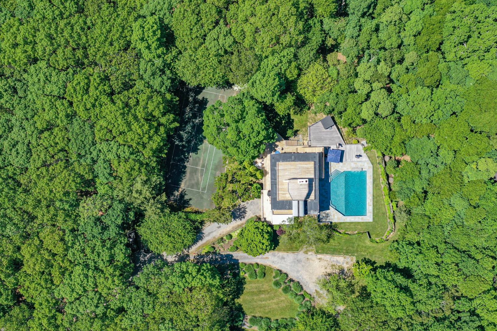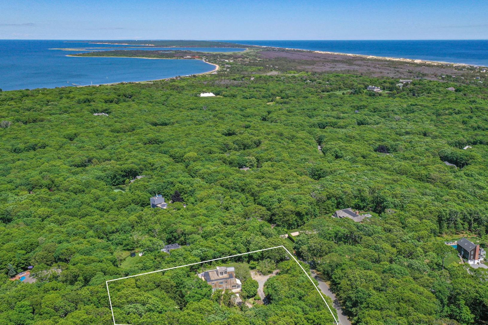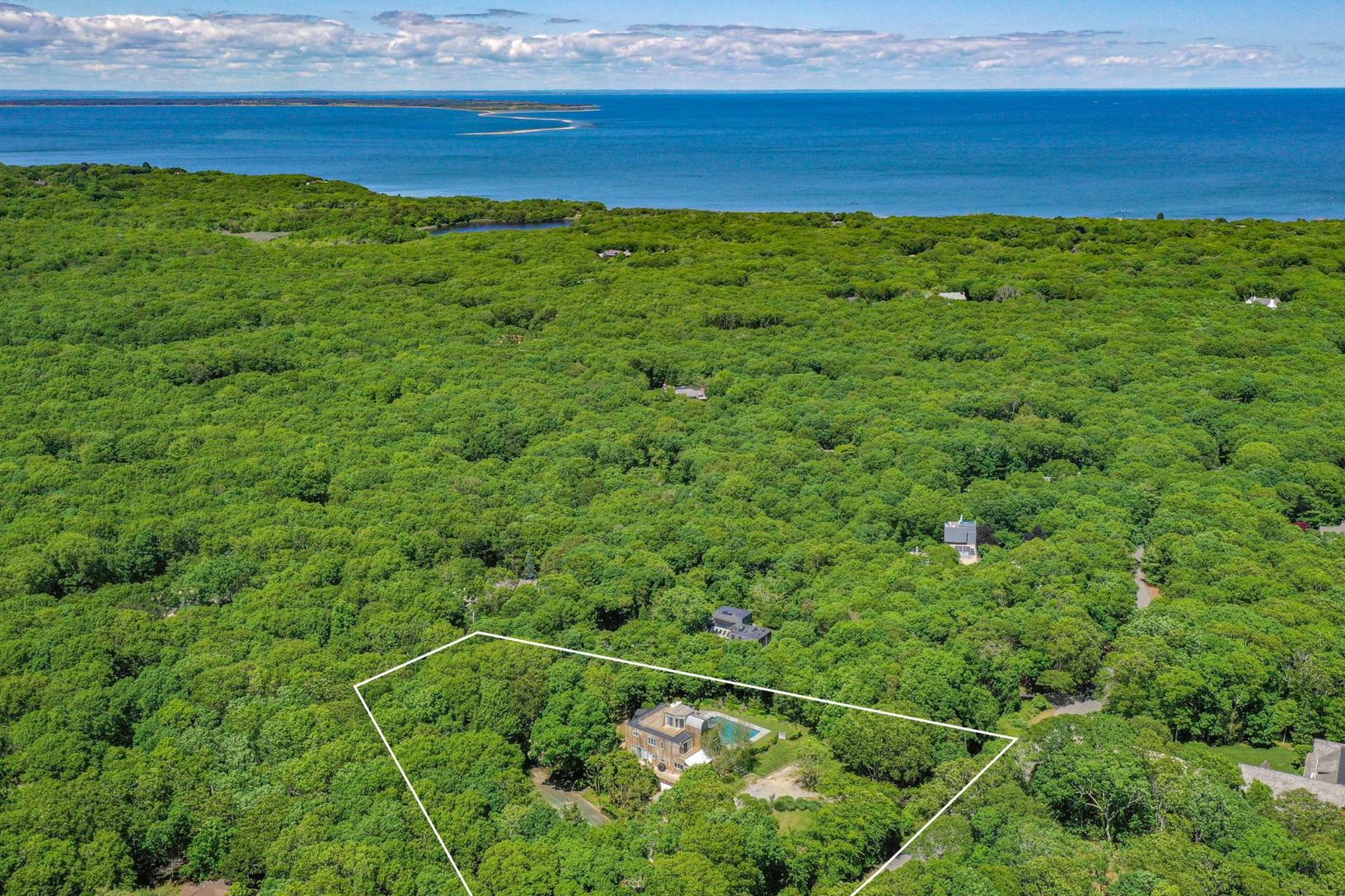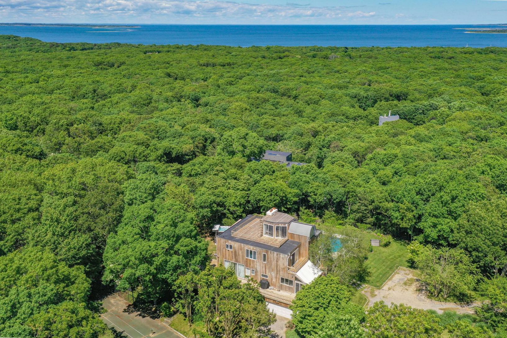 Sitting on one of the highest points in Amagansett this shy 2 acre parcel includes a number of rare attributes: Preexisting clearing of almost double the allowable in a water recharge area, one of only a handful of properties in Amagansett with a tennis court and sweeping bay and ocean views from the roof. Either renovate the existing 4 bedroom 3 bath residence or start anew on this elevated building site. Other amenities include a finished wa