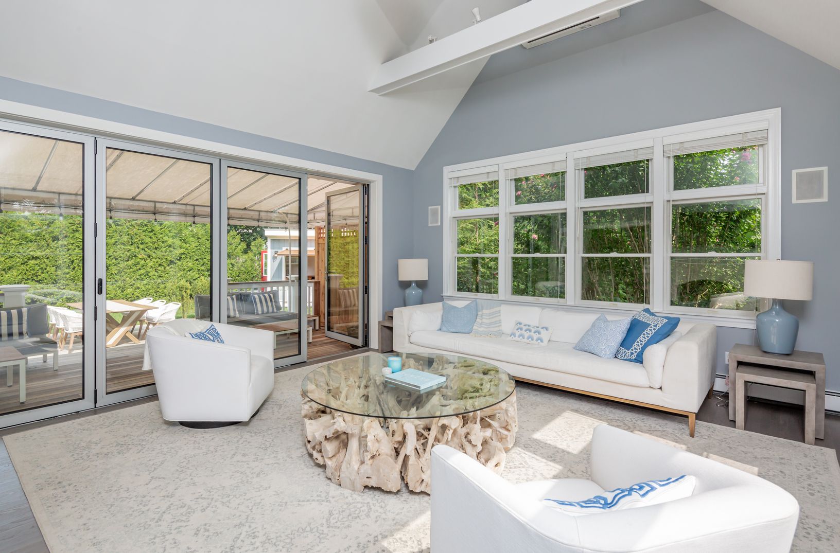 This home offers the perfect flow for easy summer living. Stylish Post Modern features a light-filled great room with soaring ceiling and fireplace, recently updated kitchen, open dining, 4 bedrooms, 2 baths, and a finished lower level complete with, media room and laundry room. State of the art sliding glass doors lead to an awning covered deck for relaxing in the shade. Heated gunite pool with built in lounge ledge for those hot summer days.