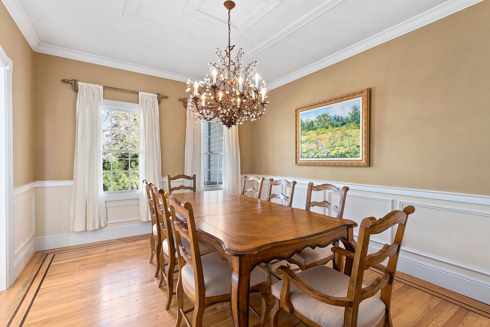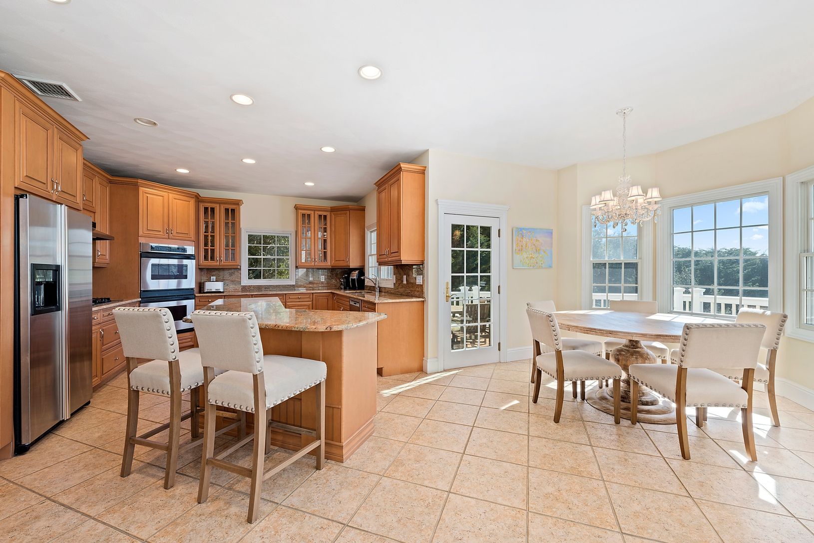 Located on a private lot bordering open space this generous 5 bedroom 4 bath home has the perfect location just outside Southampton Village. It is nicely elevated and has beautiful bay and ocean views from the master bedroom balcony and one of the guest suites. The open floor plan includes a spacious kitchen flowing into the sunny 2 story great room with fireplace and wet bar. French doors and oversized windows with southern exposure keep it s