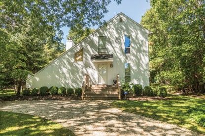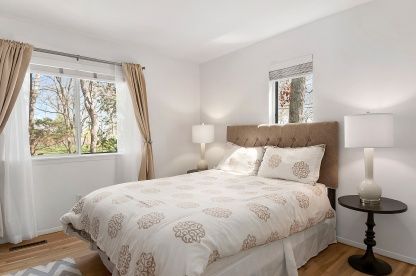 This sleek contemporary features clean lines and open, light-filled living spaces flanked by French doors to capture the light and the lush green surroundings. The three bedroom, two and one-half bath home has been renovated, featuring a brand new kitchen, two new bathrooms, newly finished floors, a stone surround around the fireplace, and a fresh coat of paint. The doors of the living room and dining area all open to the large deck that surro