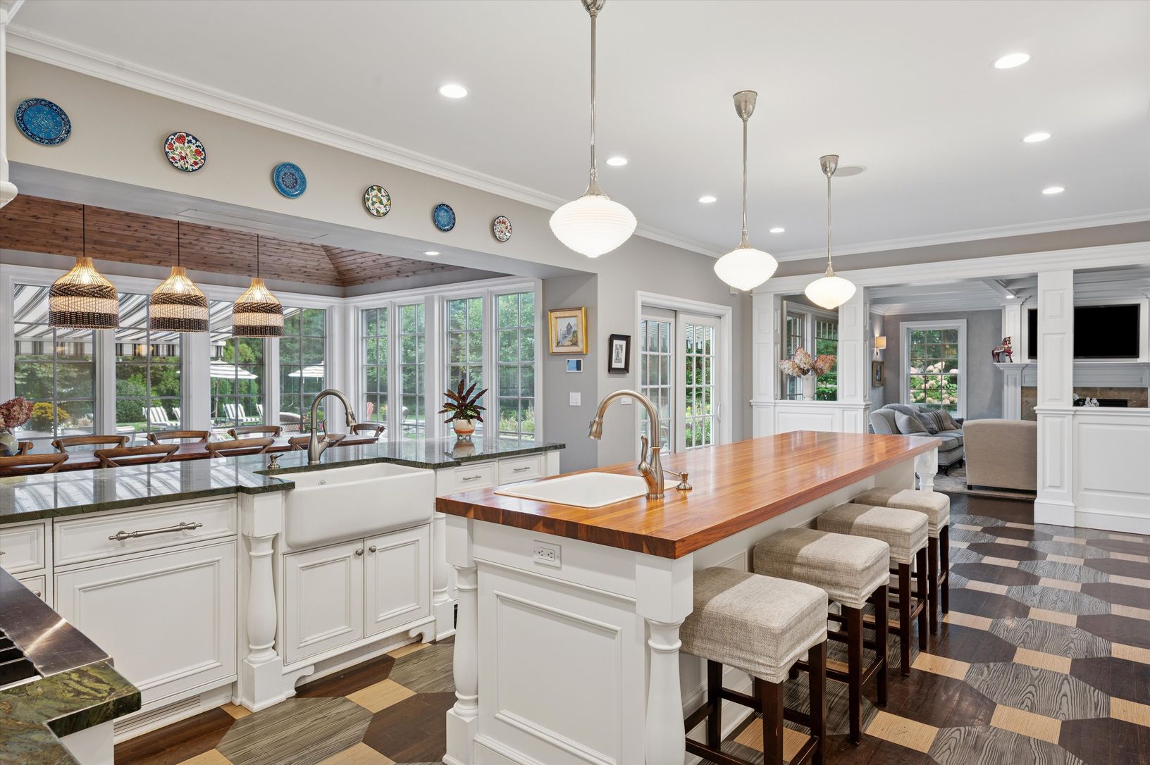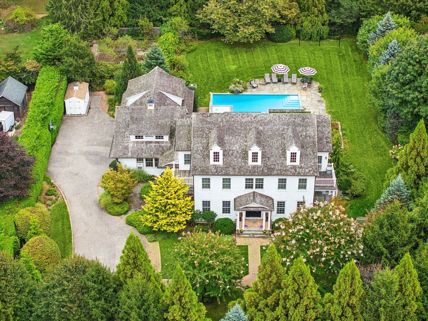 Privately set behind a gated entry on a maturely landscaped acre, just 65 miles from New York City, this custom-built estate located in East Moriches offers more than 4,700± square feet of refined living across three levels with an additional 1,300sqft. finished lower level. Designed with historic architectural detailing and modern amenities, the home balances elegance, warmth, and functionality in every room. A dramatic double-height foyer in