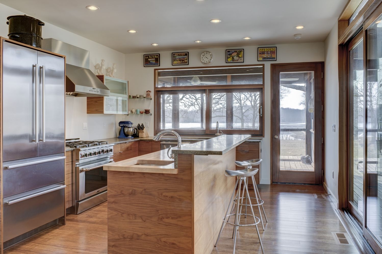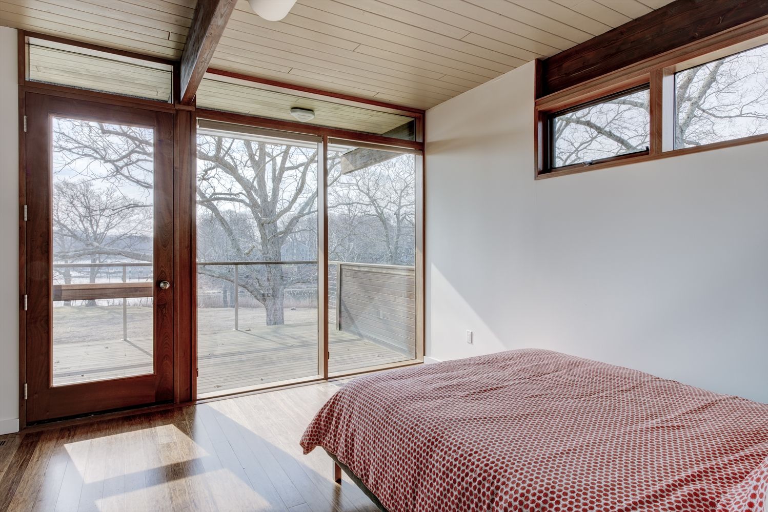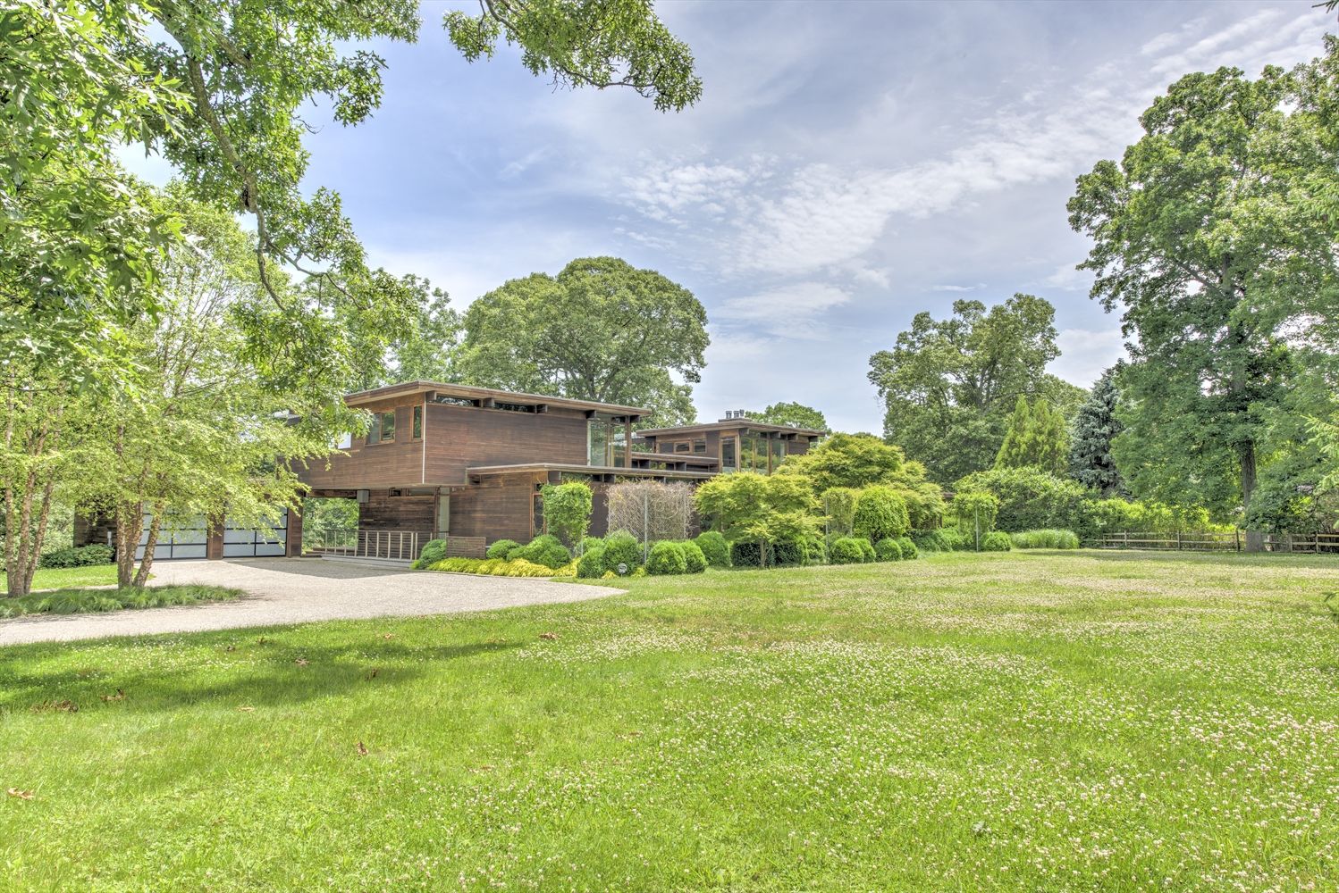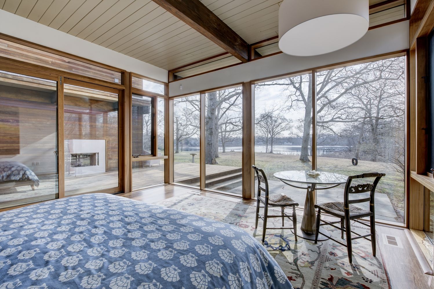 This architecturally significant modern design is being offered for the first time since it was commissioned. The home is located on over 2 acres of waterfront property in the lovely peninsular community of Westmoreland. The dramatic open plan space has walls of glass in the living room and six folding panel glass doors with a double height beamed ceiling in the dining room. The designer kitchen has a wonderful granite and butcher block isl