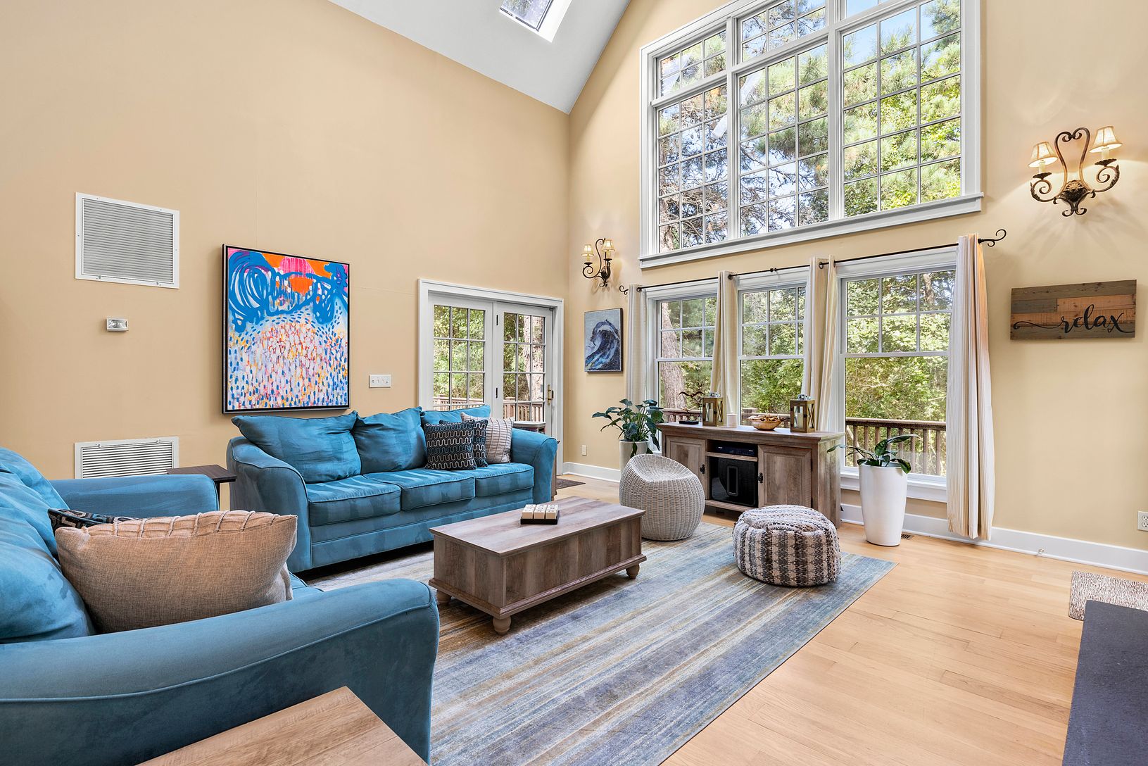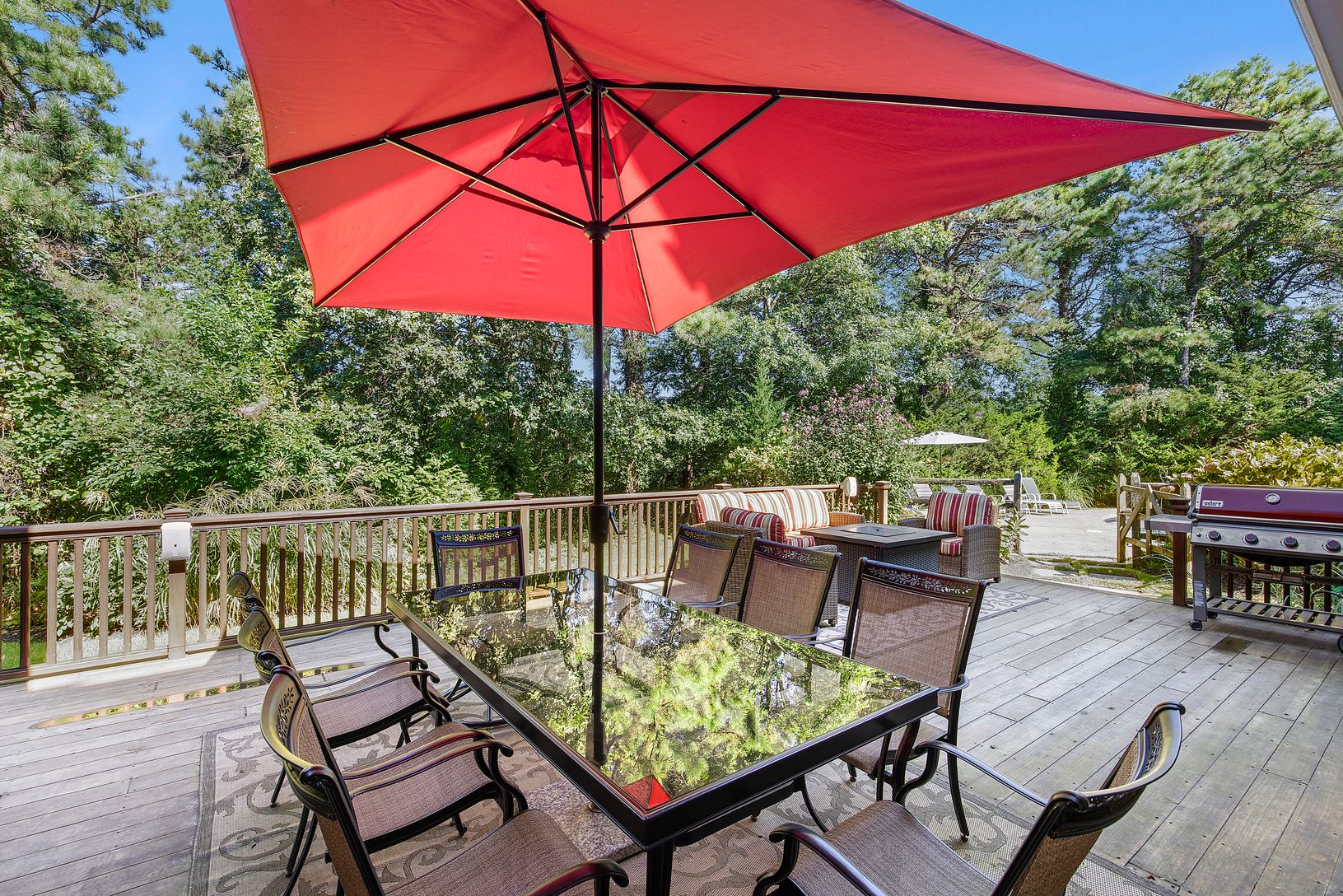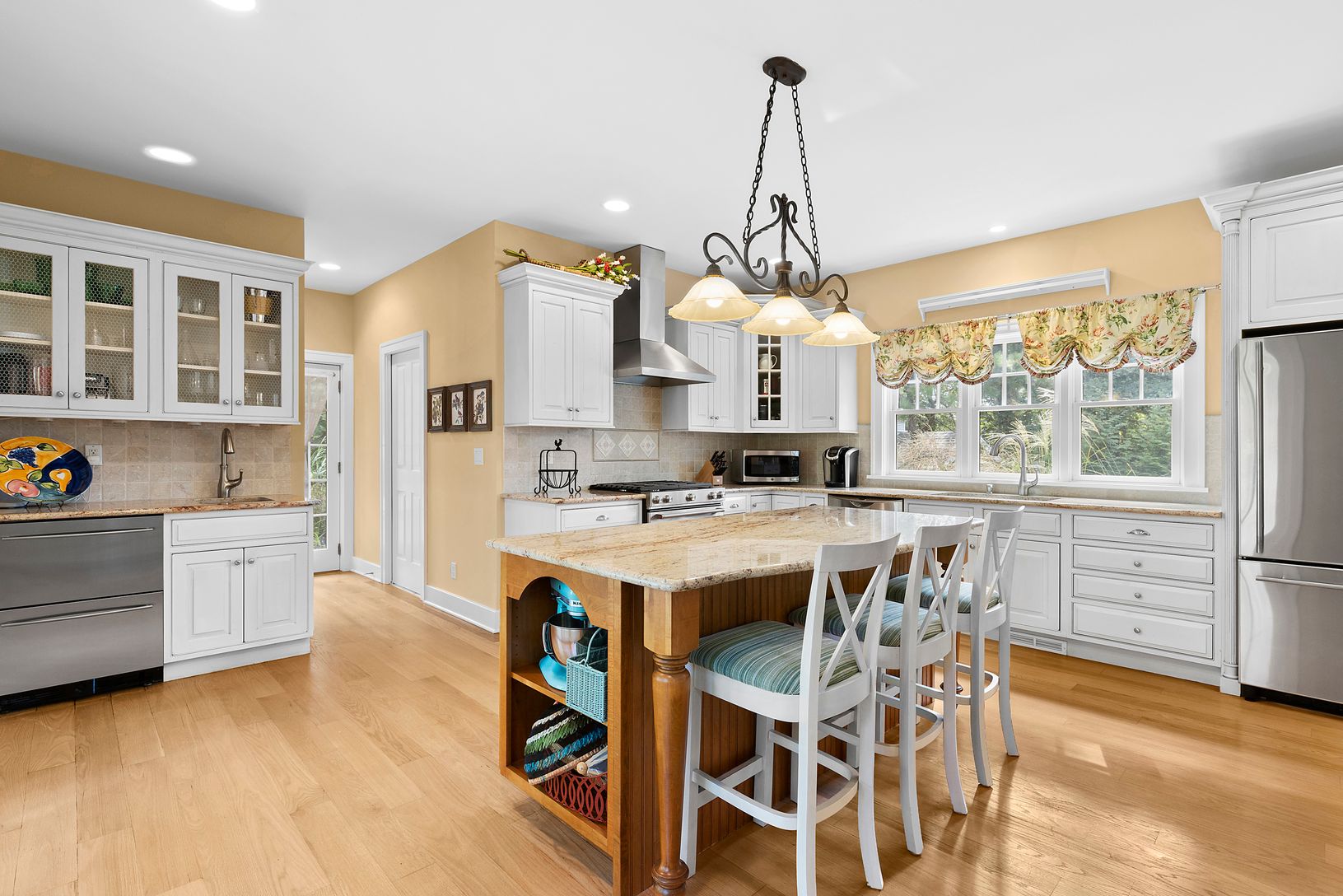 This perfectly situated home with circular drive is minutes from Southampton Village and Coopers Beach. This +/- 3000 sq. ft. home offers 4 bedrooms, 3.5 baths, 2-car detached garage with loft, and kidney shaped saltwater heated pool on 1.25 private lush acres. The first level features inviting entryway that opens to the cathedral ceiling living room with stone fireplace, hardwood floors throughout with windows overlooking the grounds, large e