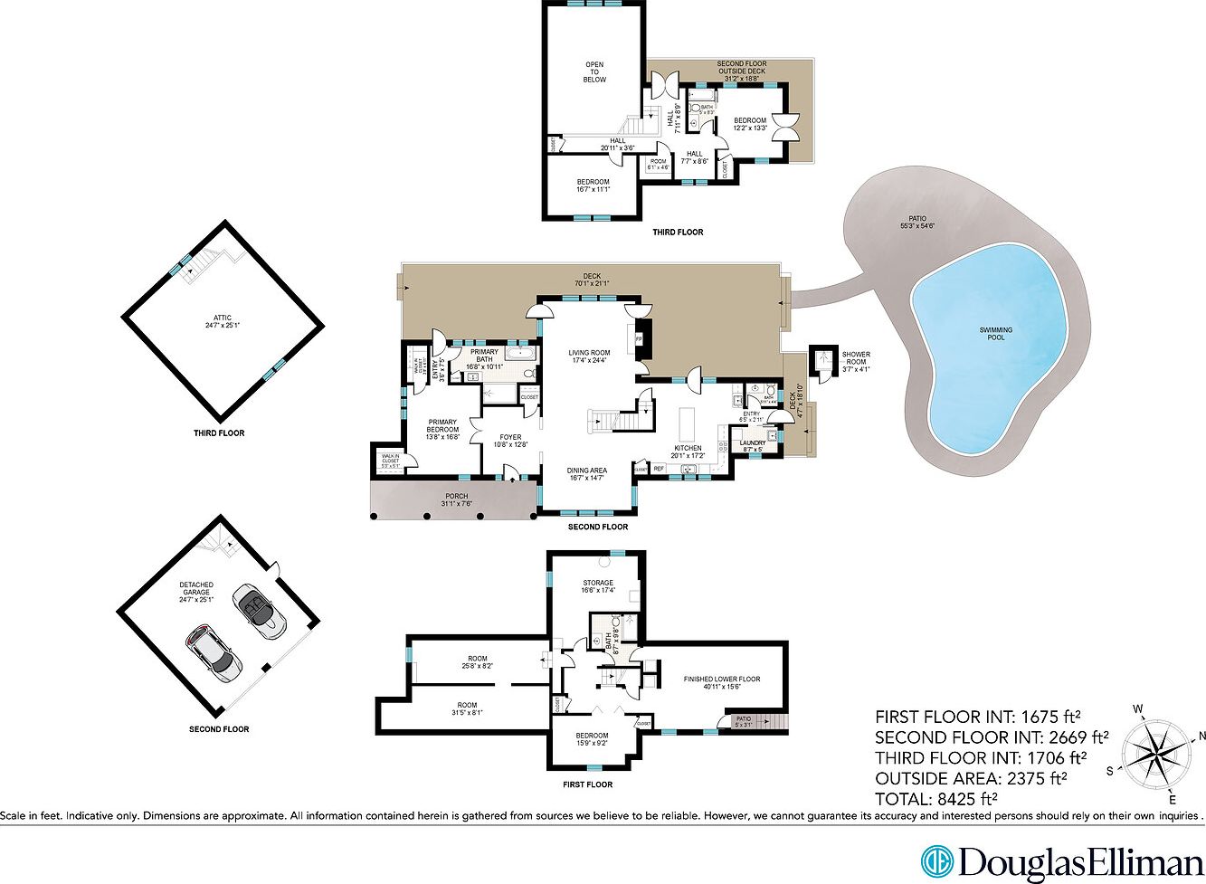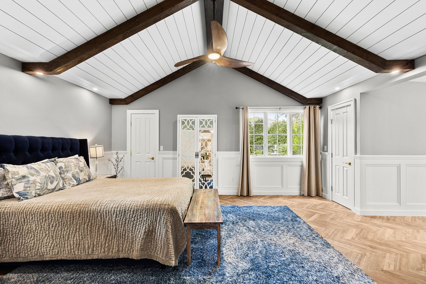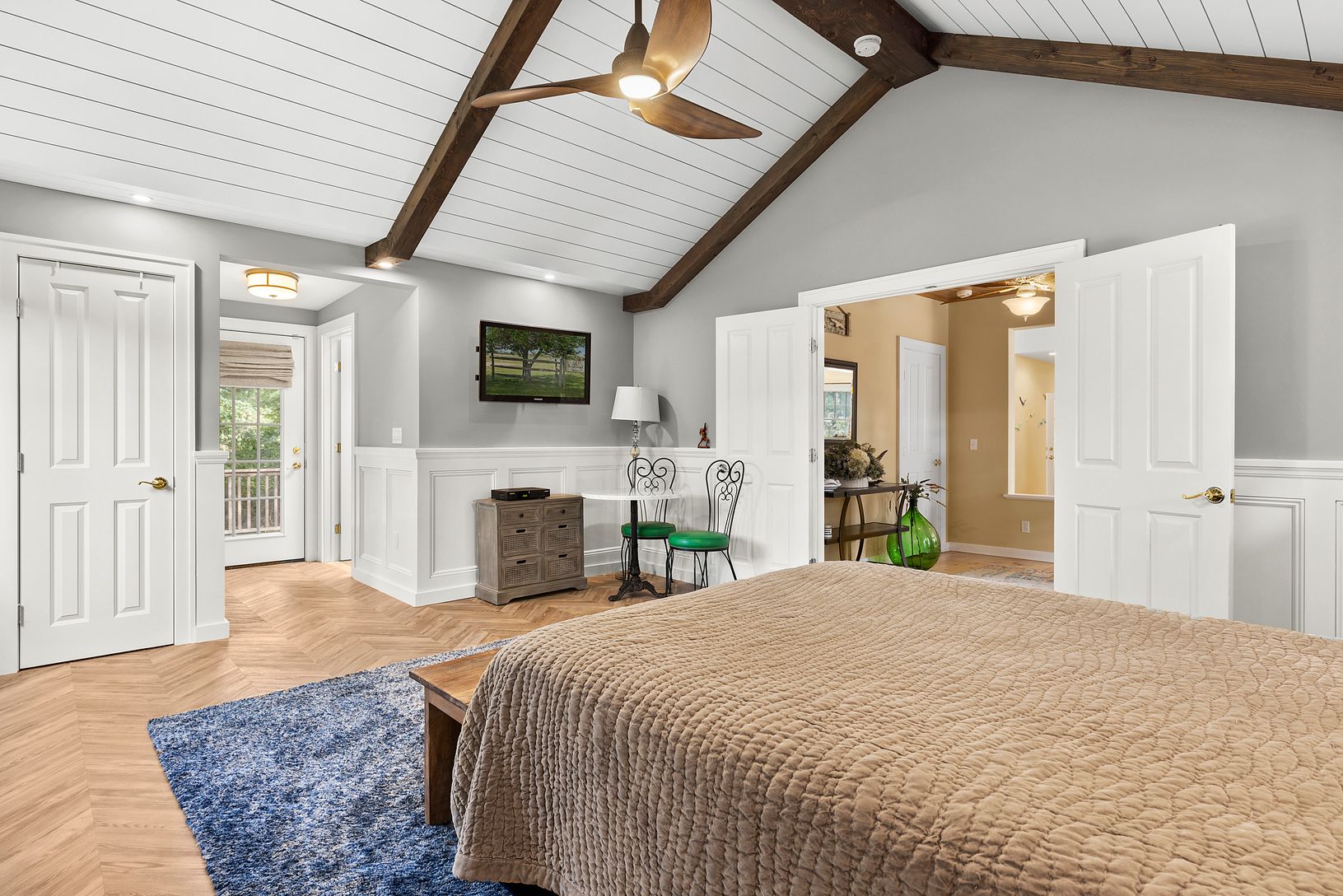 This perfectly situated home with circular drive is minutes from Southampton Village and Coopers Beach. This +/- 3000 sq. ft. home offers 4 bedrooms, 3.5 baths, 2-car detached garage with loft, and kidney shaped saltwater heated pool on 1.25 private lush acres. The first level features inviting entryway that opens to the cathedral ceiling living room with stone fireplace, hardwood floors throughout with windows overlooking the grounds, large e