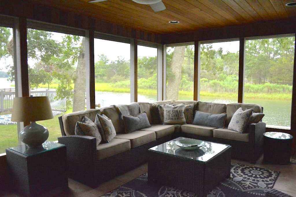 Fully furnished 4BR, 3BA waterfront at the Peninsula of Hogs Neck & Cedar Beach/Paradise Point. Master bedroom has King-sized bed, 2nd BR has a queen, 3rd BR has a full & ensuite bathroom, 4th bedroom has 2 twin beds. All bedrooms have flat screen tvs & cable. There is also a separate queen size sleeper sofa in the living room. This home comfortably sleeps 10 people, 8 adults max. Bright Sunroom furnished with another sectional &am