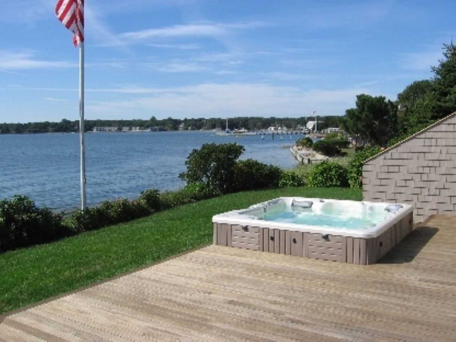 Available Summer Rental Memorial Day Weekend - Labor Day $60,000. Captivating and breathtaking, full water views of Shinnecock Bay from every room! This lovely Arts & Crafts style 3-bedroom home makes you feel as if you are on a yacht, floating on the bay. Panoramic water views, private sandy beach, wide deck featuring a hot tub and outdoor shower. Deeded mooring for up to 25ft boat. Custom professional kitchen features granite countertops