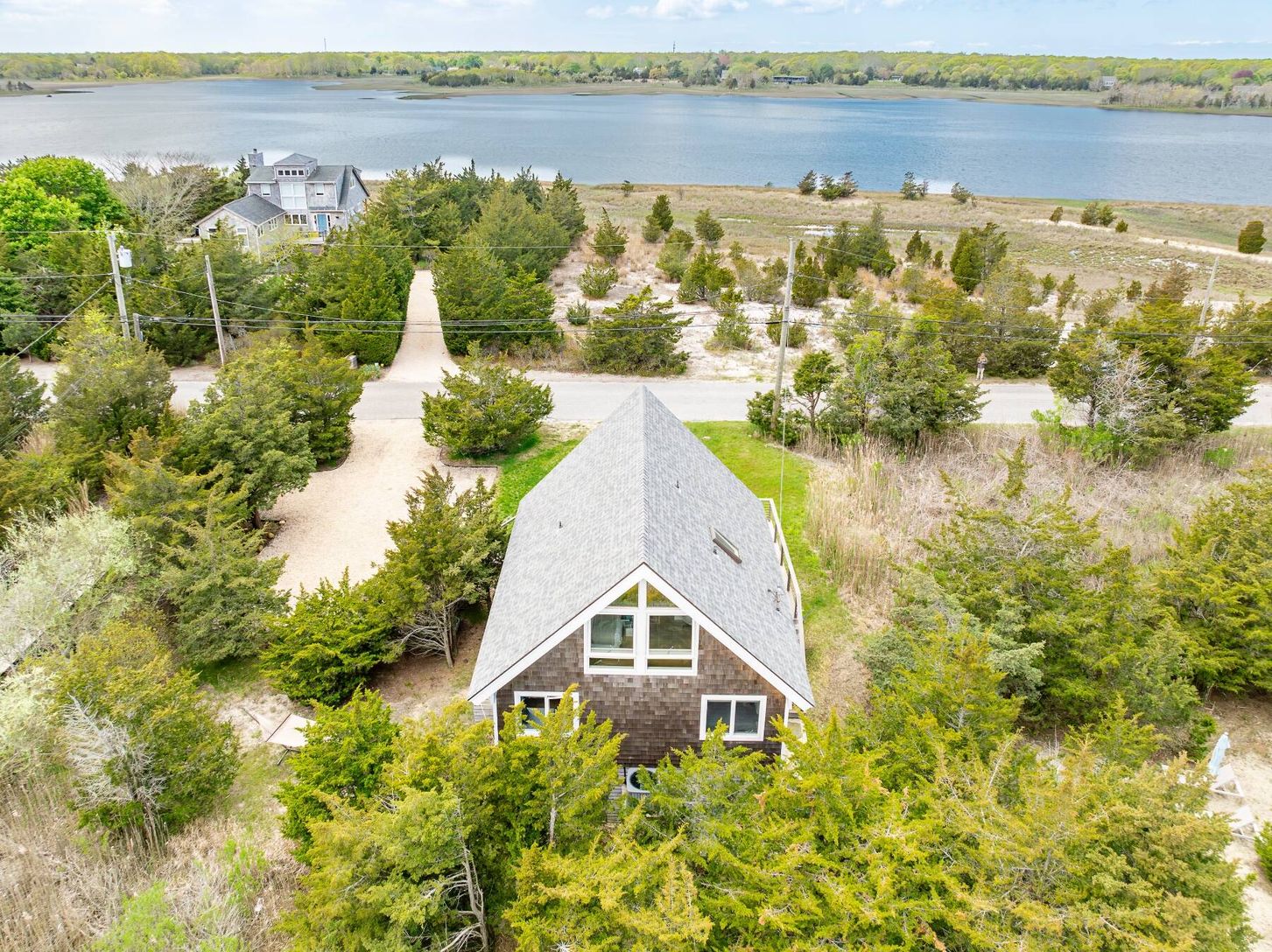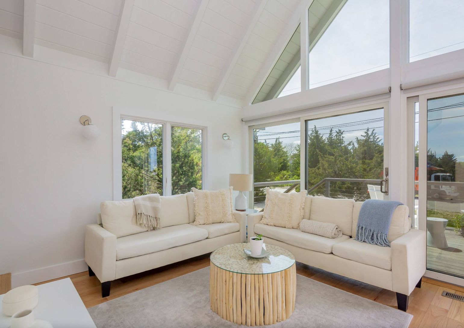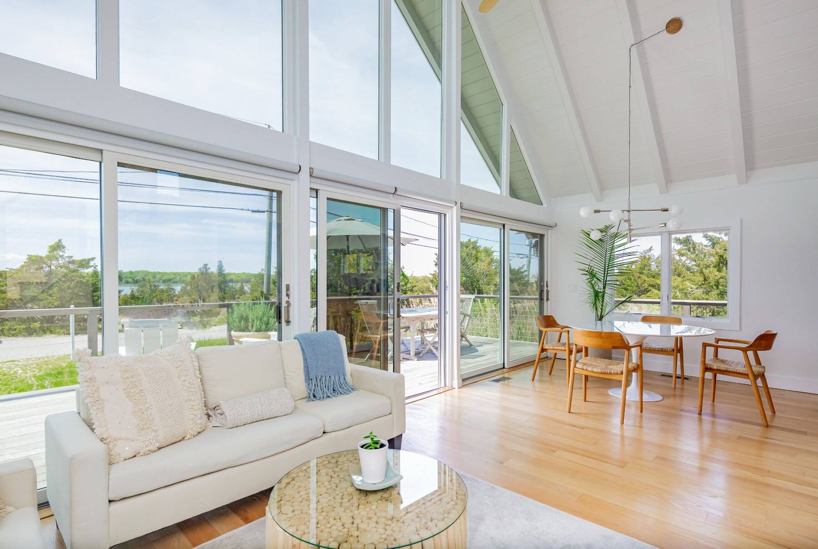 Experience waterfront living at its finest at 313 Gerard Drive! Marvel at the picturesque vistas of Acabonac Harbor and Gardiners Bay from this exquisite 3-bed, 2-bath retreat. With 1250sqft of refined living space, this home showcases white interiors, exposed ceiling beams, and flawless finishes. Elevating the ambiance is the full glass front wall, flooding the interior with natural light and enhancing the sense of space. The kitchen features