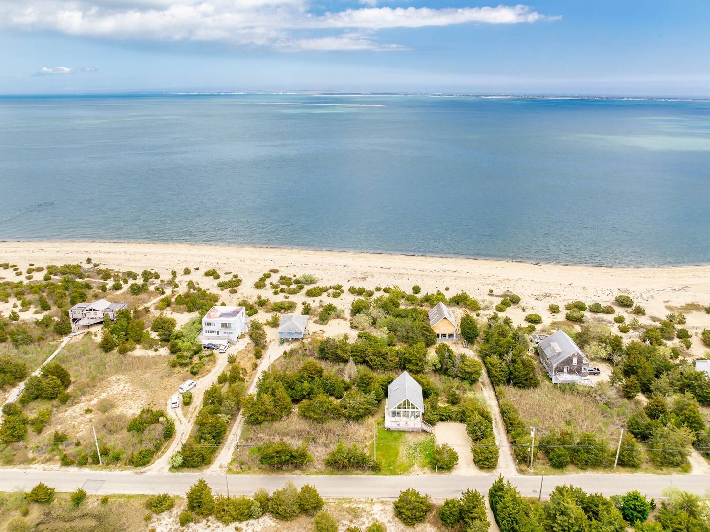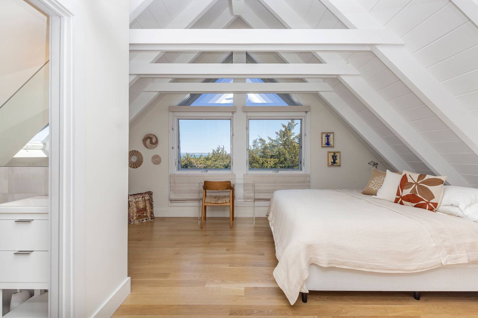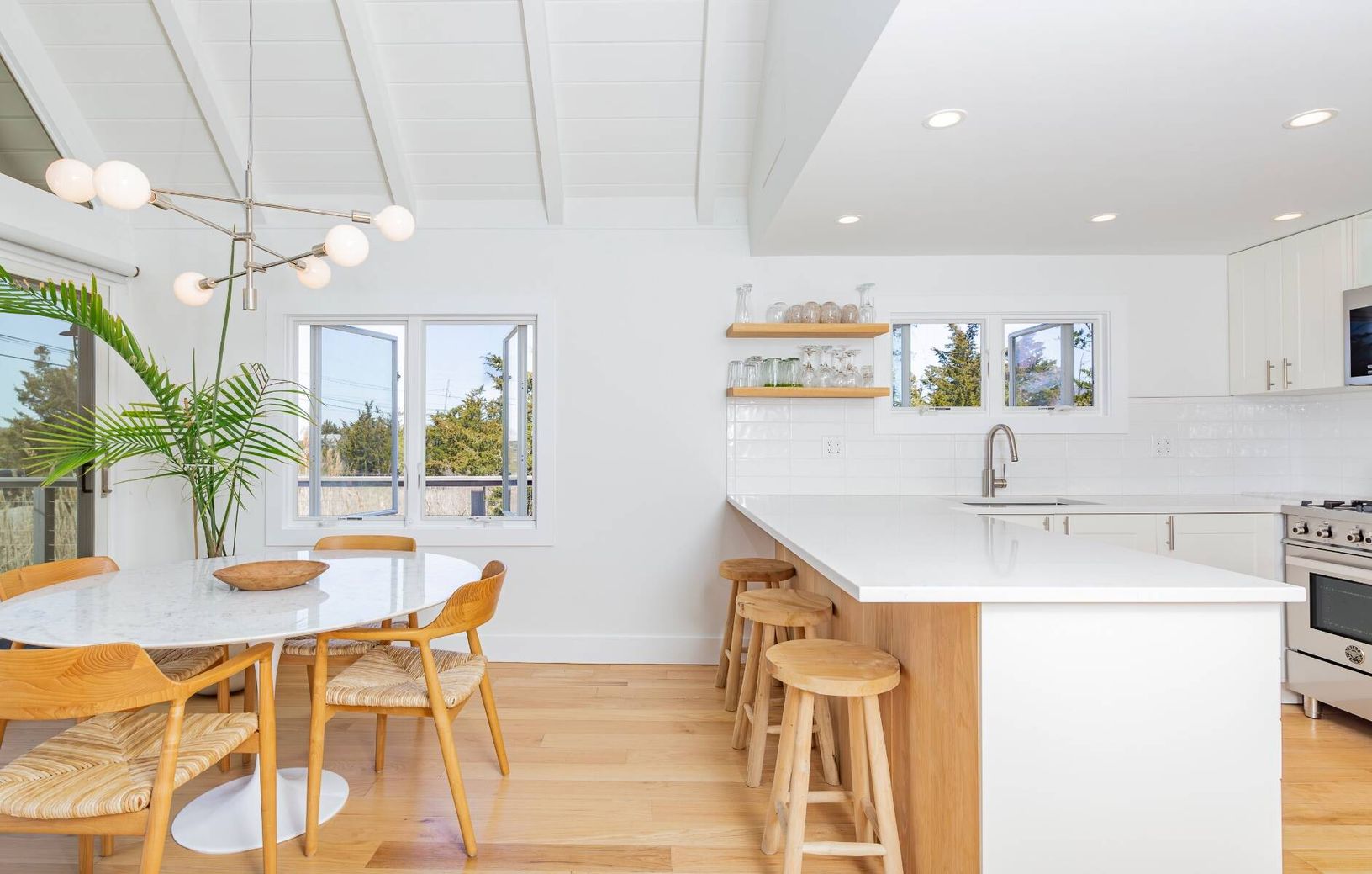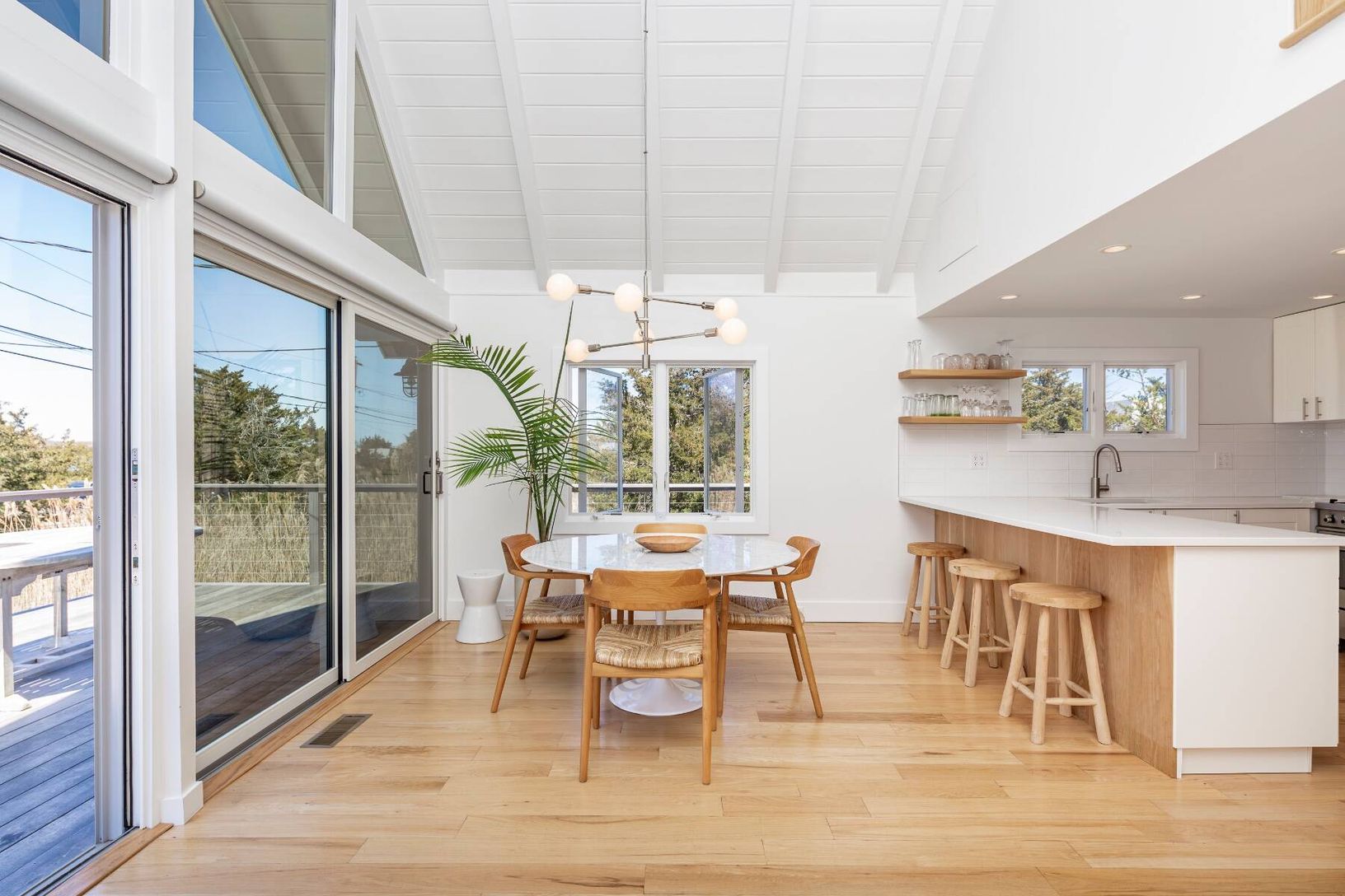 Experience waterfront living at its finest at 313 Gerard Drive! Marvel at the picturesque vistas of Acabonac Harbor and Gardiners Bay from this exquisite 3-bed, 2-bath retreat. With 1250sqft of refined living space, this home showcases white interiors, exposed ceiling beams, and flawless finishes. Elevating the ambiance is the full glass front wall, flooding the interior with natural light and enhancing the sense of space. The kitchen features
