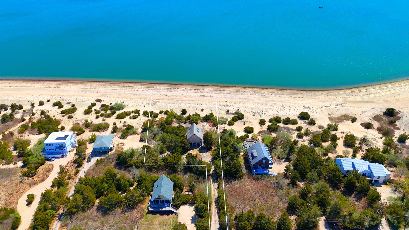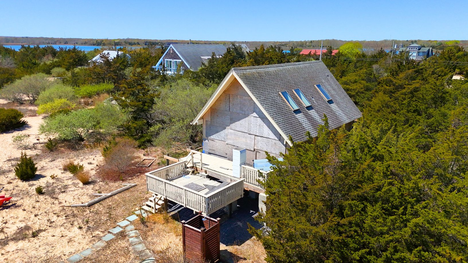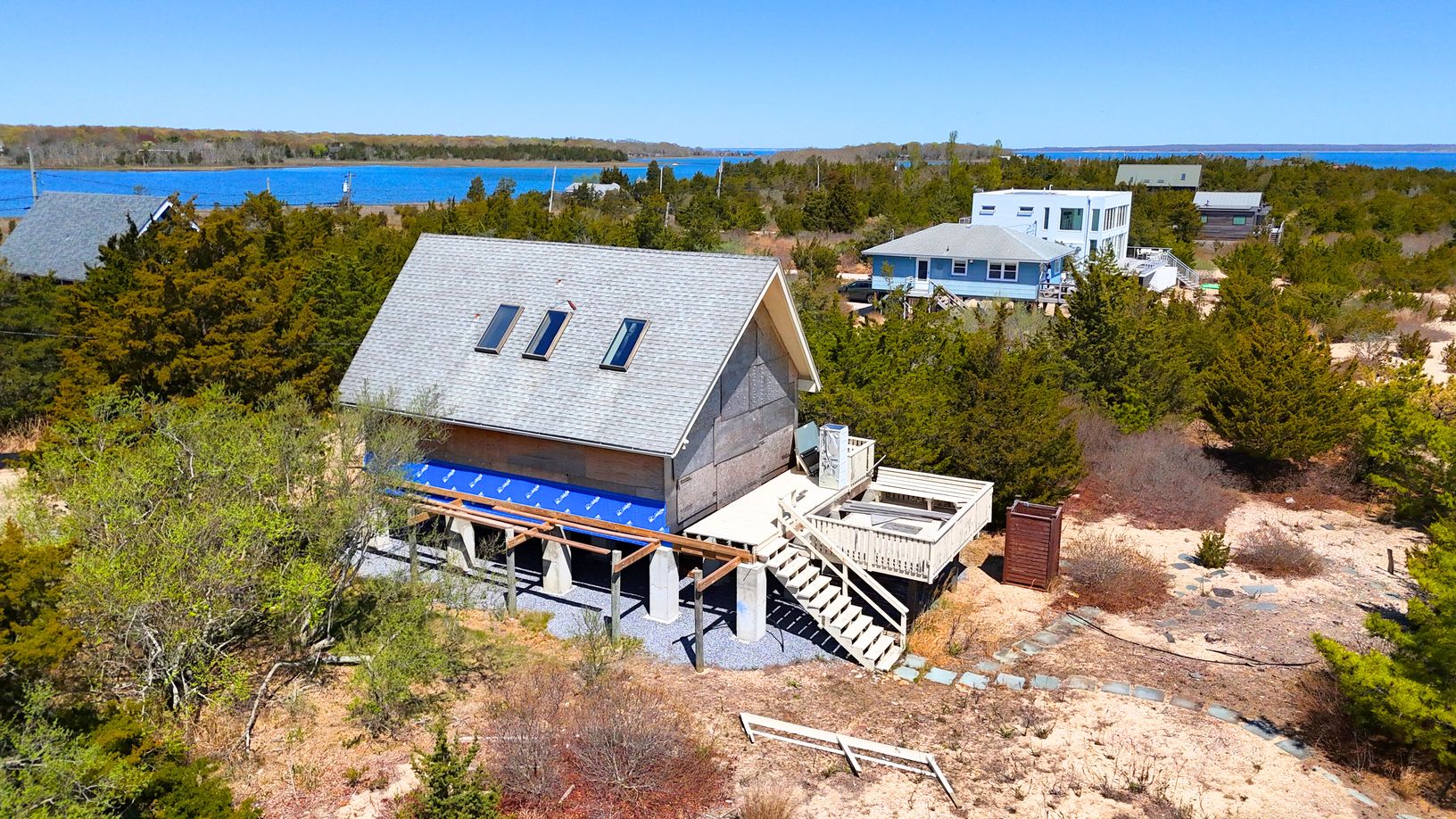 With over 100 feet of beachfront, this property overlooks Gardiners and Cartwright Island with calm and clean waters. Swimming, kayaking, paddle boarding, fishing, biking; list goes on. The raised FEMA-compliant structure offers panoramic views and provides 360 degrees views. Plans are approved to finish the existing three bedroom two bathroom A-frame with dormers on both sides; or take this opportunity to expand the space and let your imagina