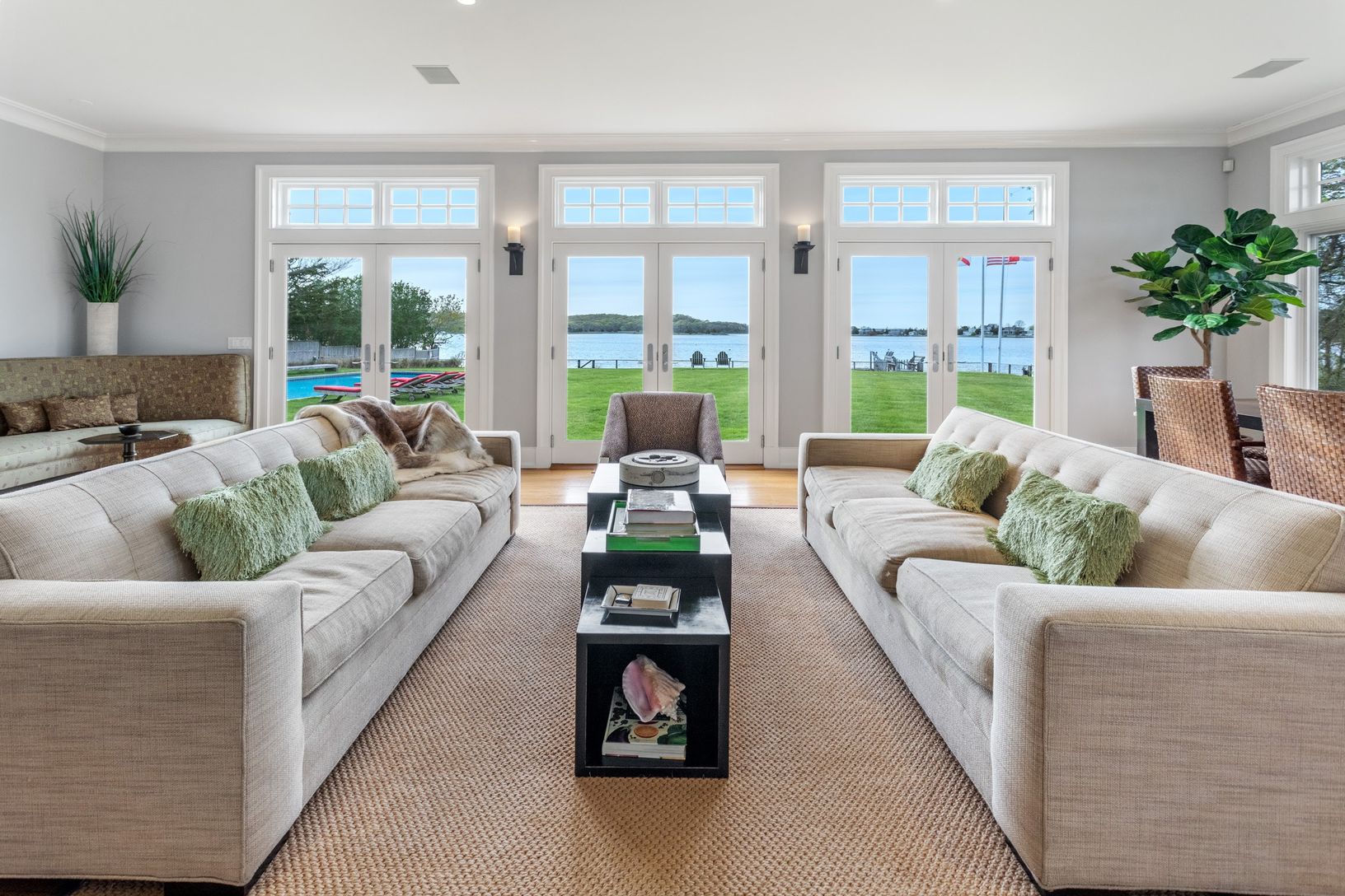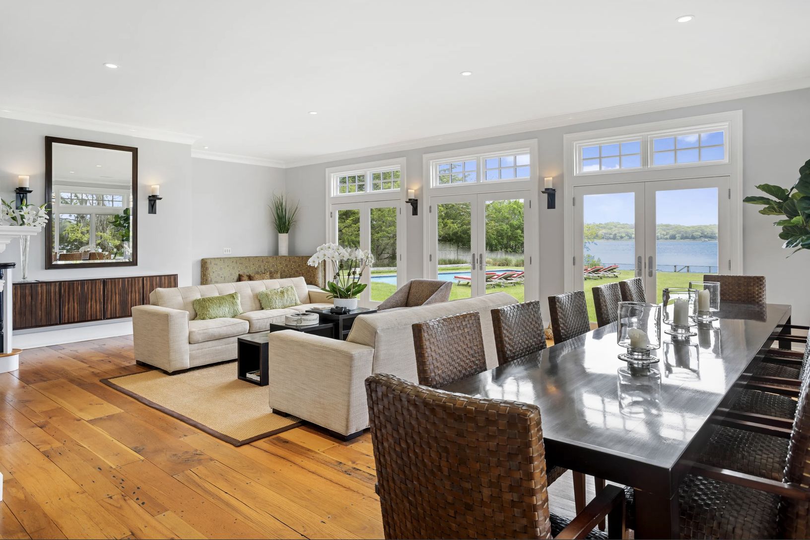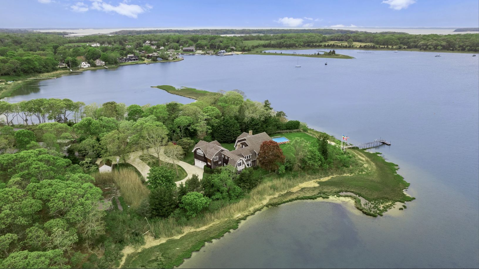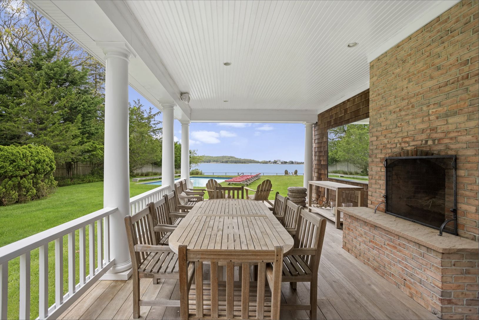 Come see this beautiful waterfront Southampton estate on almost 2 acres overlooking the calm, protected harbor and Peconic Bay, boasting an 85' private dock for 3 boats, a heated 20' x 40' gunite waterside pool, a private white sand beach, and glorious sunsets. The house stands majestically tall with 5 bedroom suites and 6.5 bathrooms spanning 6,140 sq. ft. of pristine interior space saturated with natural light expands to 8,900sq. ft. with de