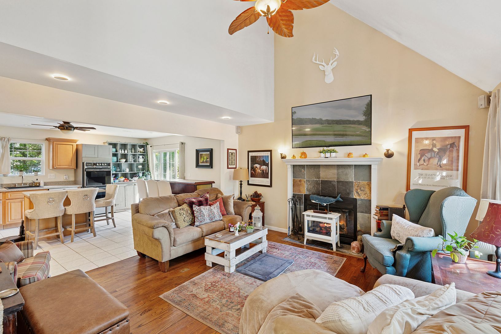Welcome to this beautifully maintained 4-bedroom, 2-bathroom traditional home. Perfectly located south of the highway in Hampton Bays, this property offers both comfort and convenience with timeless charm.This home is a rare find as it has a full unfinished basement with 2-egress windows and a walk-out entrance. The first level features an open kitchen and living room with soaring ceilings, a wood burning fireplace, and an abundance of large w