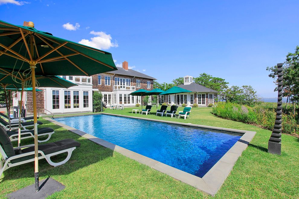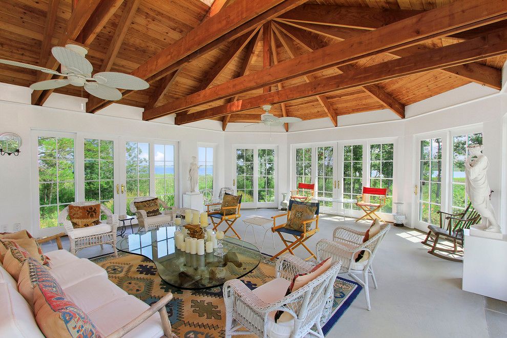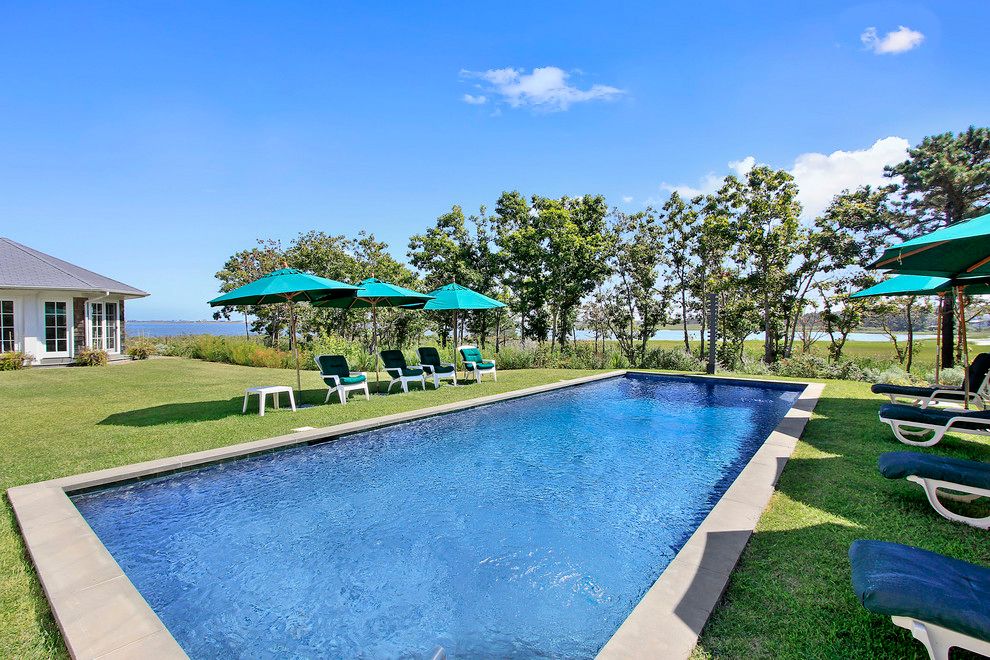 One of the last remaining large tracts of waterfront property available in Quogue. With broad views of Shinnecock Bay and Penniman's Cove, this country house with ten bedrooms, large gathering room pavilion, formal dining room, living room and study is located at the end of country lane with lushly landscaped waterfront land with pool.