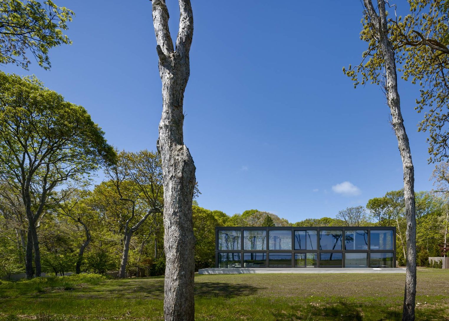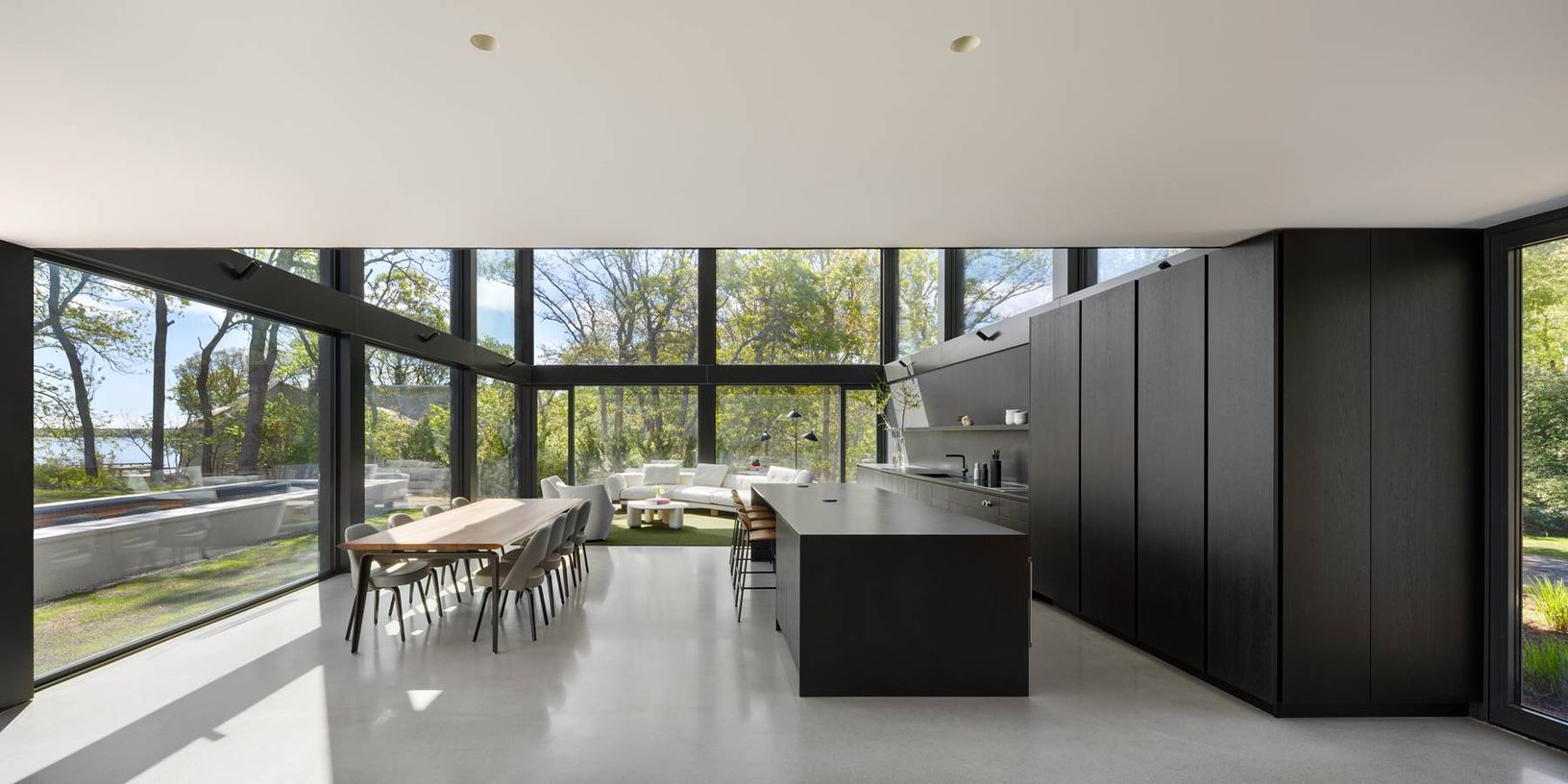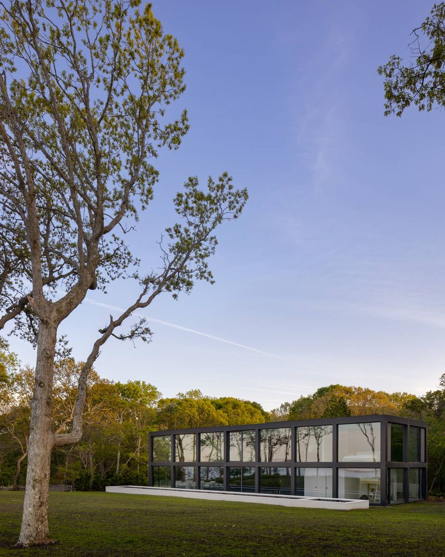 Perched dramatically above the bay on a private bluff, this 4500 sq. ft. glass-wrapped modern masterpiece designed by award-winning Worrell Yeung offers one of the most unforgettable vantage points in the Hamptons. With walls of floor-to-ceiling glass reflecting the surrounding trees and water, the home feels sculptural, iconic, and completely immersed in nature. Set on a rare 1.3 acre parcel overlooking Gardiner's Bay and with views to the No