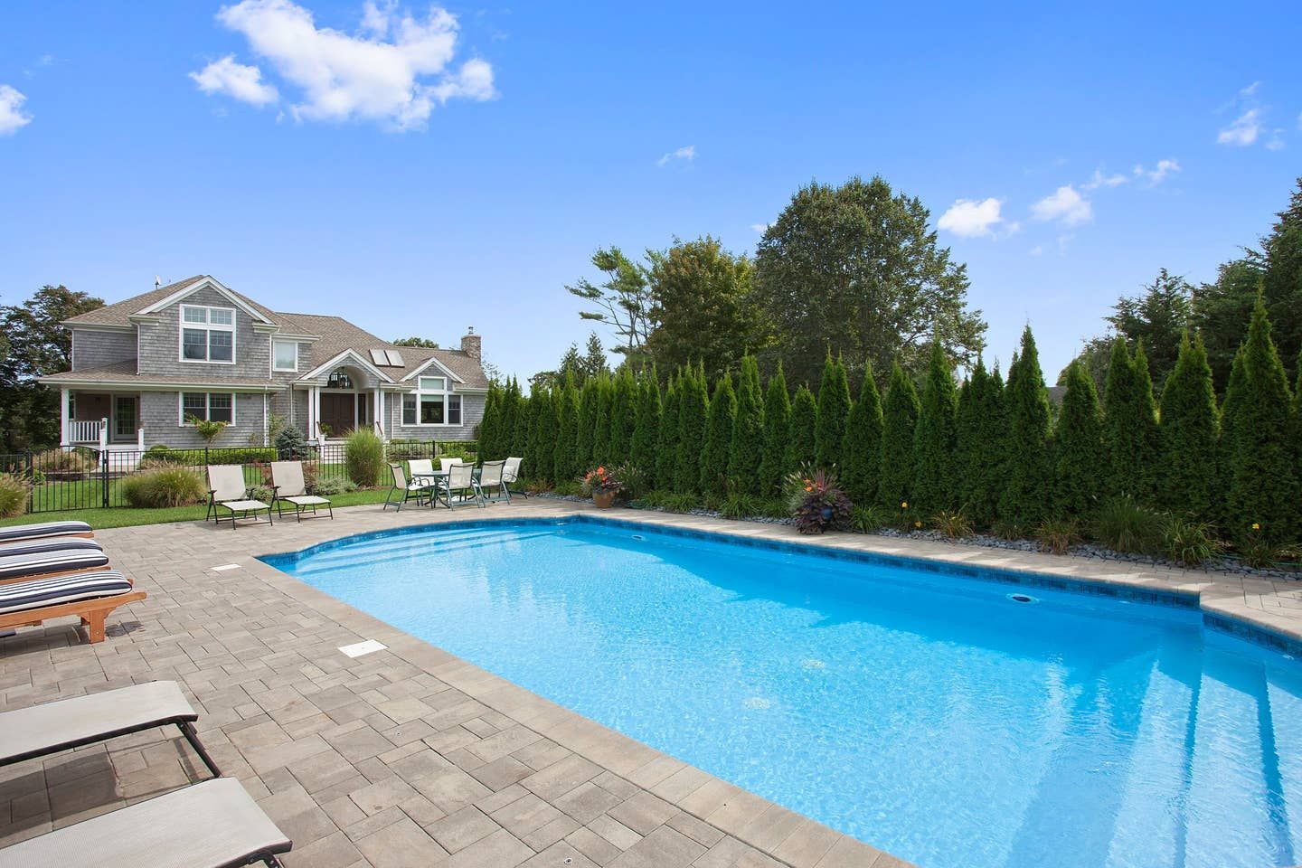 This amazing 4000sf Post Modern home has everything you could want for your summer retreat. Build in 2010, the interior is beautifully finished and has water views from nearly every room. 4 bedroom/4 bath home with master suites on both the 1st and 2nd floors. The heated pool is beautifully landscaped for ultimate privacy. Gourmet kitchen, third story hot tub, 6 car garage, home gym, deep water dock able to accommodate boats up to 45’ with