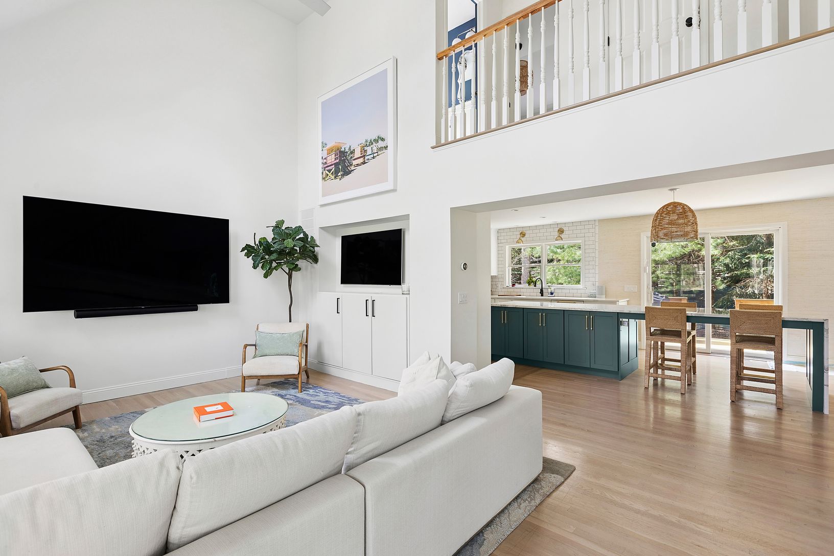 Recently renovated to perfection, this Cape style residence is the perfect place to call home for the summer! Features include a classic covered front porch with two swings, plus 2,000 square feet of glamorous living space. The ground floor boasts a double height living room, open eat-in kitchen, dining room, guest bedroom and full bathroom. Upstairs, the primary suite with its own bathroom is flanked by two guest bedrooms that share the hall