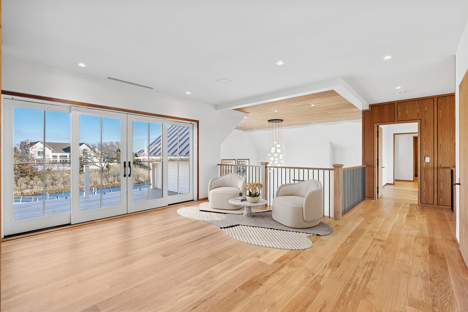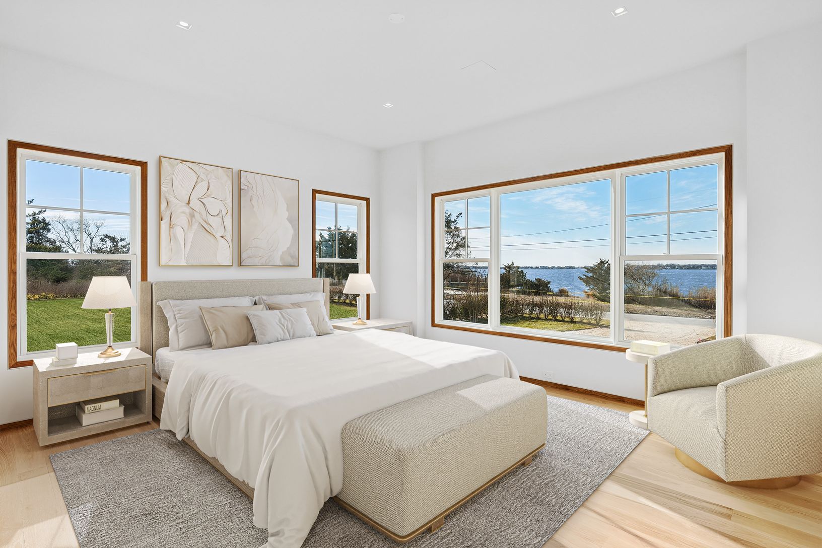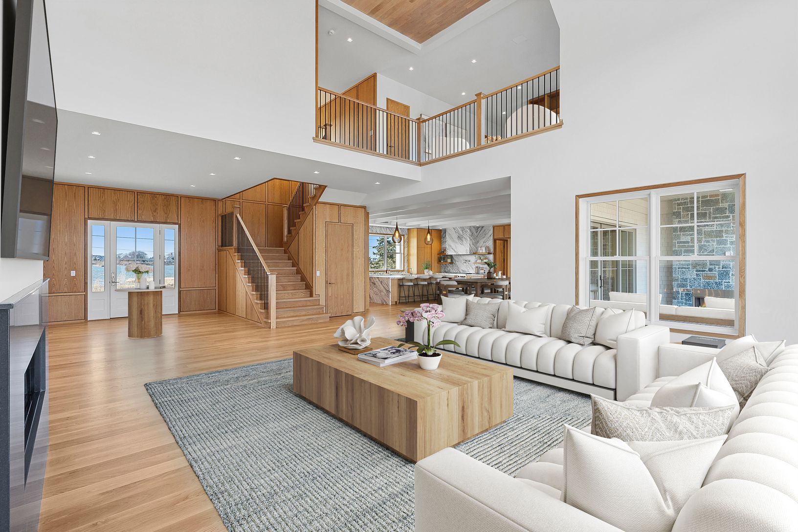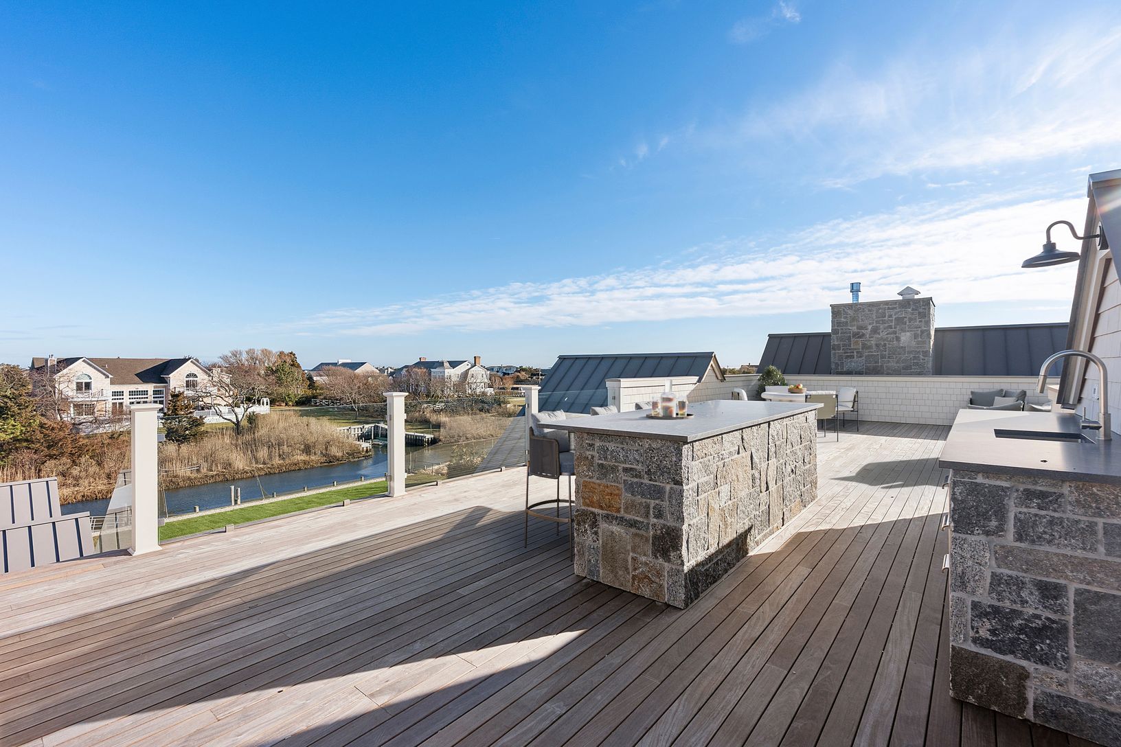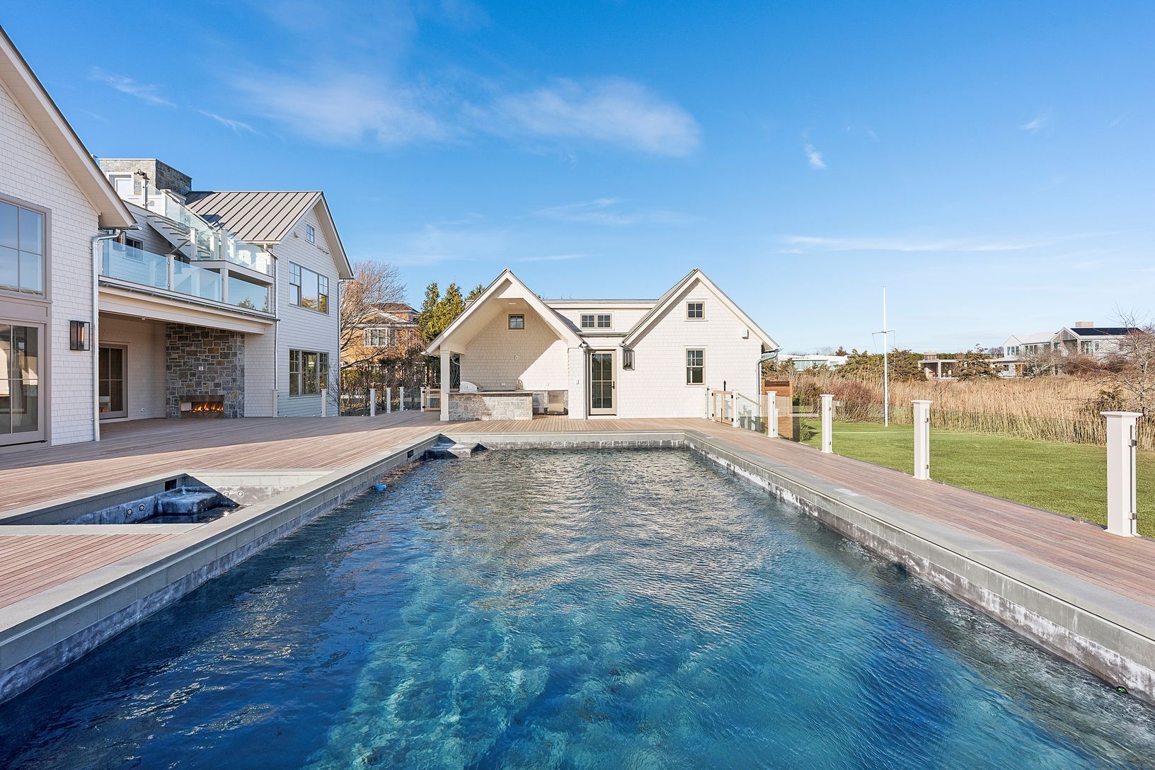A rare deep water dock estate in Quogue’s Estate Section, this newly constructed waterfront residence is designed for serious boating and refined coastal living. With commanding canal frontage, deep water dockage, and sweeping open bay and ocean views, the setting alone places this property among the most coveted offerings in the Hamptons. Spanning over 7,000+ square feet across three refined levels, the home offers a total of six en-suite bed