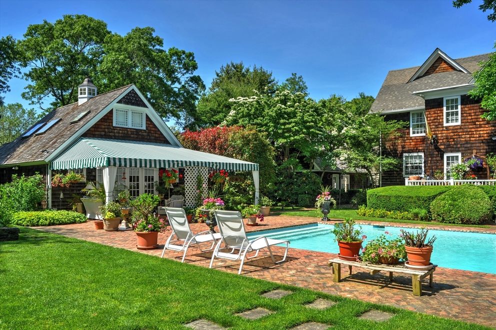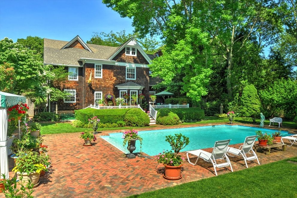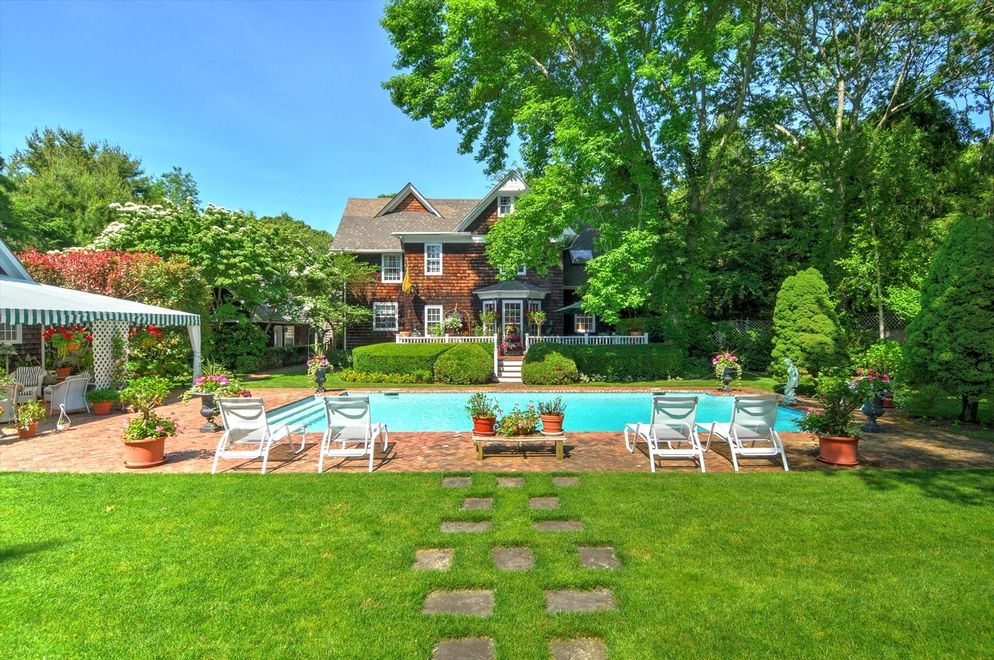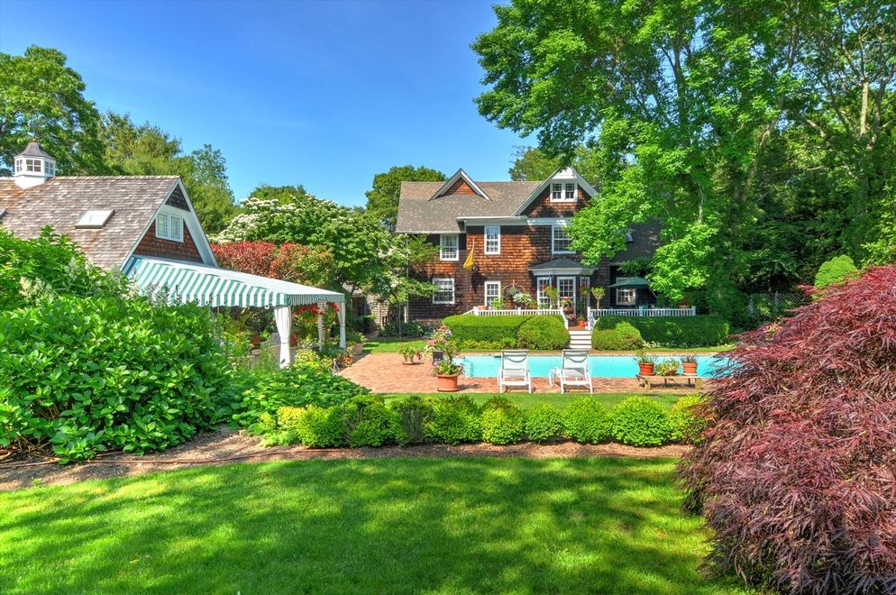 This former Parsonage House is surrounded by magnificent, manicured gardens exploding with roses and specimen trees. It has been lovingly restored and updated to become a charm-filled 4 bedroom, 4 bathroom south-of-the-highway traditional in Water Mill. Enter through a welcoming double-height, light-filled foyer and you are lead into the living room with fireplace, a library with wet bar and past the gracious staircase into the kitchen.Origina