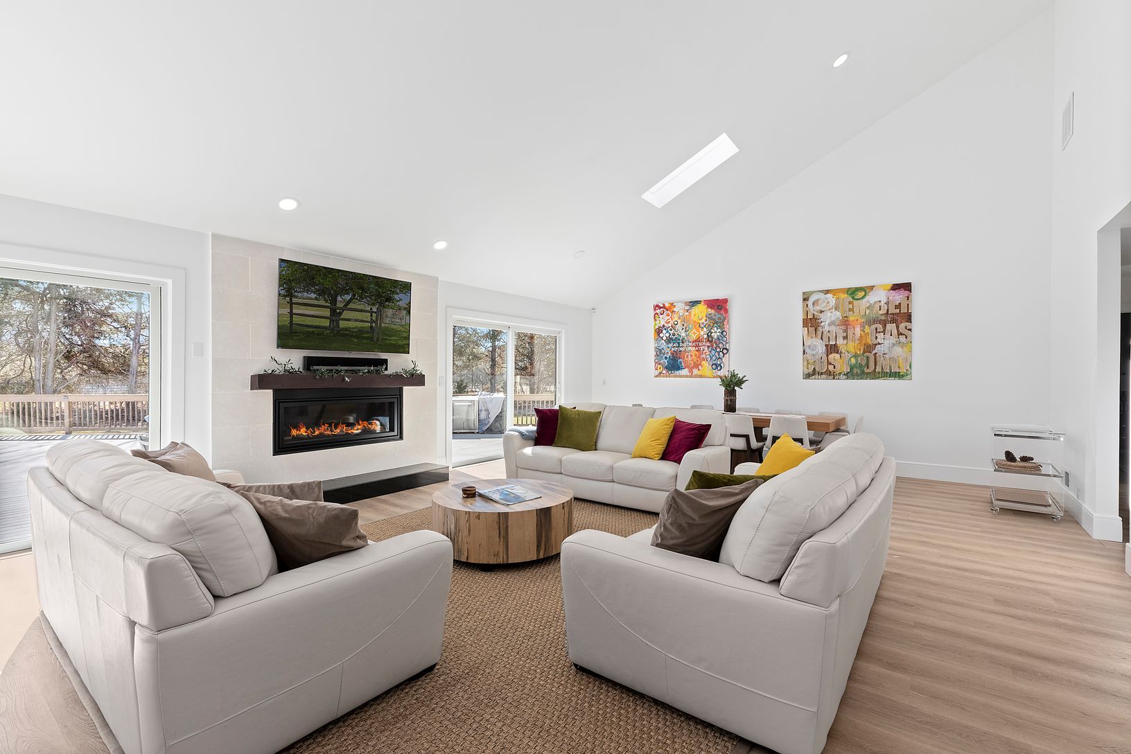 Spend Summer on the water in Westhampton! This 4 bedroom, 4 bath, contemporary is completely renovated and tucked away on 2.3 acres w/ dock, water views, sports court, heated pool, and spacious deck for lounging and entertaining. Immediately upon entering, you are greeted with abundant light from the southern exposure in the open main living space, kitchen, and dining room leading out to the pool deck. Three guest rooms and three full baths co