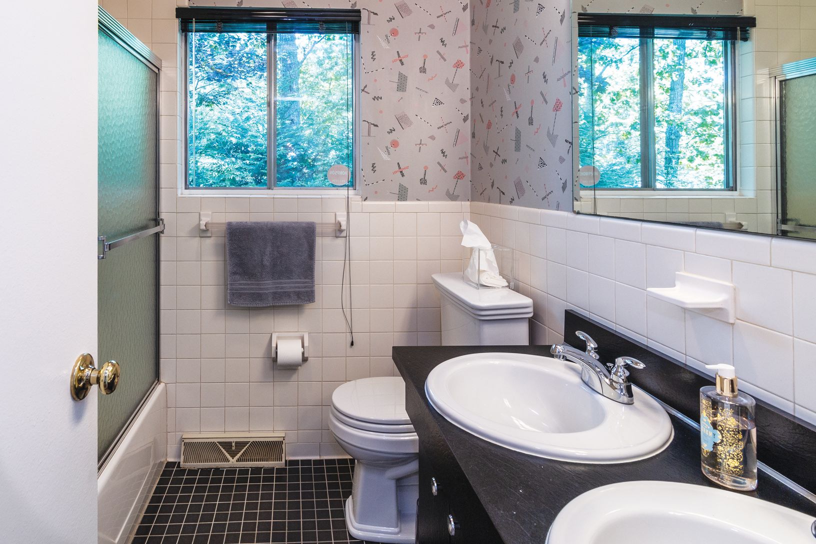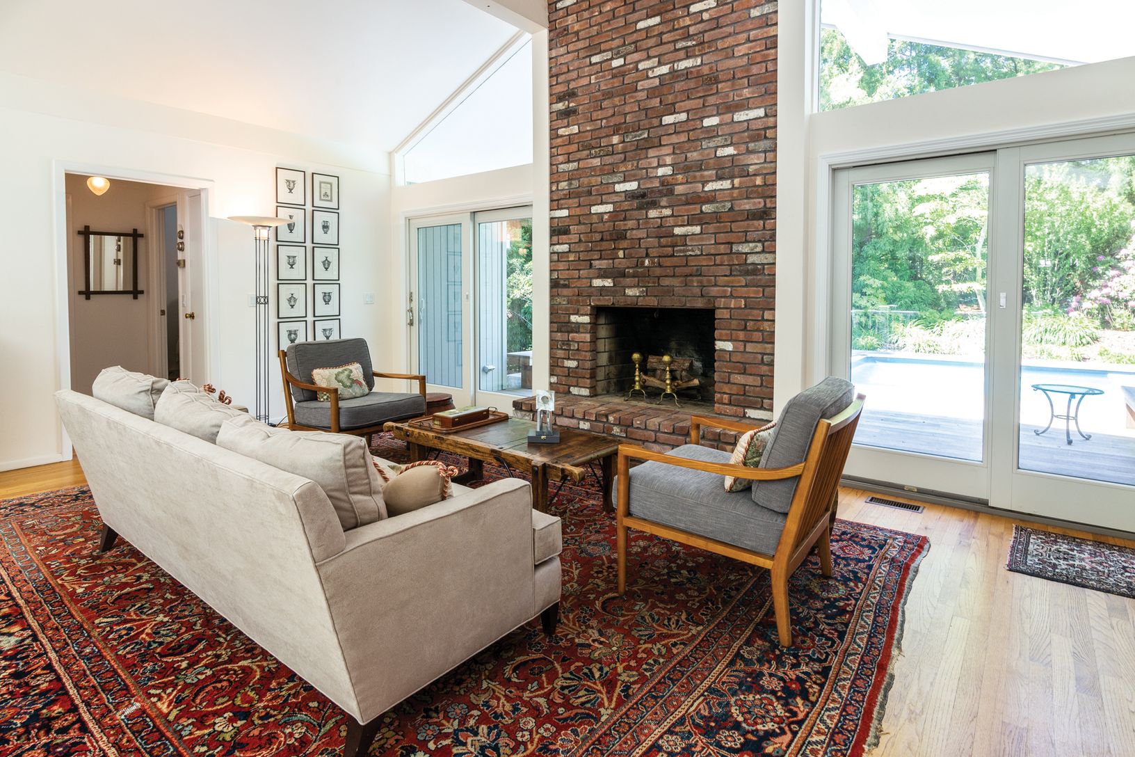 Cheery & Bright, Mid-Century Modern Beach House with mature grounds and gardens, sited on .64+/- of an acre in the waterfront community of Settlers Landing. Curb appeal abounds, from the Belgium block & gravel driveway, gracious rolling lawn, variety of evergreen plantings, and stone stoop. Inside we find a crisp & clean kitchen and living area with an open plan, vaulted ceilings, great natural light, a floor to ceiling wood burn