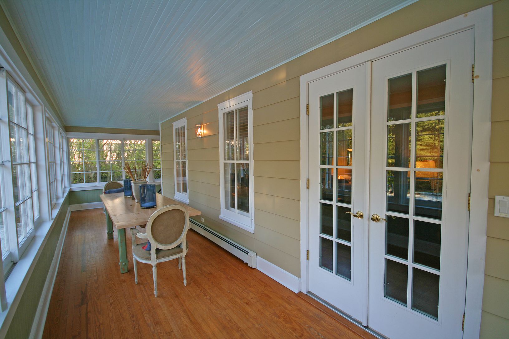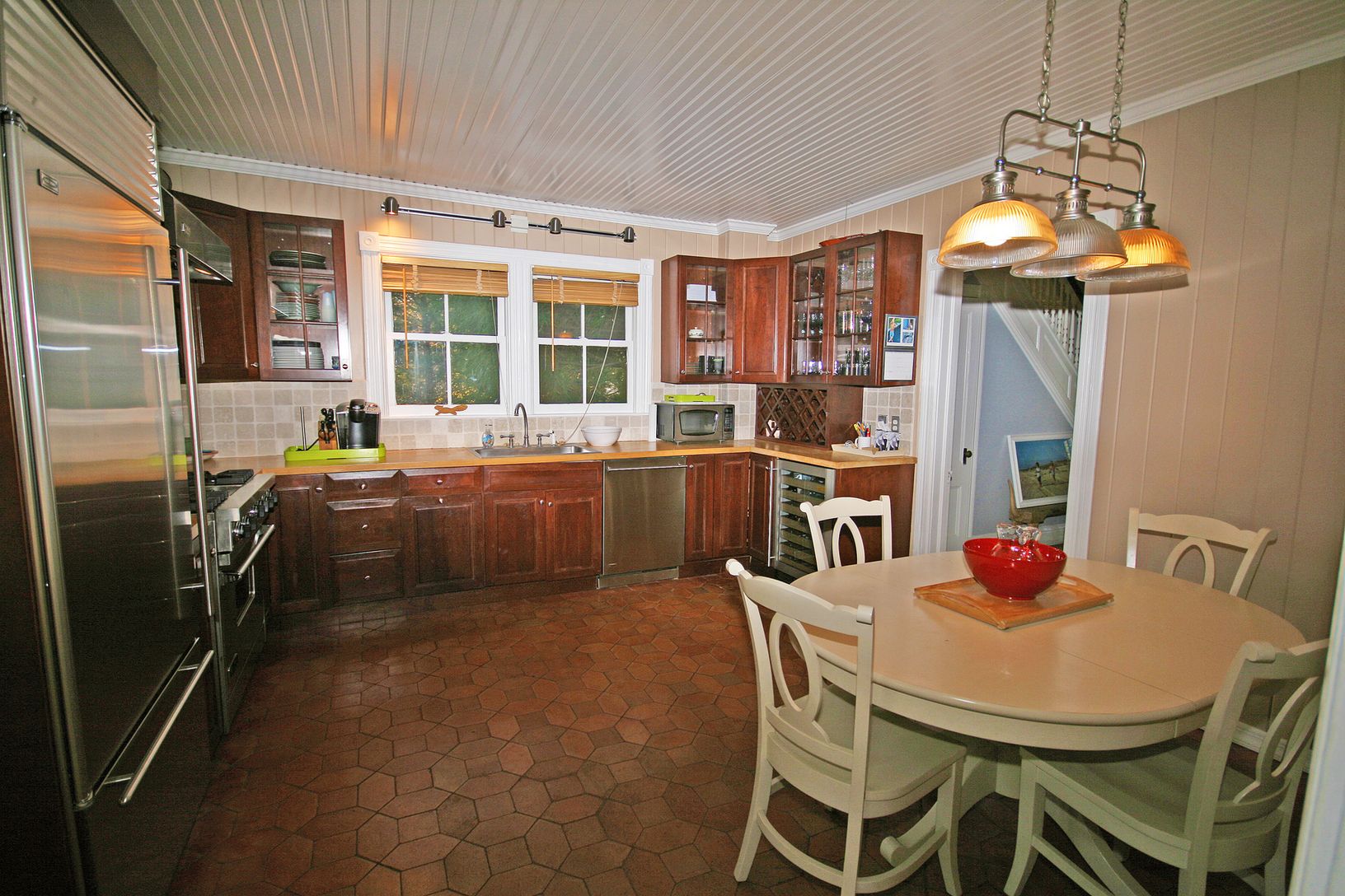 High hedges on this corner half-acre lot open to this classic colonial-style, shingle-sided home that is easy distances to ocean beaches and the Village center. Two driveways access the property with large front gravel parking area and enclosed, wraparound porch. With traditional wood floors, wainscoting and molding, enter the living/sitting room that leads through French doors to the family/dining room with bay window and fireplace. The dine-