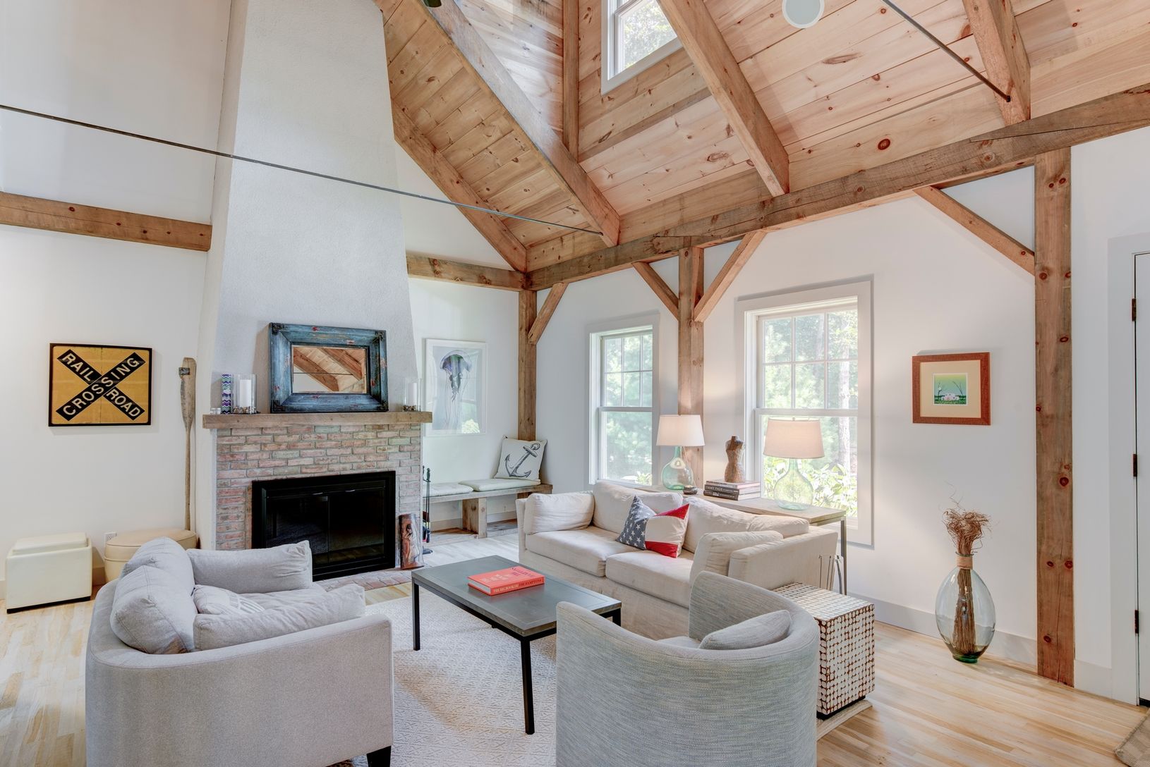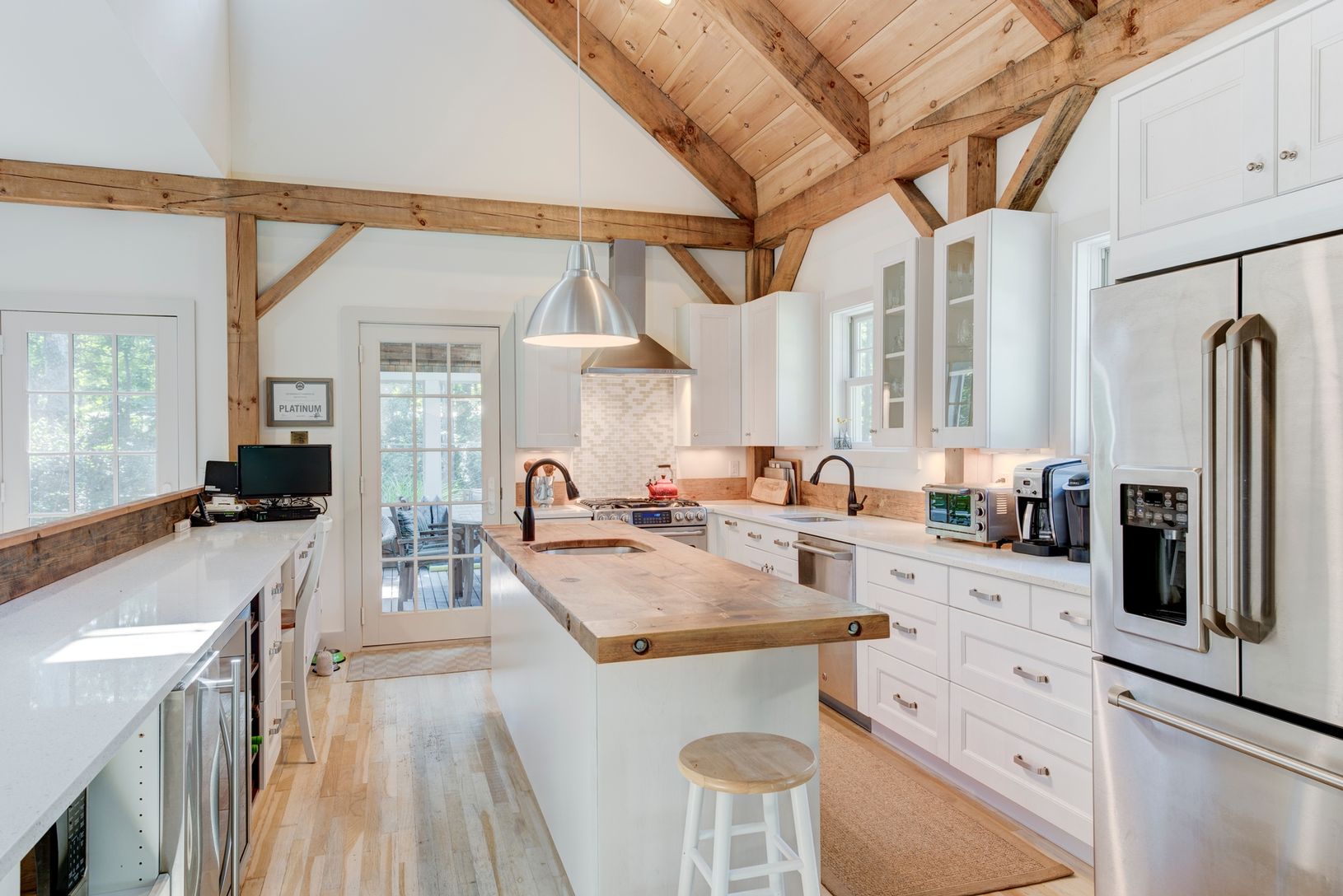 This LEED certified custom house has a Hampton's barn feel with a double height living room and fireplace, open kitchen with lots of counter space and adjacent screened in porch, dining area full of light, den with fireplace, one bedroom, full bath, laundry room, and master suite complete the first floor. The second floor includes two bedrooms each with their own baths separated by a catwalk. The back yard has a deck with pergola, dining patio