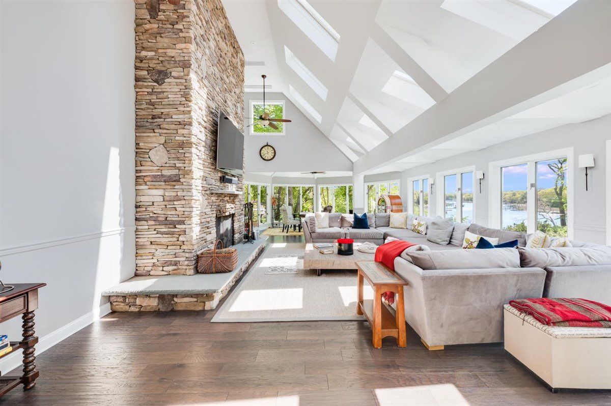 Luxurious waterfront Post Modern home on 3.5 acres with a floating dock and heated gunite pool. Private creekfront location features 6 bedrooms, 7 bathrooms, expansive great room with cathedral ceilings and fireplace surrounded with sliding glass doors, large windows, and skylights. Newly renovated throughout gourmet kitchen, designer lighting and high end finishes.