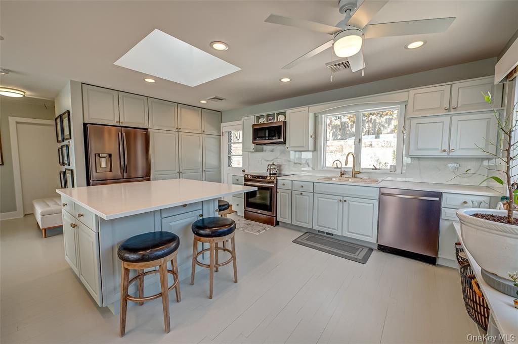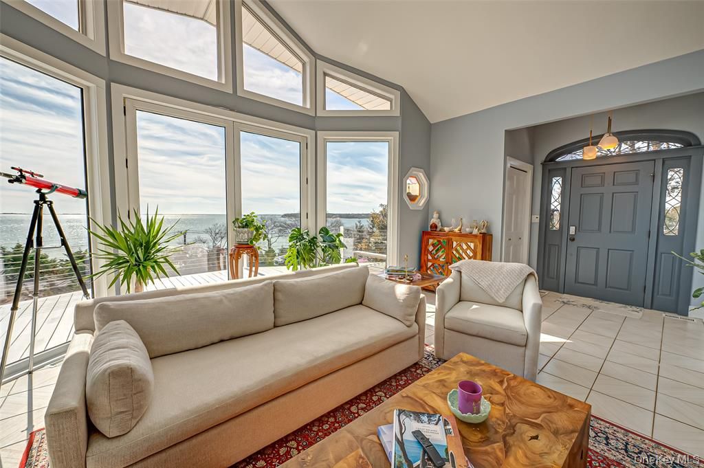 Experience waterfront living at its finest in this Hampton Bays retreat, perfectly positioned to capture sweeping views of Shinnecock Bay. Bathed in natural light, the home features an airy open floor plan with 9-foot glass doors that lead to a spacious deck overlooking truly breathtaking vistas. The living room’s vaulted ceilings and fireplace create a warm, inviting atmosphere, while the formal dining room and generous kitchen—complete with