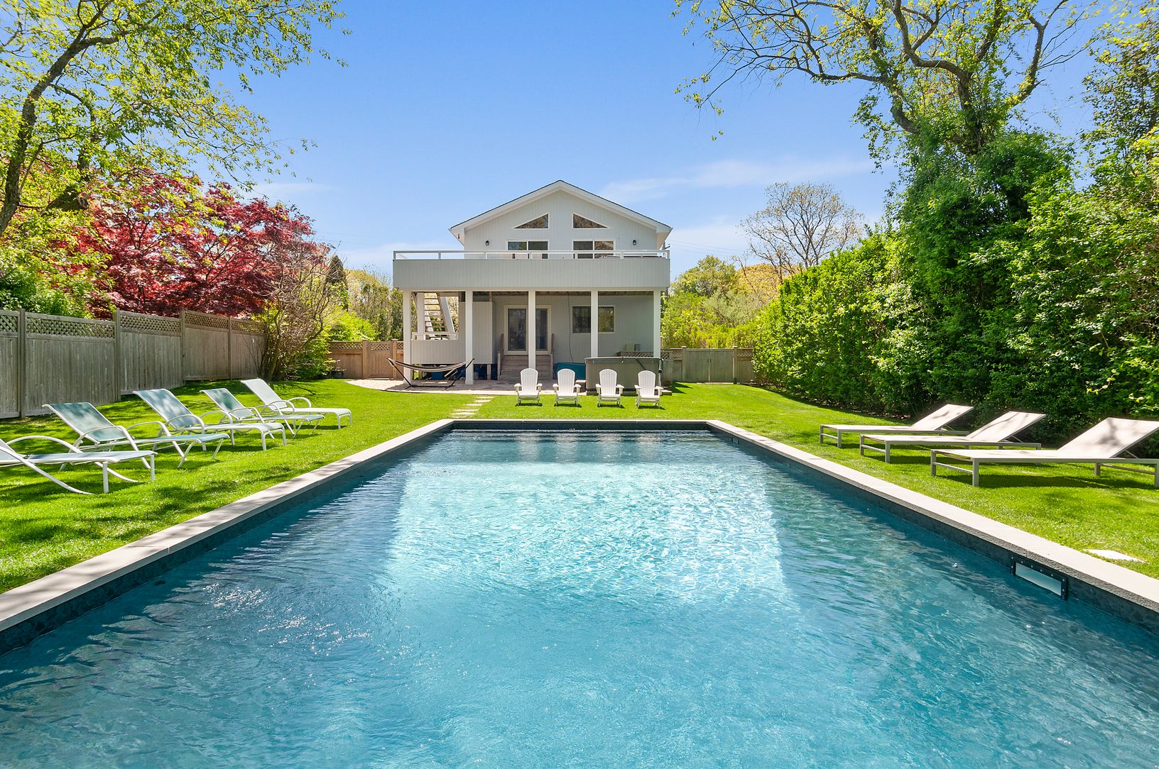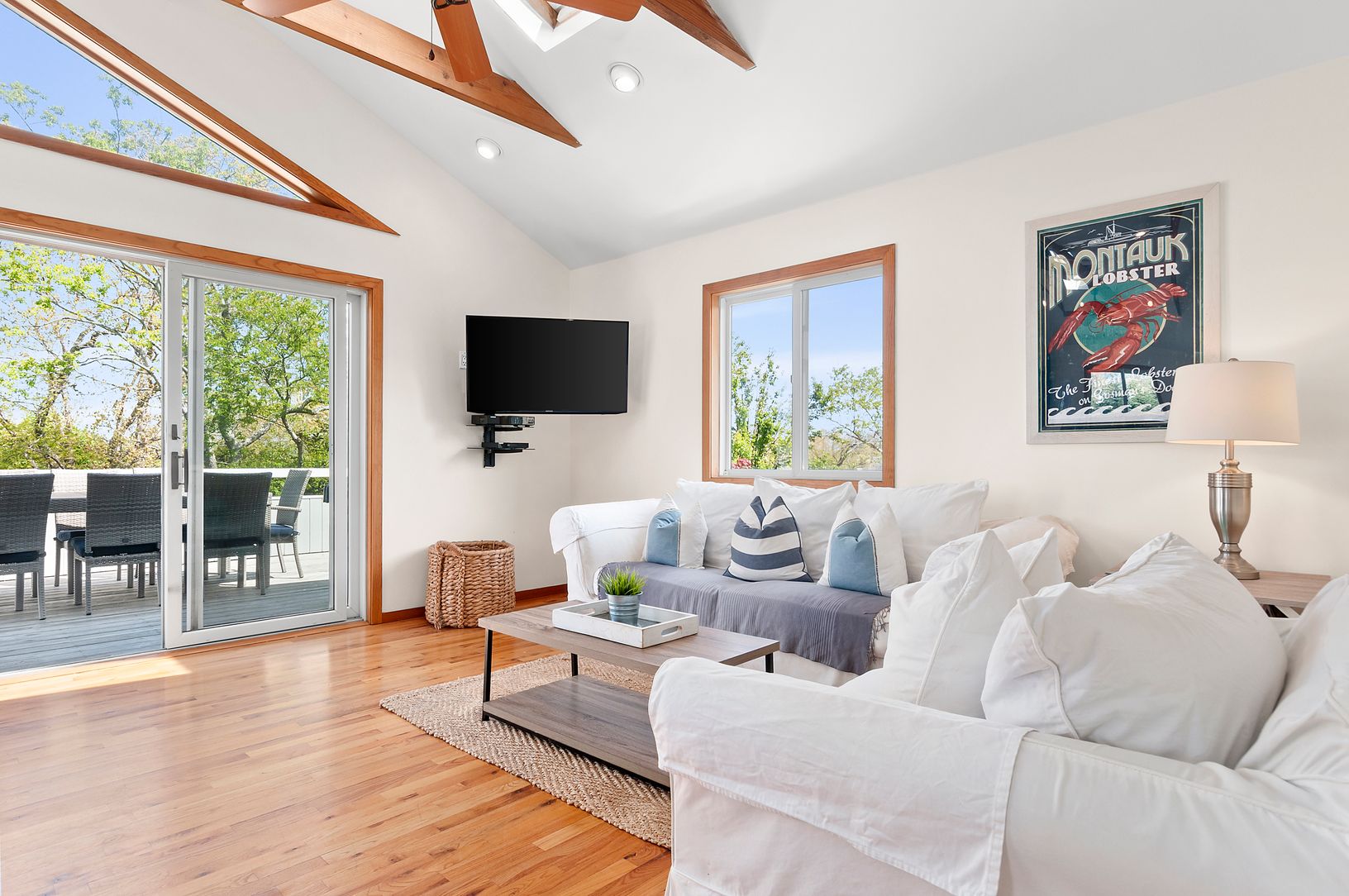 This 6 bedroom, 3 full bath home is located in the Montauk harbor area, close to bay beaches, shops, docks, fishing charters and restaurants. The home features two bedrooms on the top floor as well as a sun-filled cathedral ceiling living area with skylights that is open to the dining area and white peninsula island eat-in kitchen, with sliders leading to an expansive deck overlooking the 18x38 in-ground heated pool and hot tub. The first floo