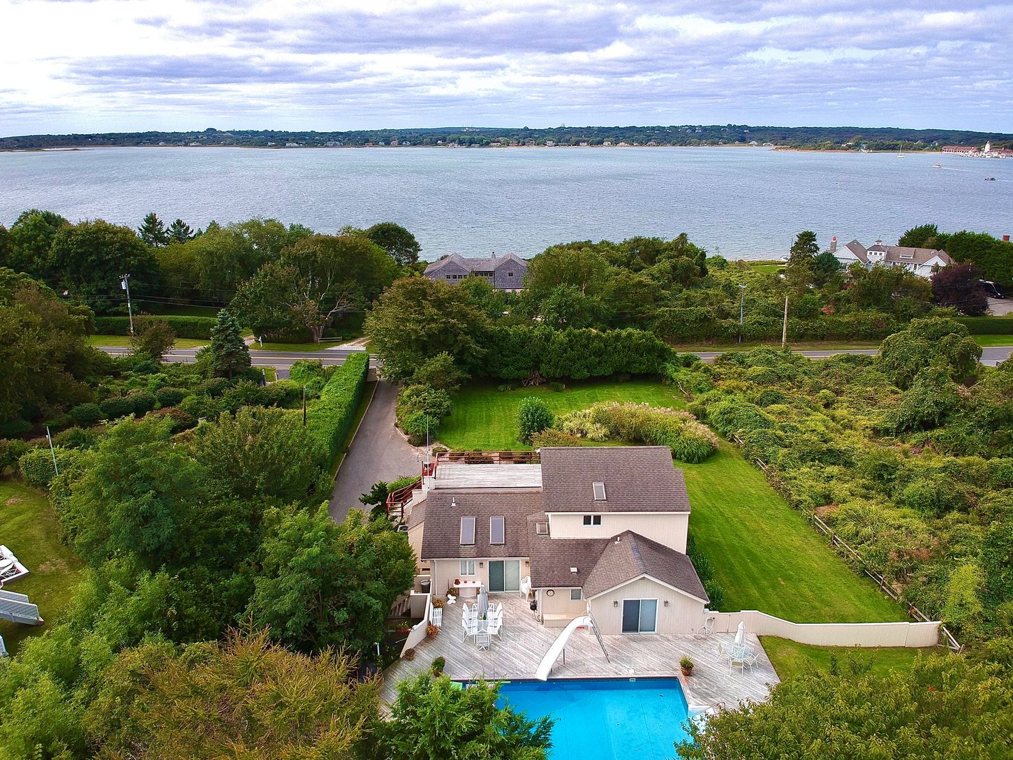 Charming and well maintained home on shy acre having four bedrooms (two are ensuite) 3 baths, open living with fireplace, kitchen and sliders leading out to private pool area and cascading waterfall for a truly serene setting. Master bedroom upstairs has its own bath, walk in closets and ample decking for beautiful water and sunset views of Lake Montauk. Rolling front lawn, CAC, basement and garage.