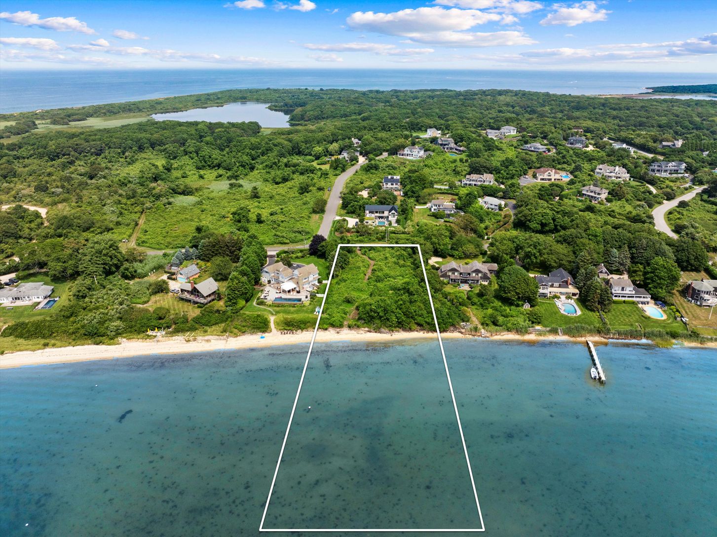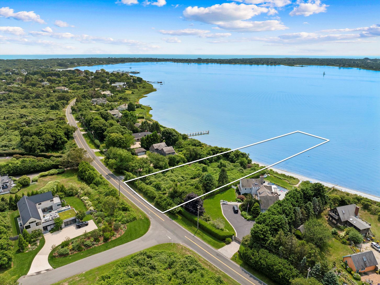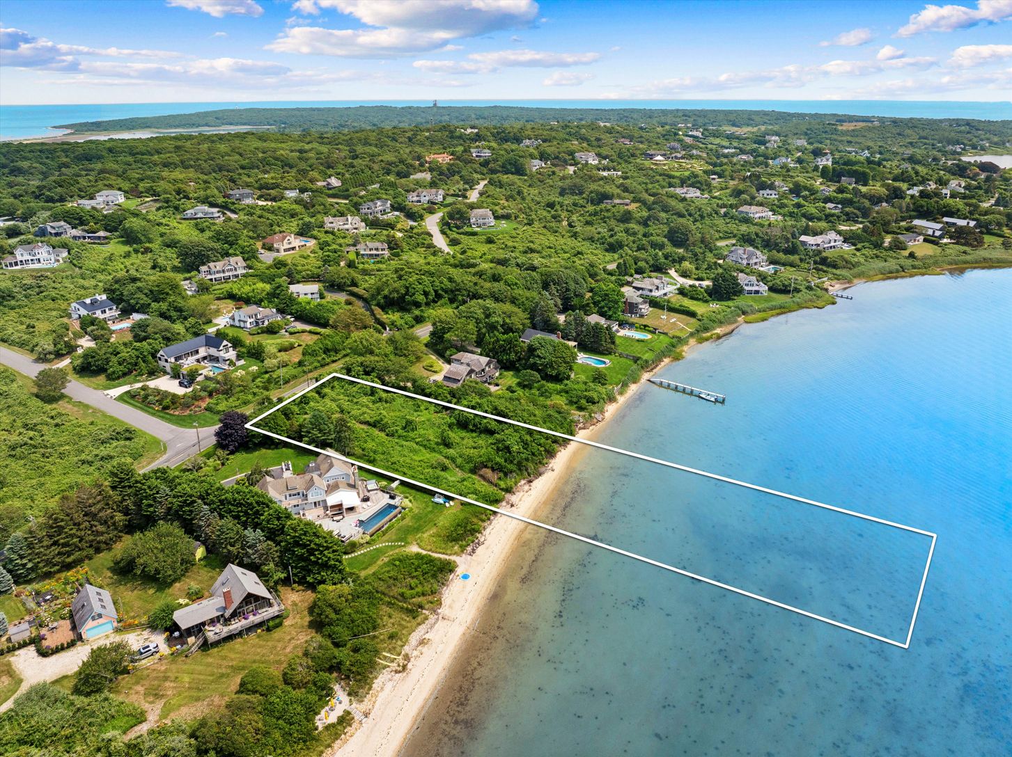 Located on a beautiful stretch of Lake Montauk where the views are wide and the beach is sandy, 329 East Lake Drive sets the bar for buildable lakefront land. The 0.87-acre upland portion of the property spans over 260 feet from the road, where elevation is highest, down to the water where 135 feet of shoreline forms a rare private sandy beach. The southwest-facing building envelope is well positioned to enjoy daily sunsets and summer breezes