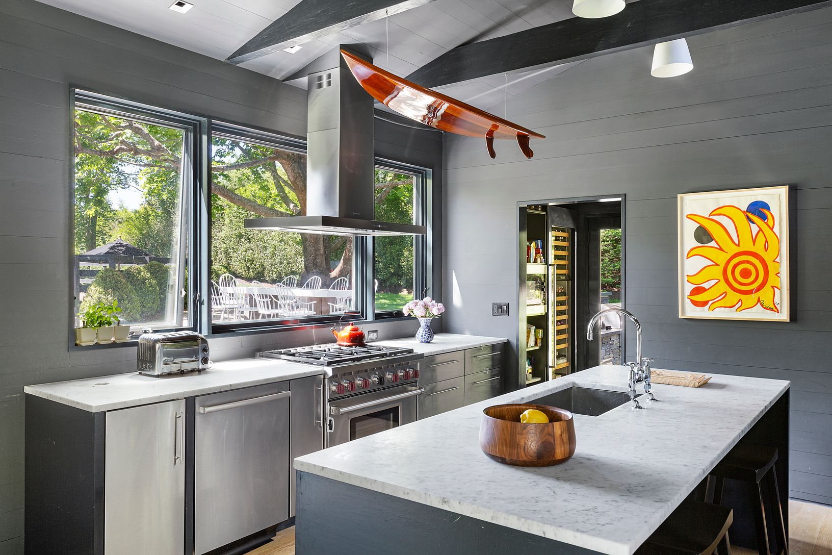 Originally built in the 60s as a studio for a famous artist, this stunning property was turned into a fabulous comoud by the current owner, a designer himself, when all the structures were connected. All five bedrooms and baths have a great layout and each was uniquely designed with a separate, special color scheme, wallpaper and spectacular tile-work. A full chef's kitchen with pantry and open dining area invites to a grand entertainment layo